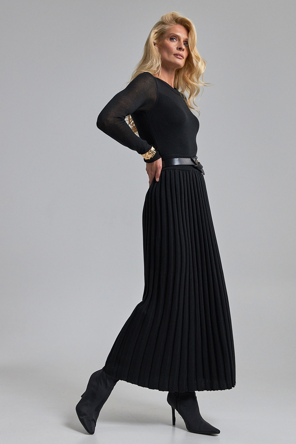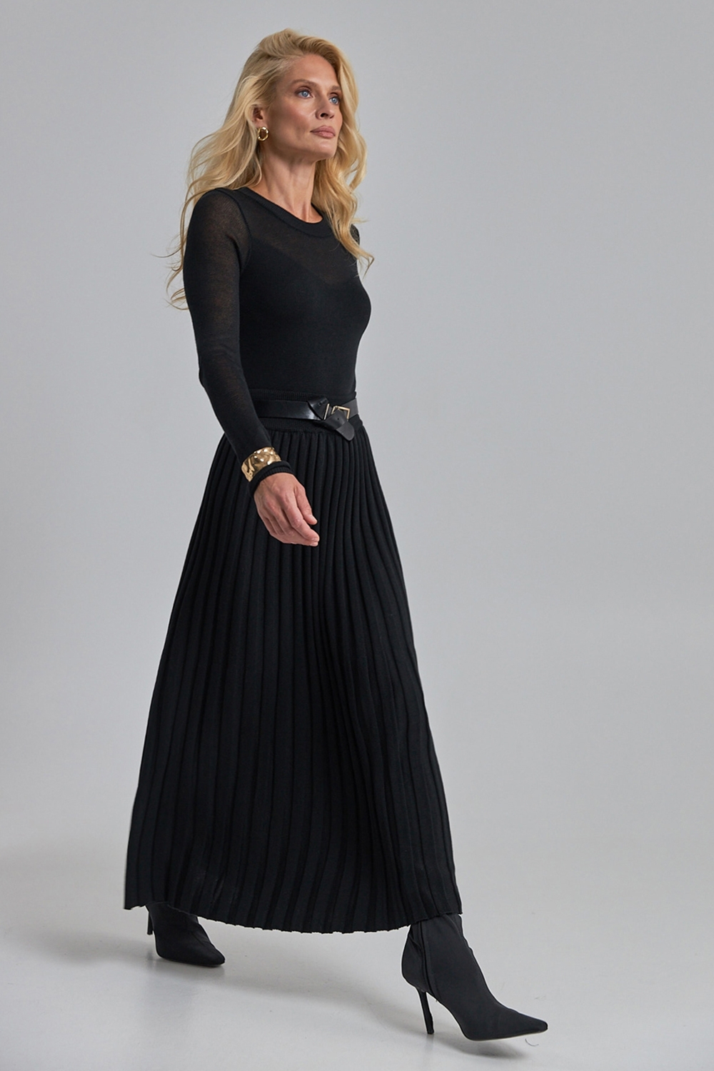 A-силует виробу створюється за рахунок складок пліссе. Талія підкреслена широким еластичним поясом.