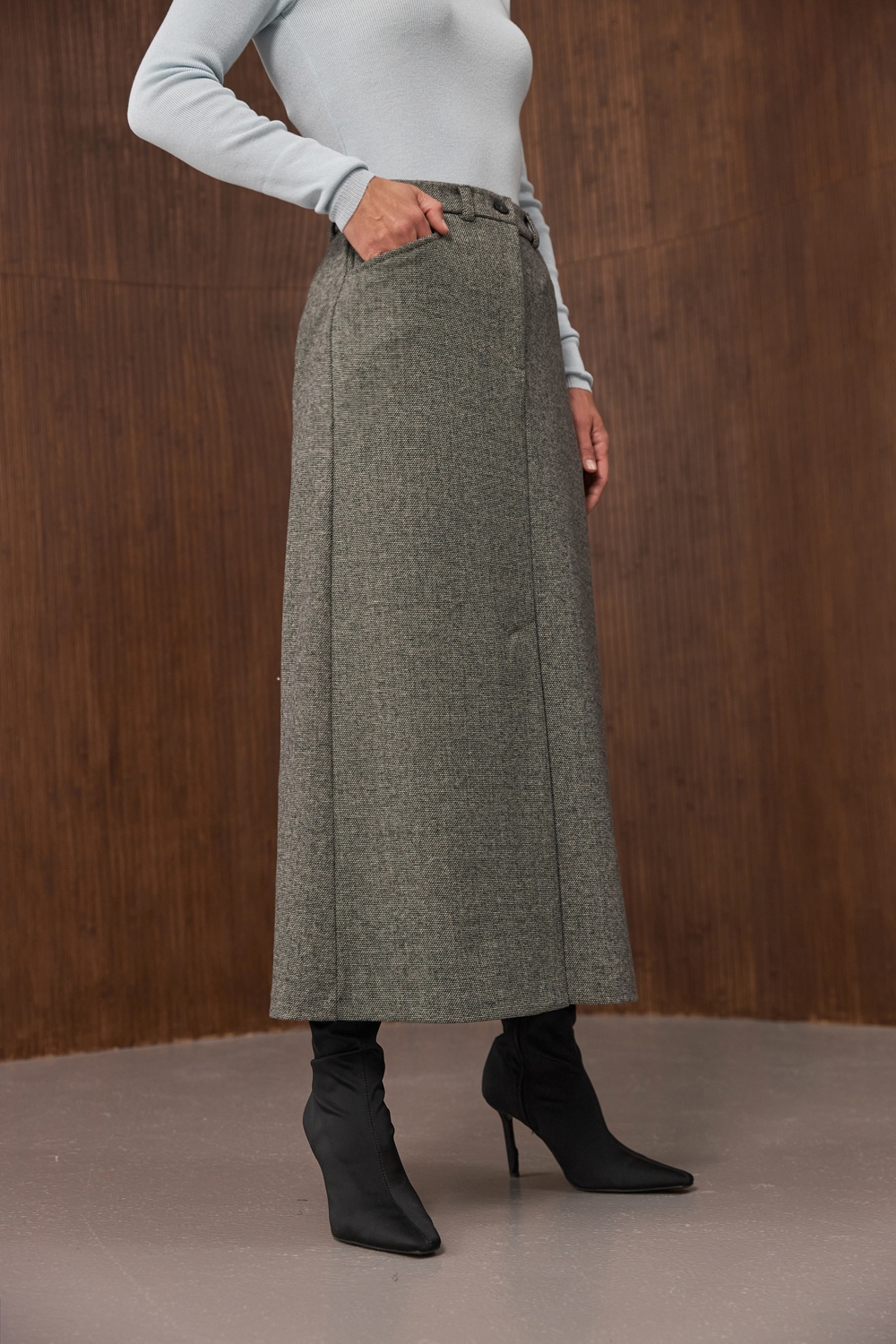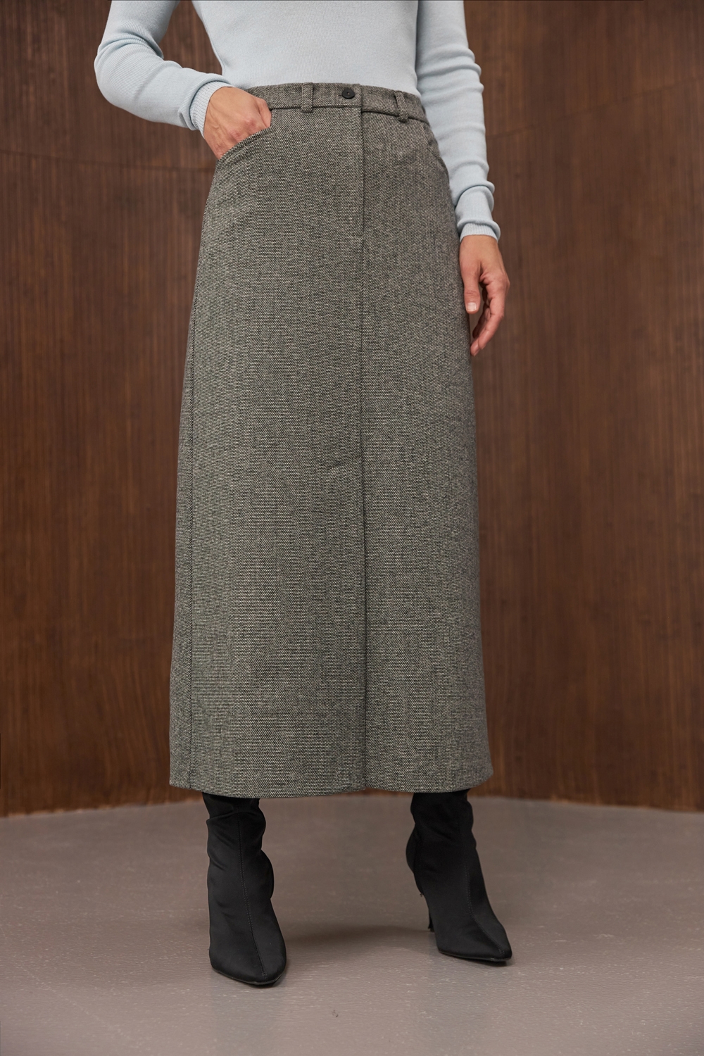 Тепла спідниця зі щільної, м’якої вовняної тканини з додаванням віскози. Модель має прямий класичний крій із шлицею спереду.