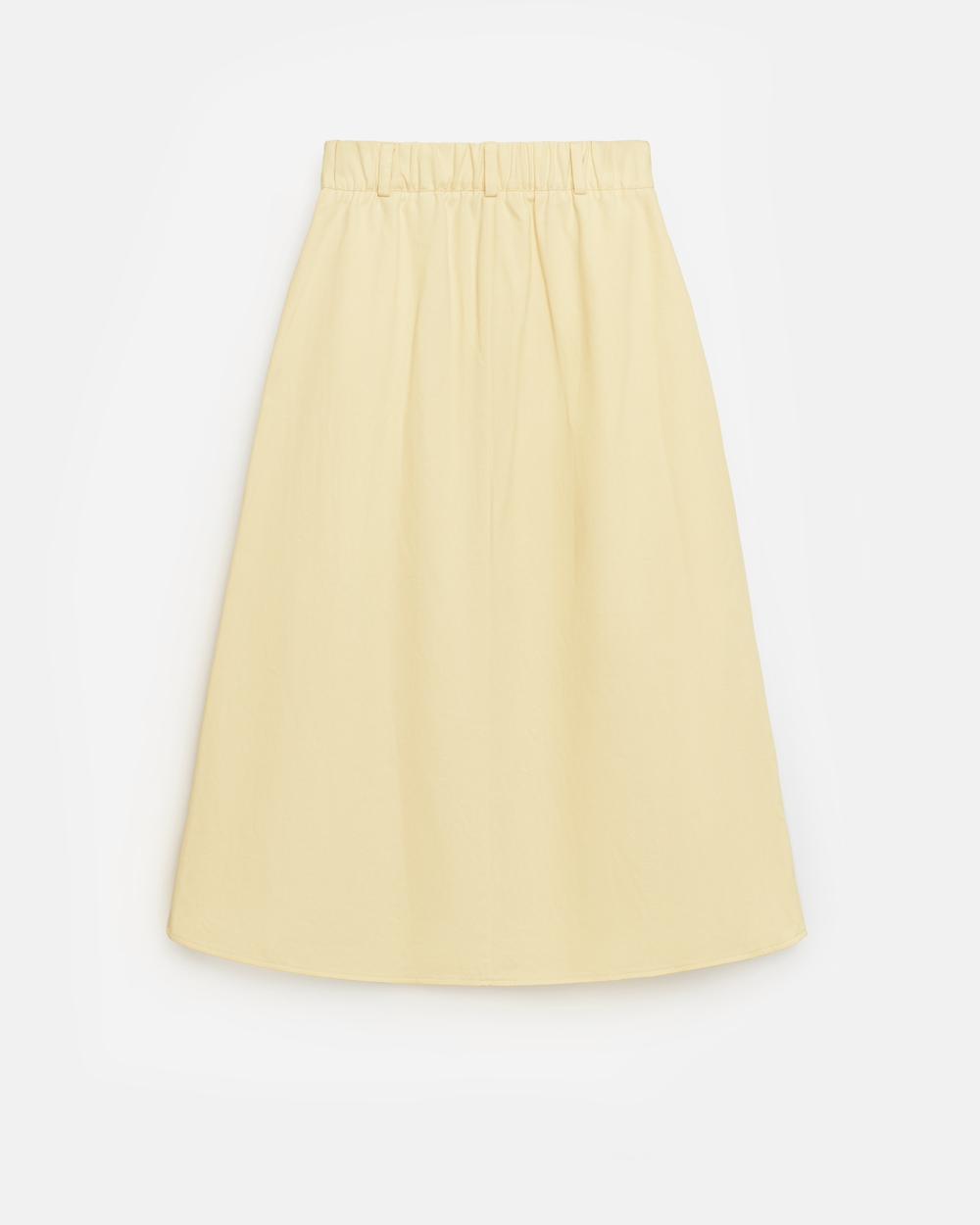 Трендова спідниця з щільної бавовняної тканини, що гарно тримає форму. Модель середньої довжини, доповнена елегантними защіпами та функціональними кишенями. На поясі — комфортна еластична резинка. Застібка спереду — блискавка та гудзик.