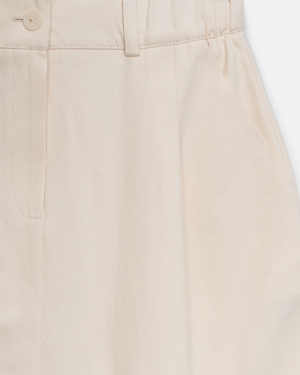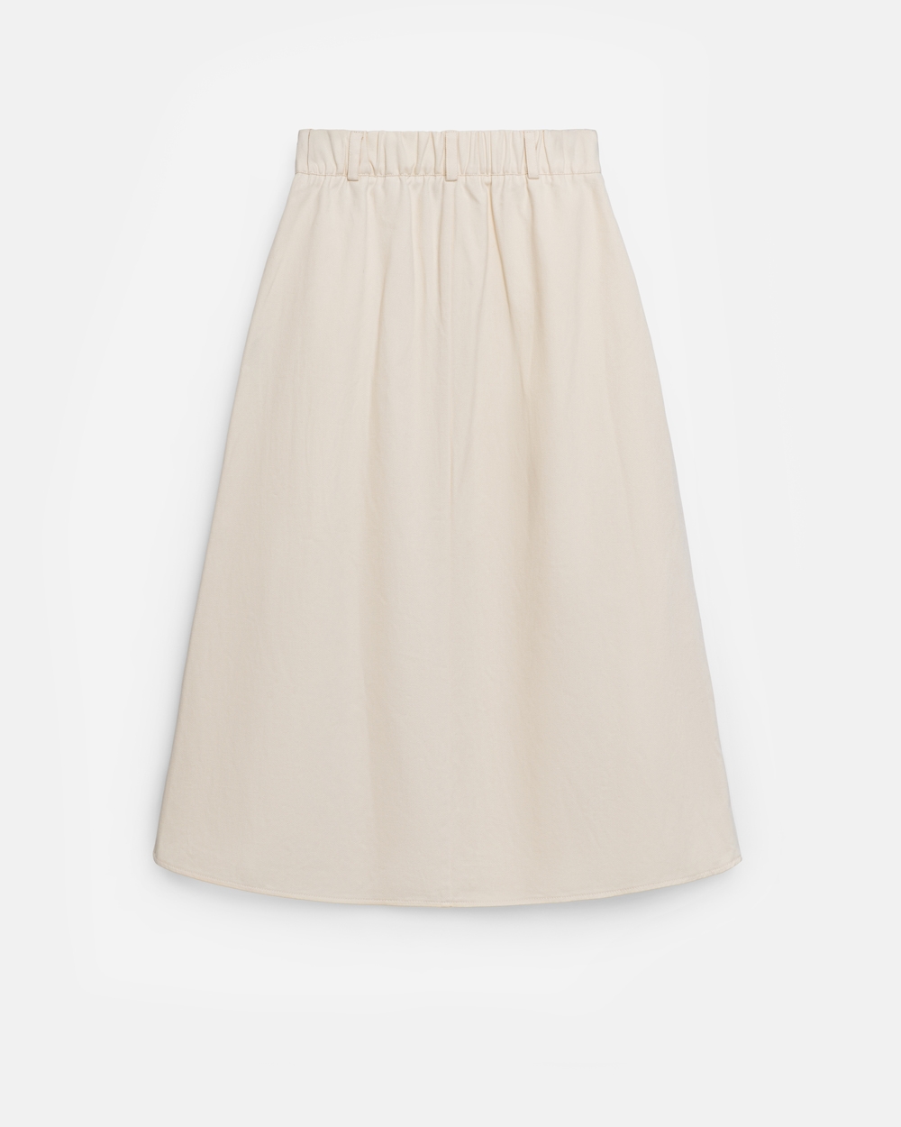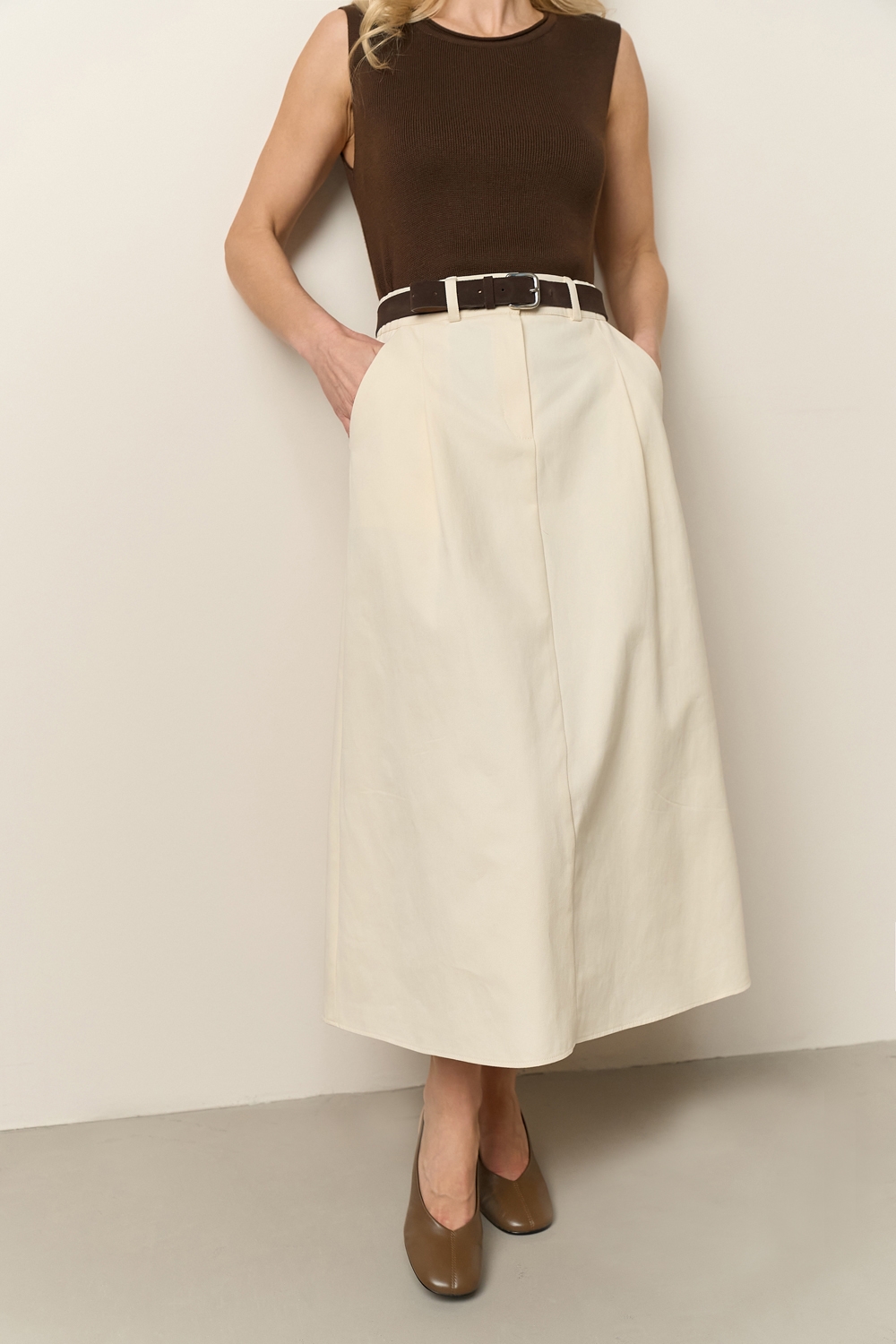 Трендова спідниця з щільної бавовняної тканини, що гарно тримає форму. Модель середньої довжини, доповнена елегантними защіпами та функціональними кишенями. На поясі — комфортна еластична резинка. Застібка спереду — блискавка та гудзик.
