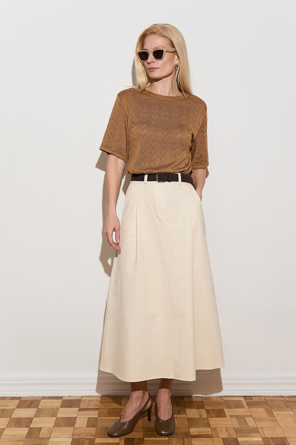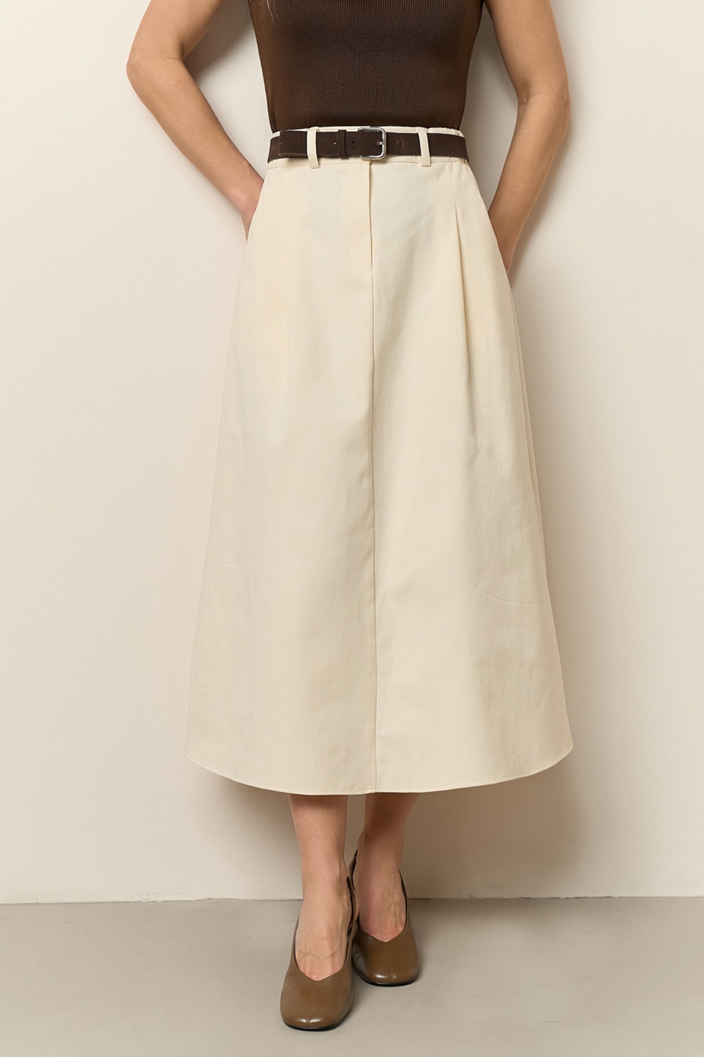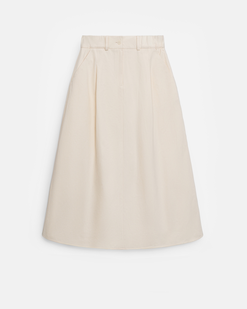 Трендова спідниця з щільної бавовняної тканини, що гарно тримає форму. Модель середньої довжини, доповнена елегантними защіпами та функціональними кишенями. На поясі — комфортна еластична резинка. Застібка спереду — блискавка та гудзик.