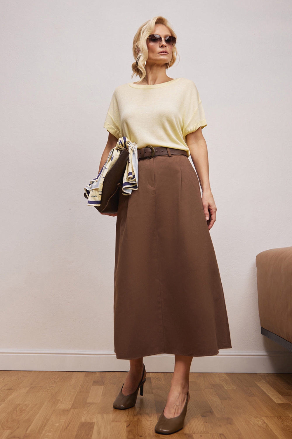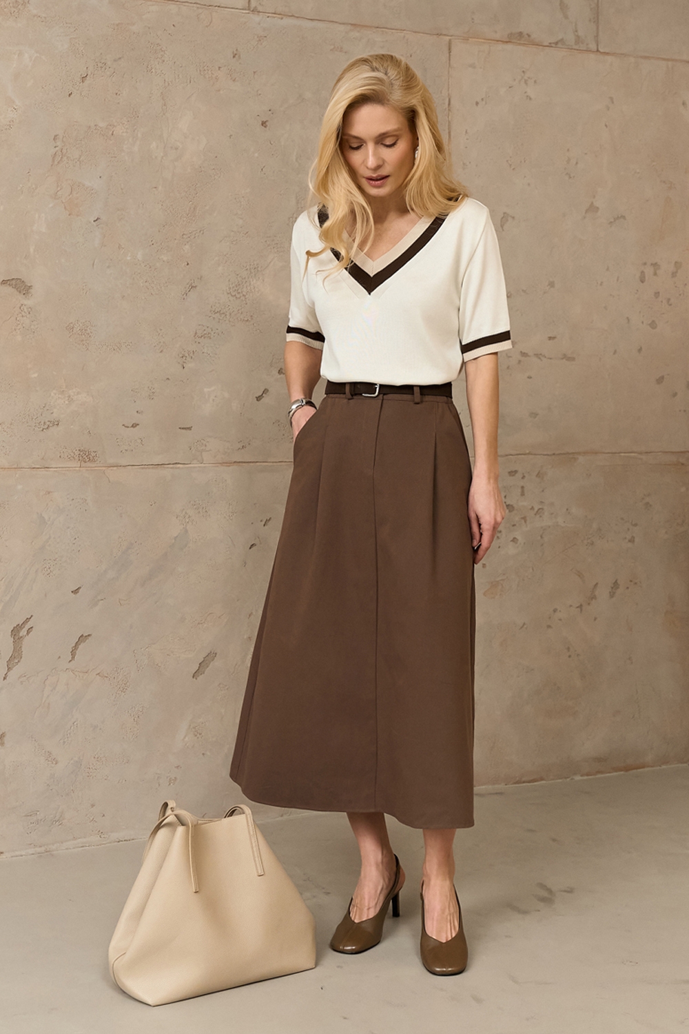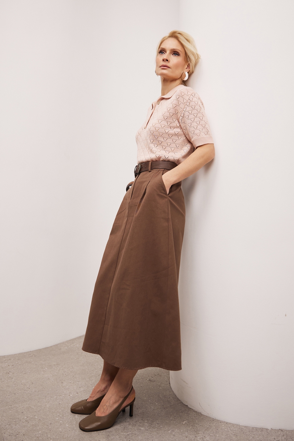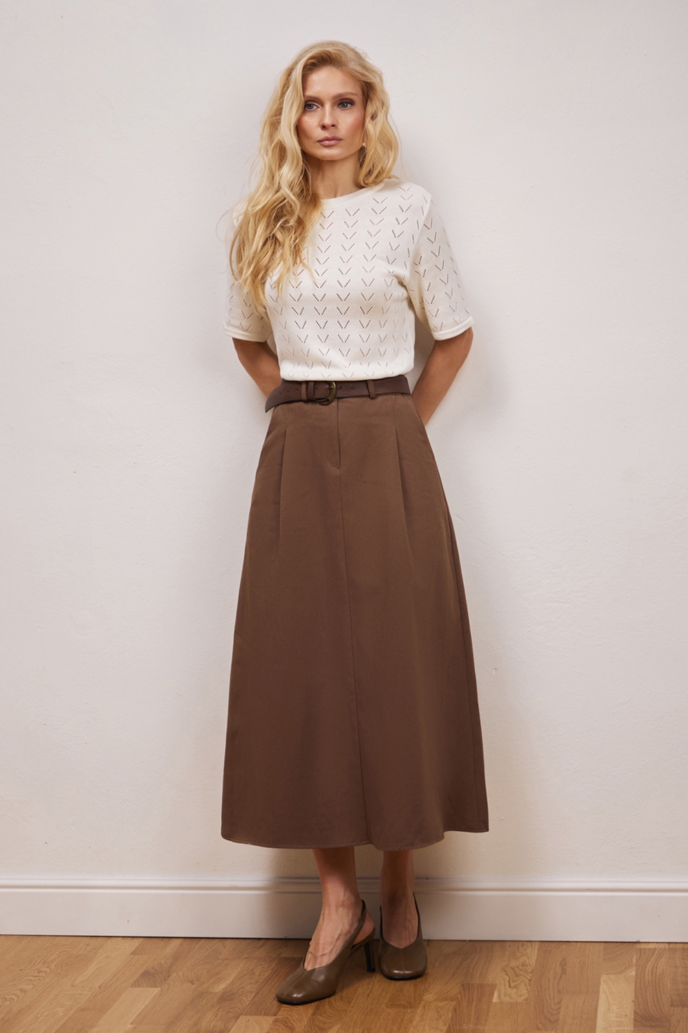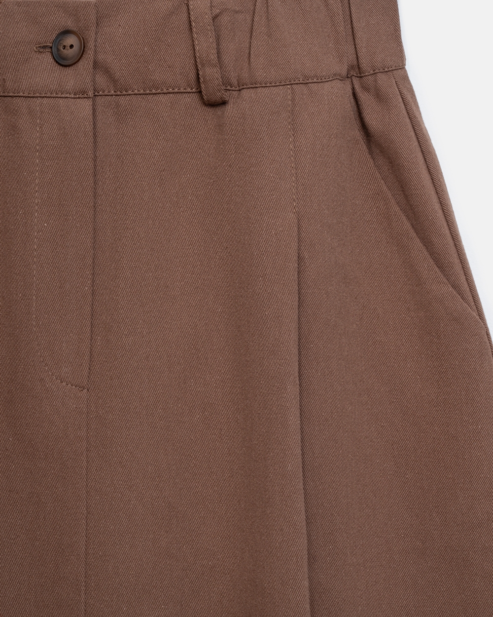 Трендова спідниця з щільної бавовняної тканини, що гарно тримає форму. Модель середньої довжини, доповнена елегантними защіпами та функціональними кишенями. На поясі — комфортна еластична резинка. Застібка спереду — блискавка та гудзик.