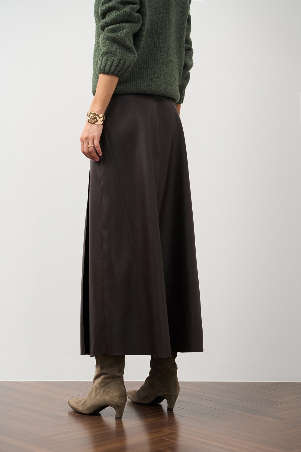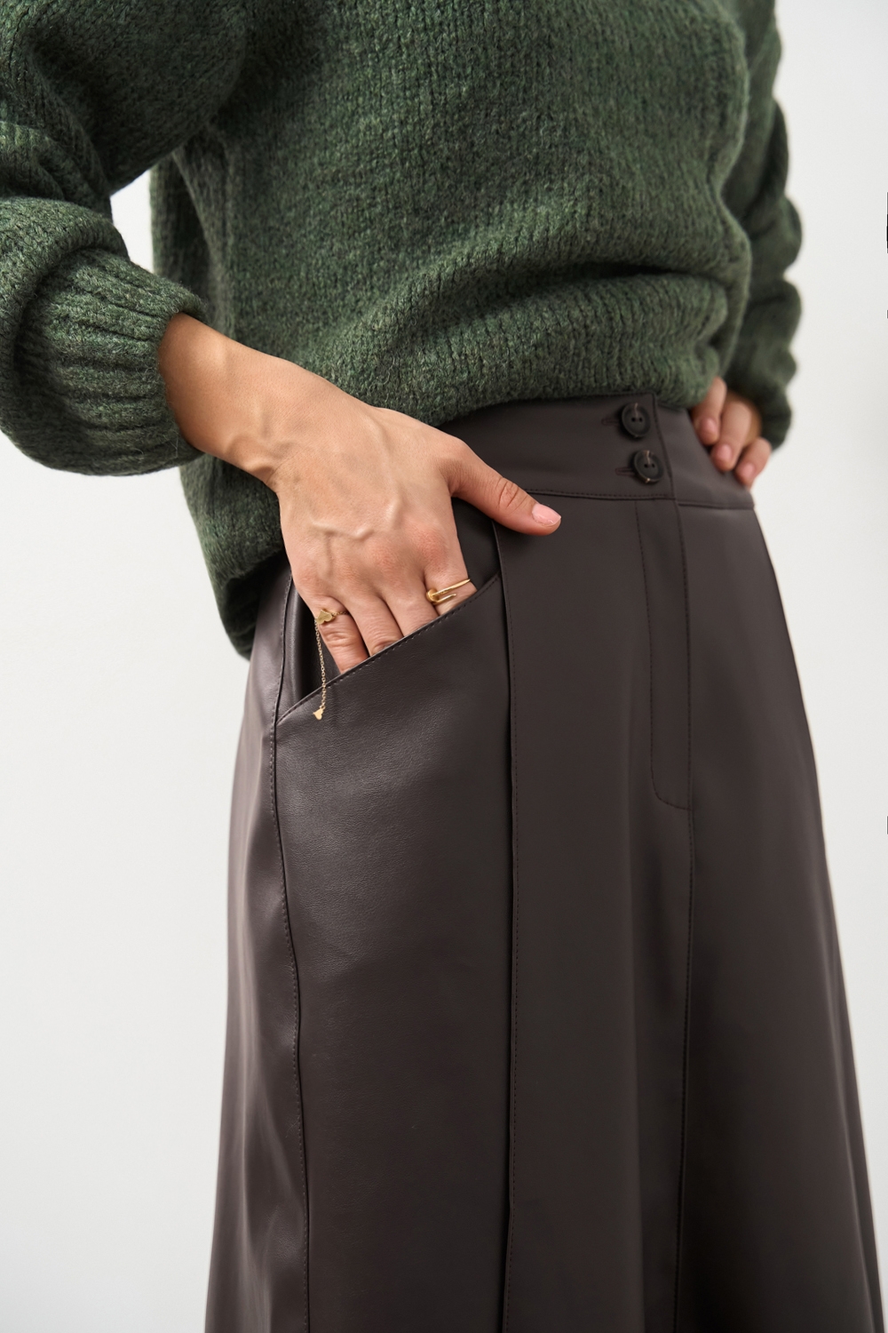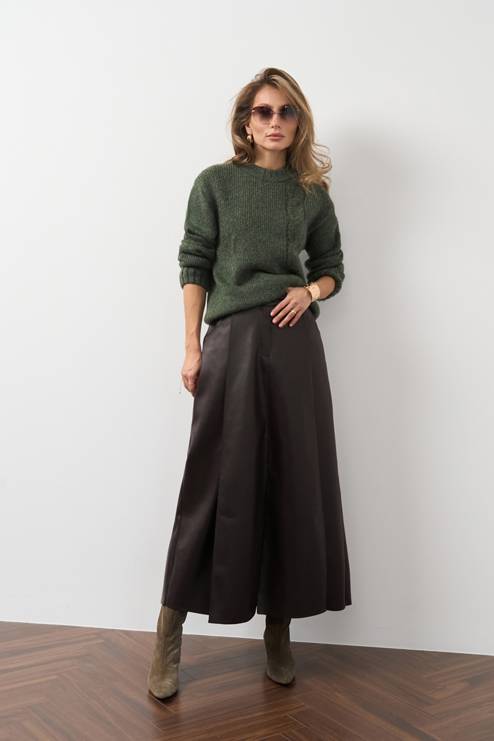Спідниця з еко-шкіри А-силуету середньої довжини. Попереду спідниця оздоблена двома кишенями та акуратними складками. Застібка - блискавка та ґудзик.