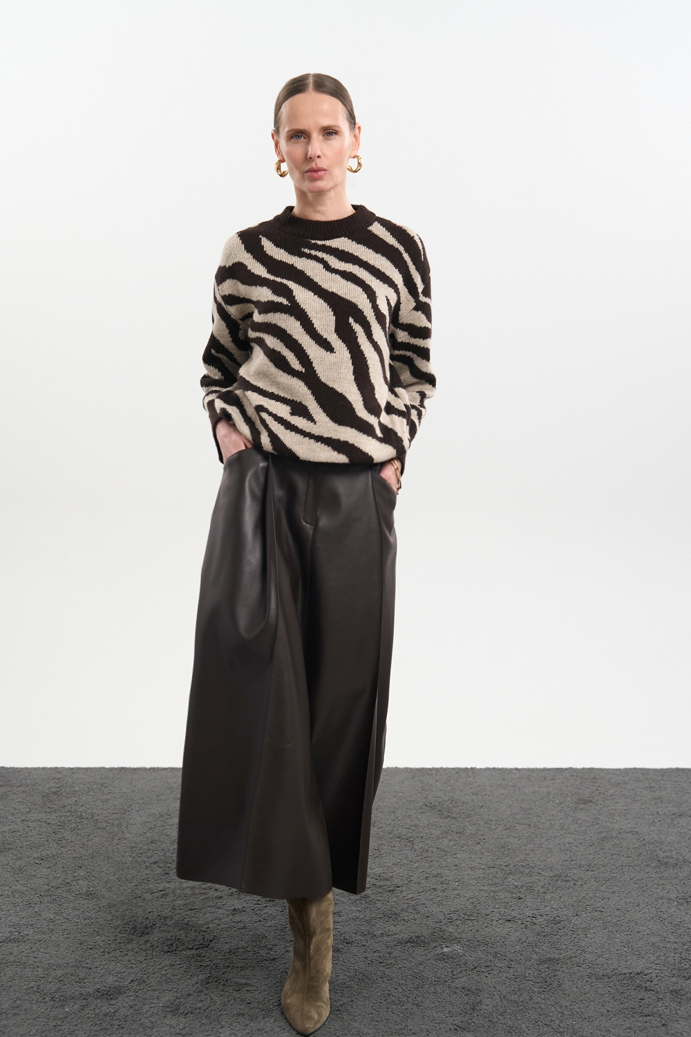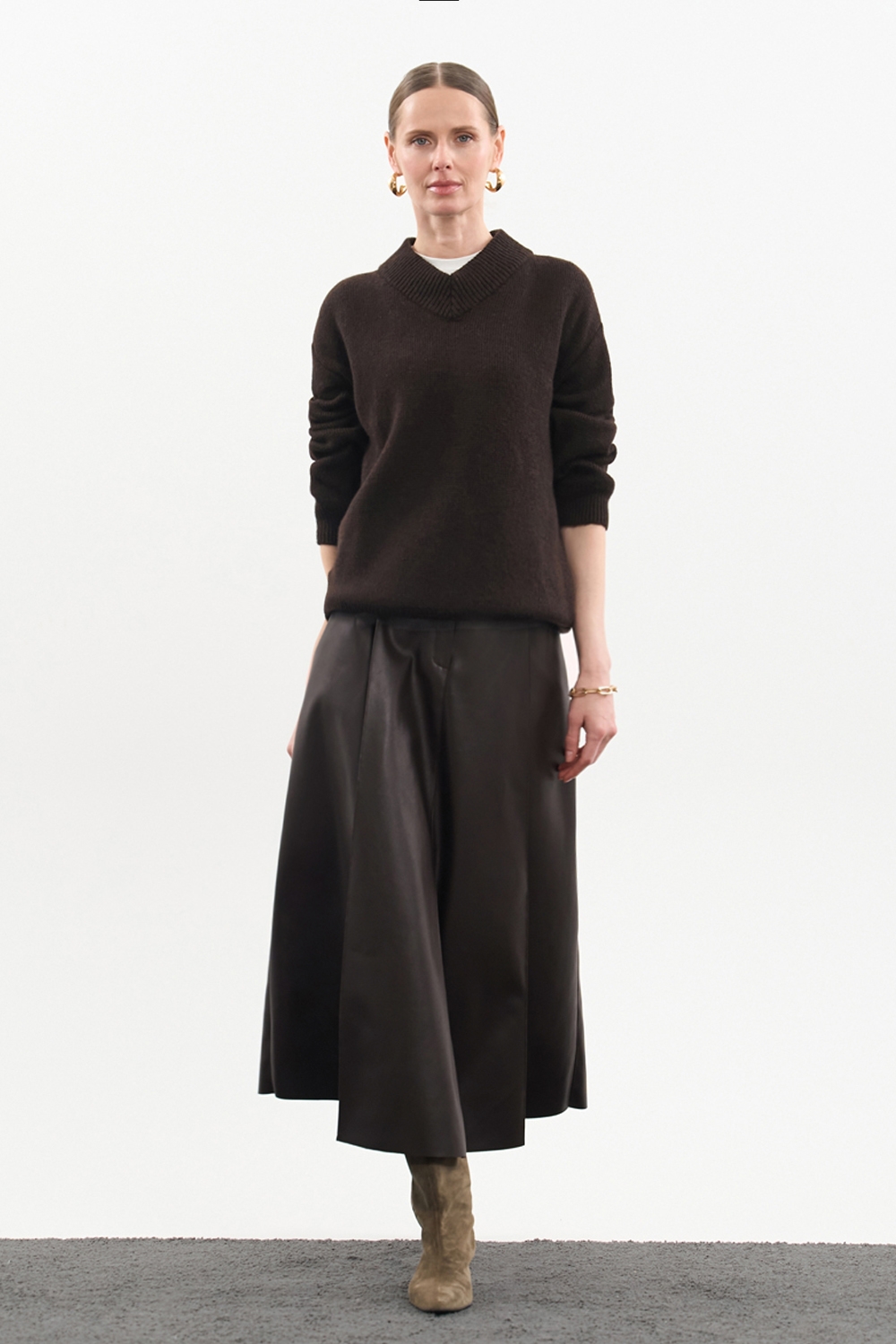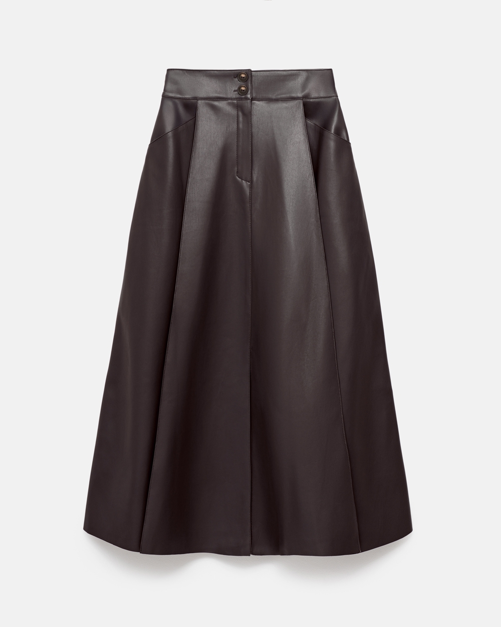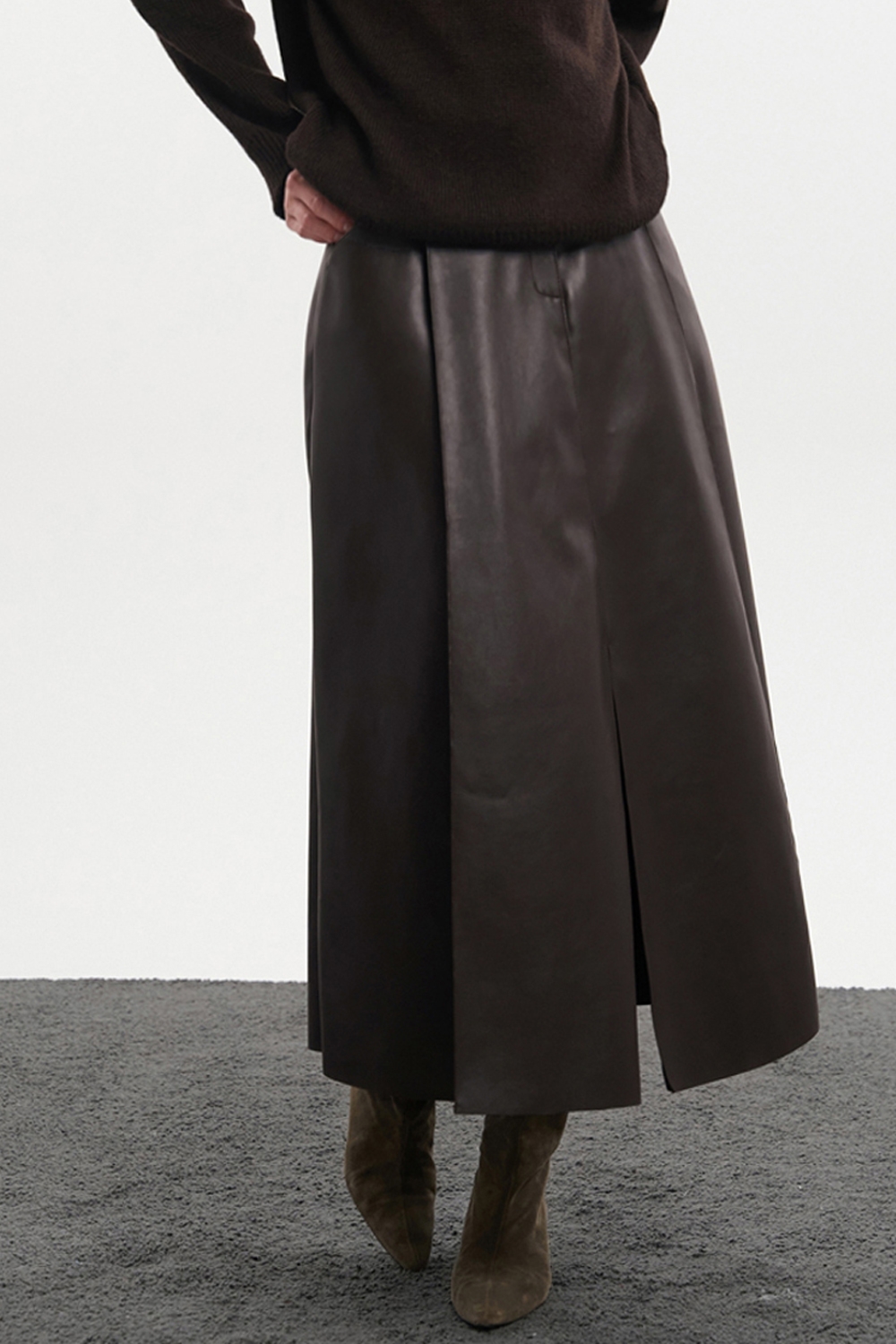 Спідниця з еко-шкіри А-силуету середньої довжини. Попереду спідниця оздоблена двома кишенями та акуратними складками. Застібка - блискавка та ґудзик.
