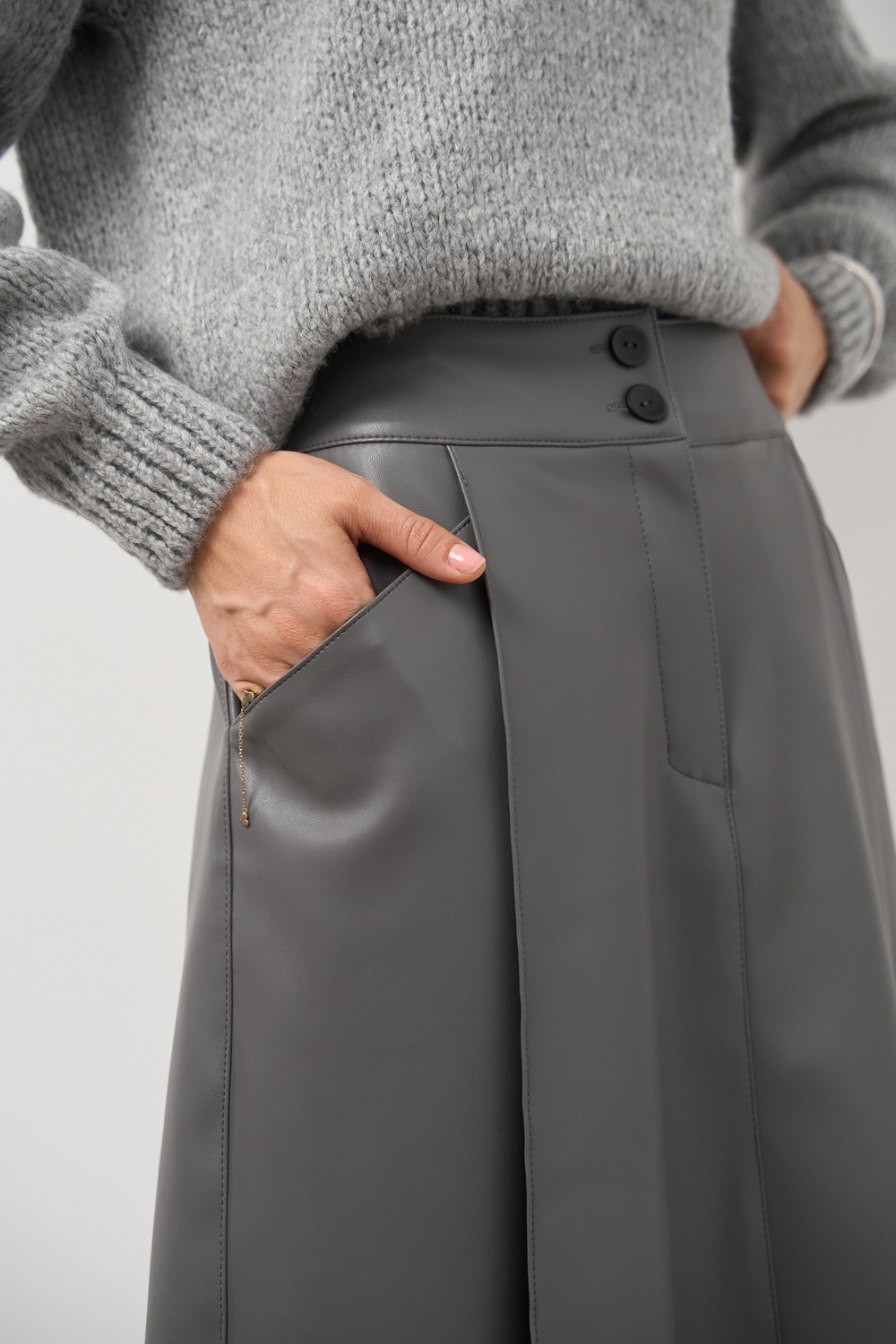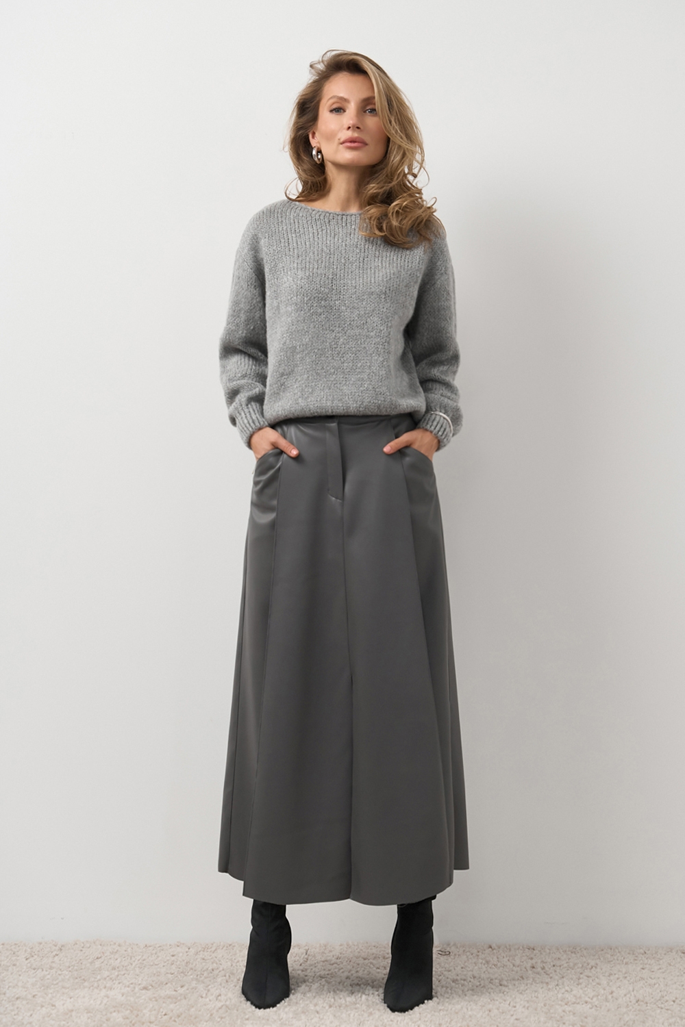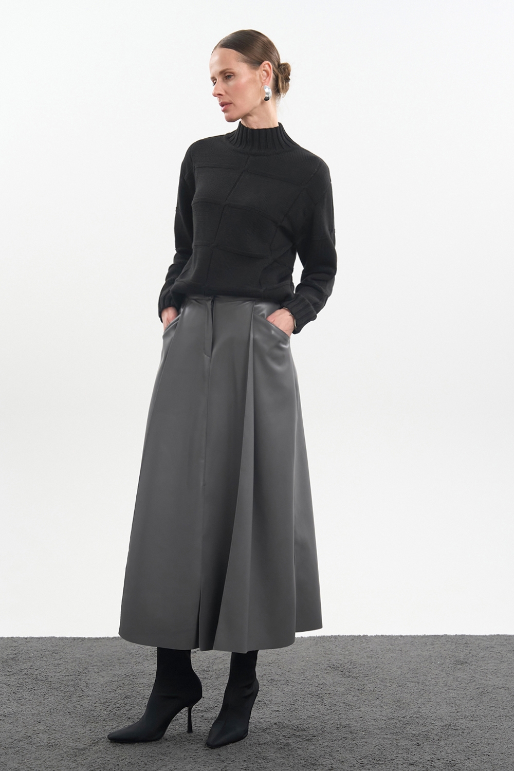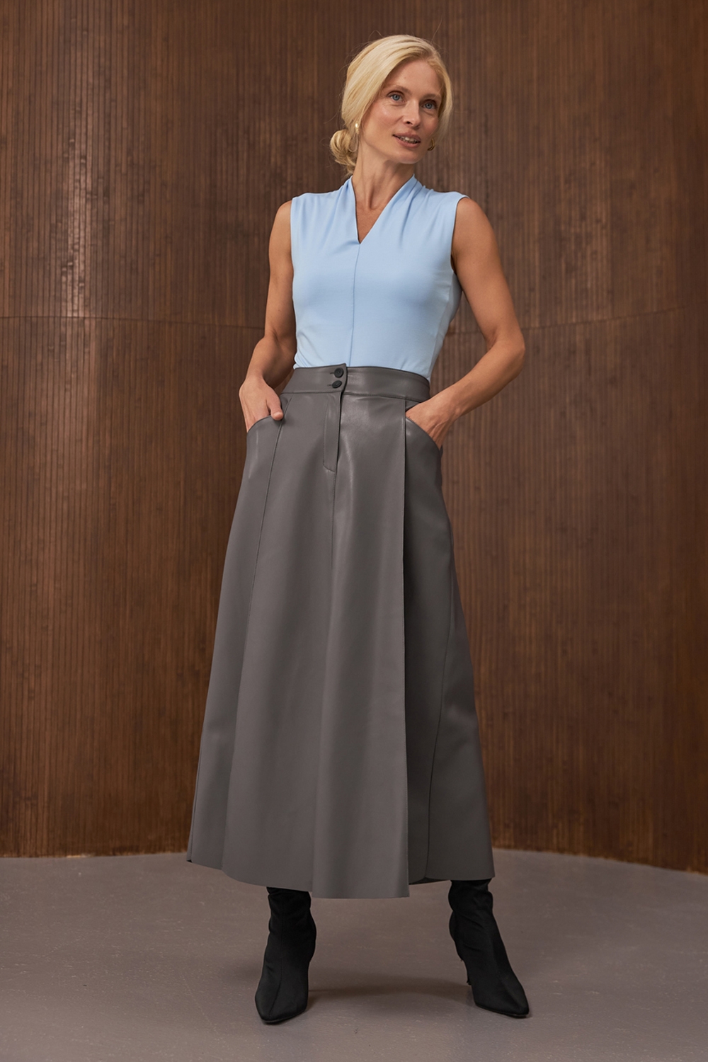 Спідниця з еко-шкіри А-силуету середньої довжини. Попереду спідниця оздоблена двома кишенями та акуратними складками. Застібка - блискавка та ґудзик.
