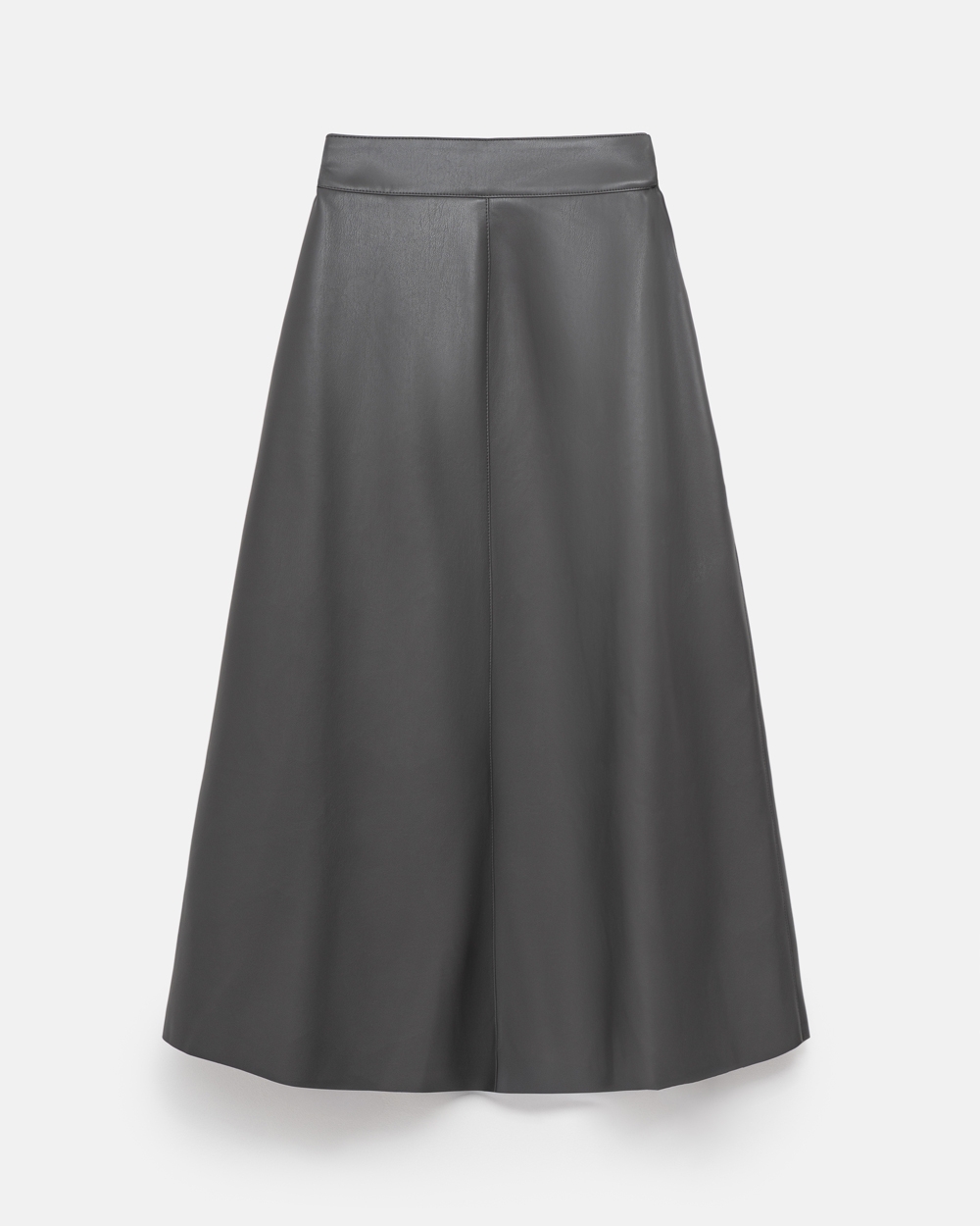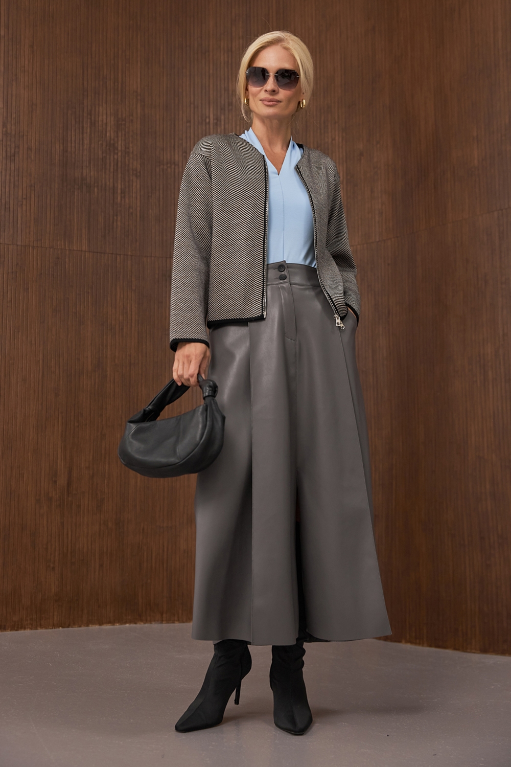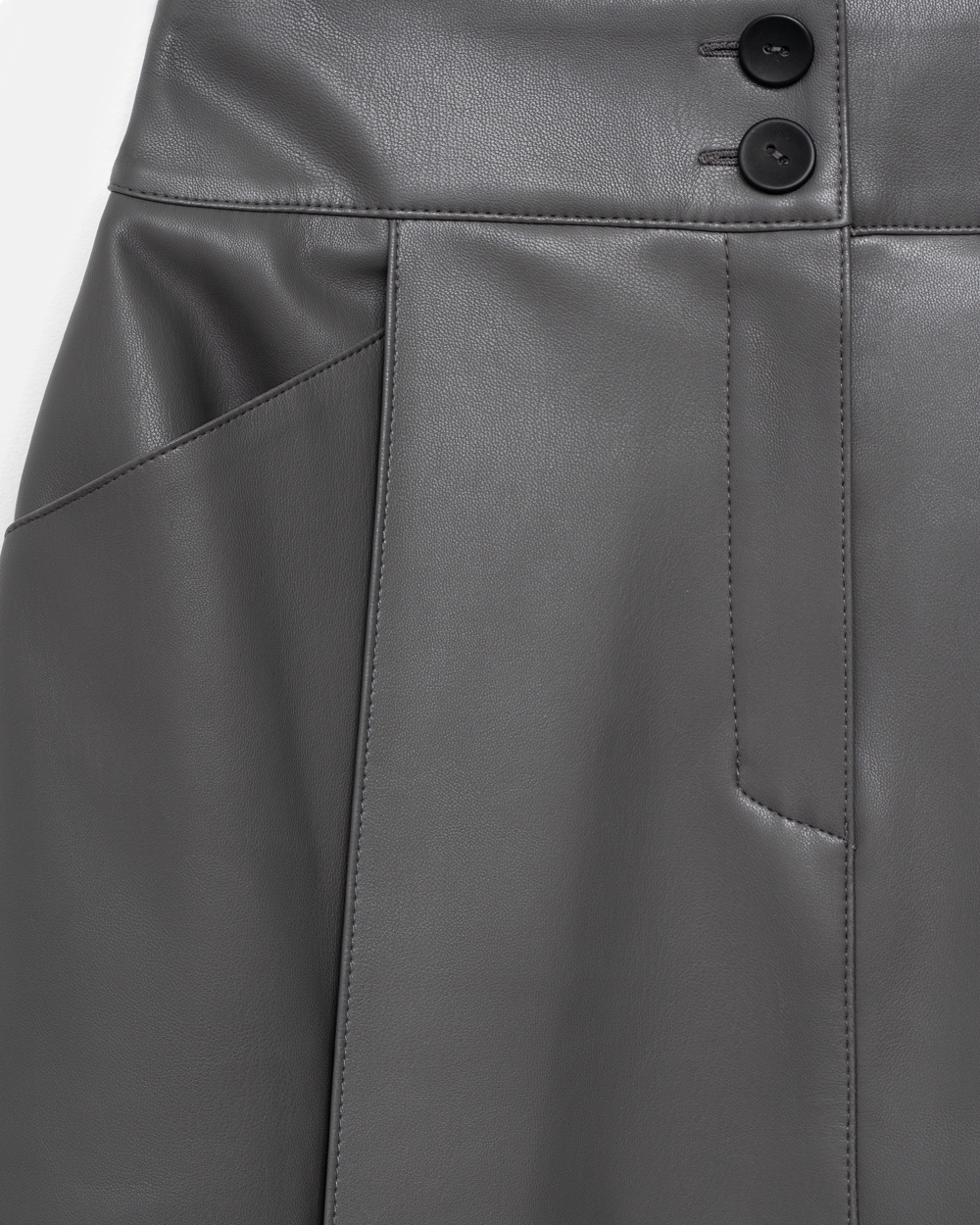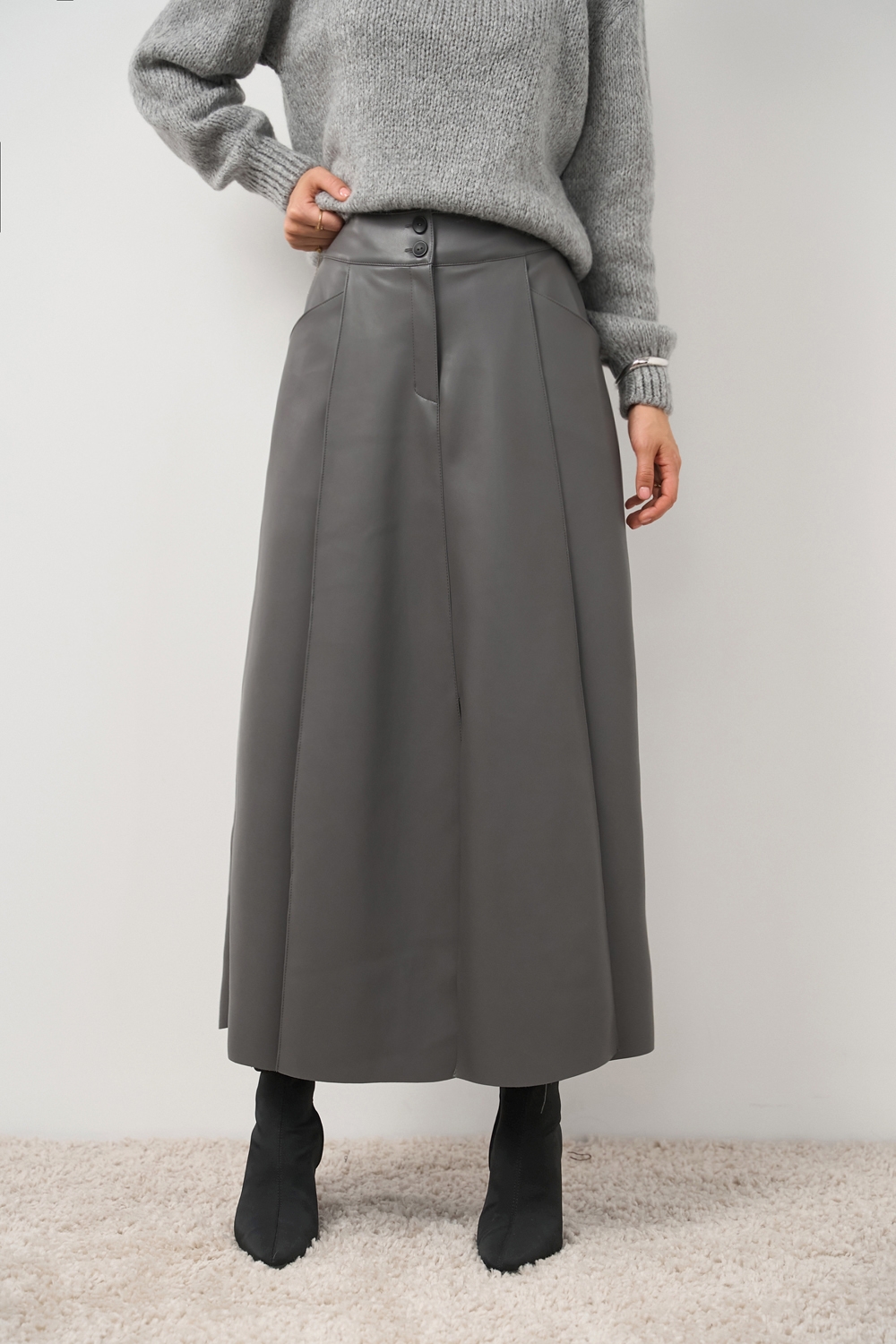 Спідниця з еко-шкіри А-силуету середньої довжини. Попереду спідниця оздоблена двома кишенями та акуратними складками. Застібка - блискавка та ґудзик.