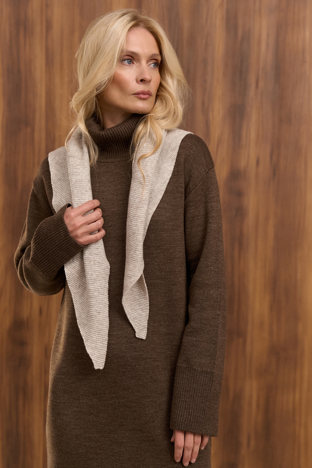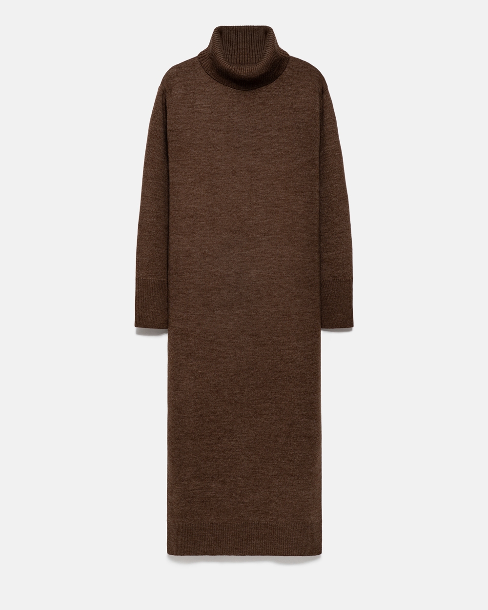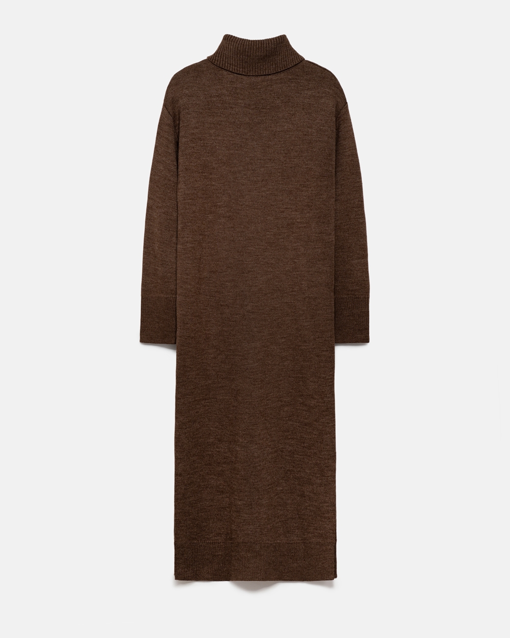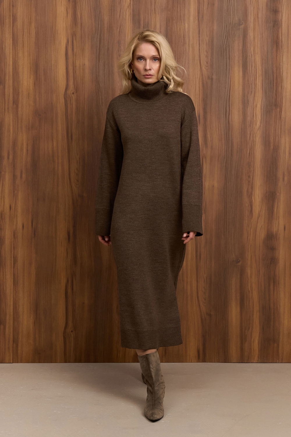 Сукня довжиною міді з напіввовняної пряжі з включенням віскози. Гладке стабільне переплетіння, гарно тримає форму. Рукав оздоблений високим манжетом, низ виробу - розслаблена імітована резинка.
