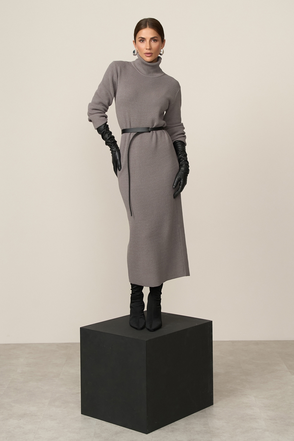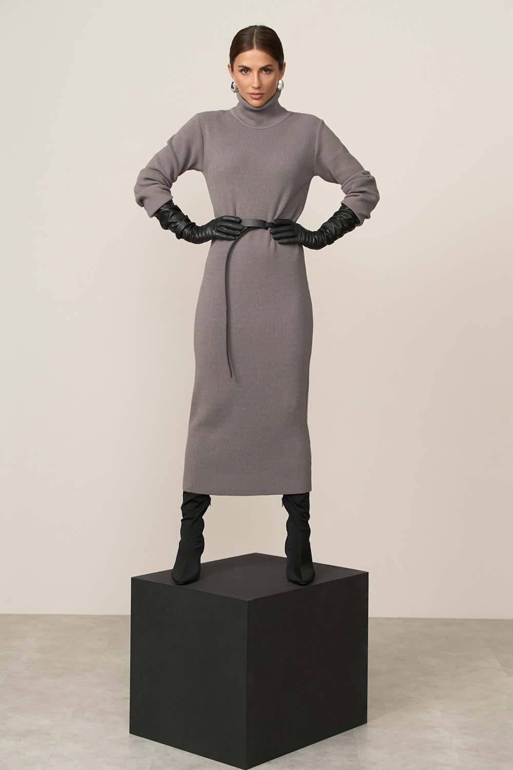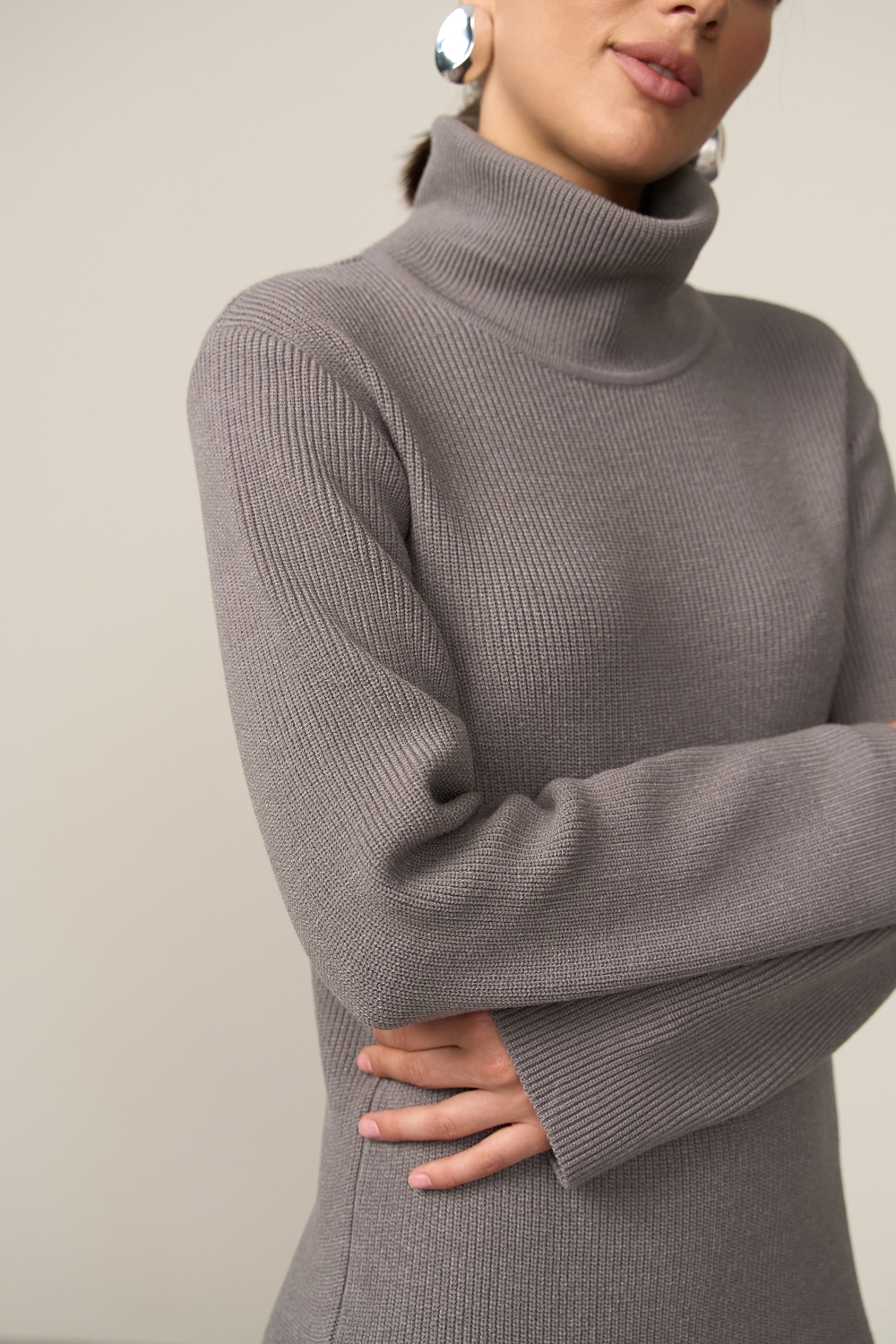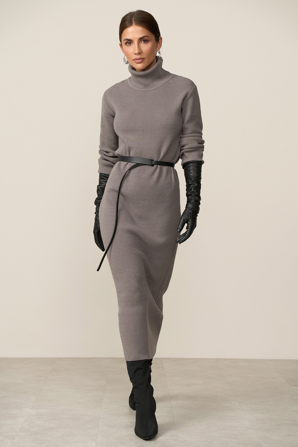 Універсальна сукня довжини міді виконана у стабільному переплетенні, середньої щільності із пряжі з включенням модалу та шовку.