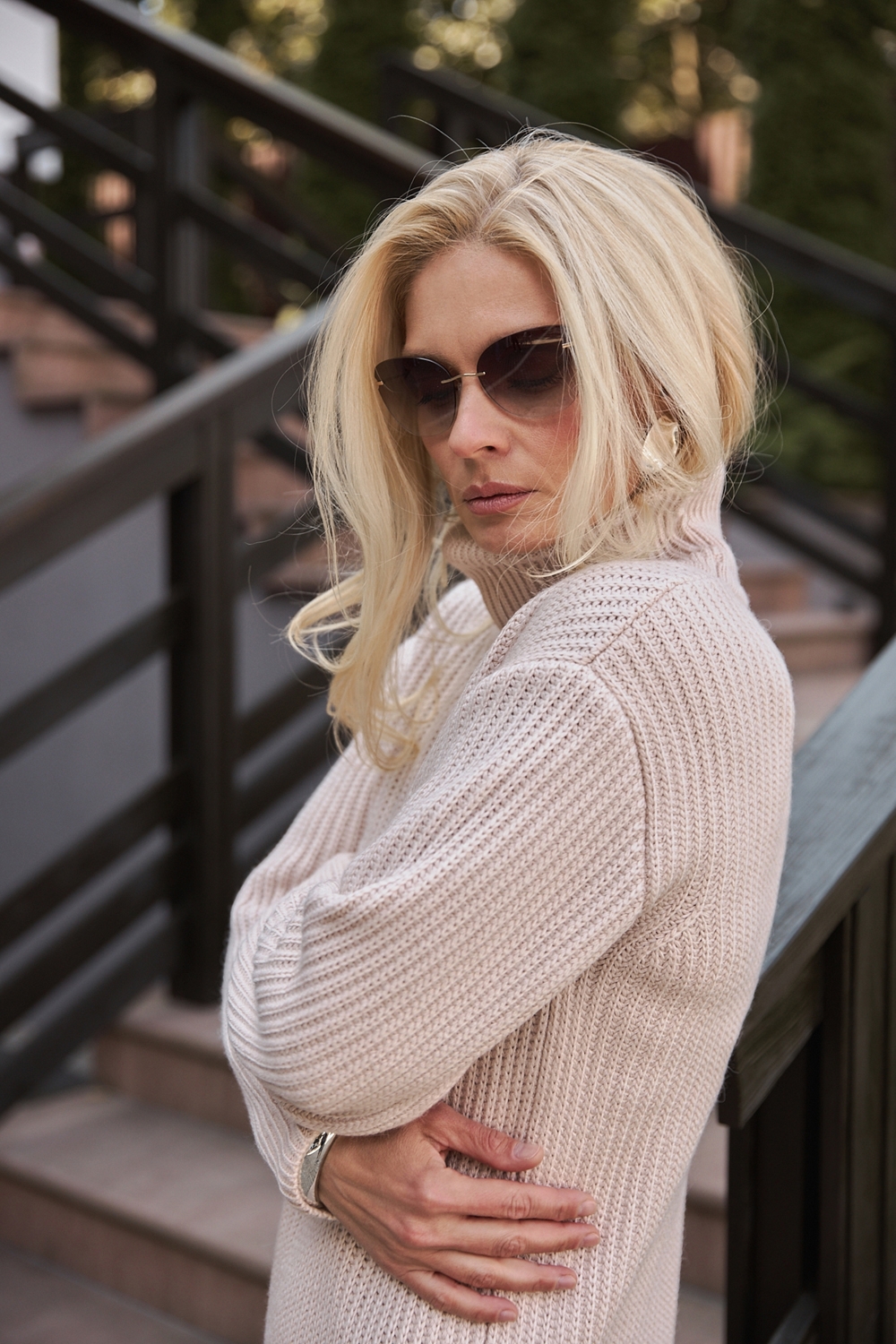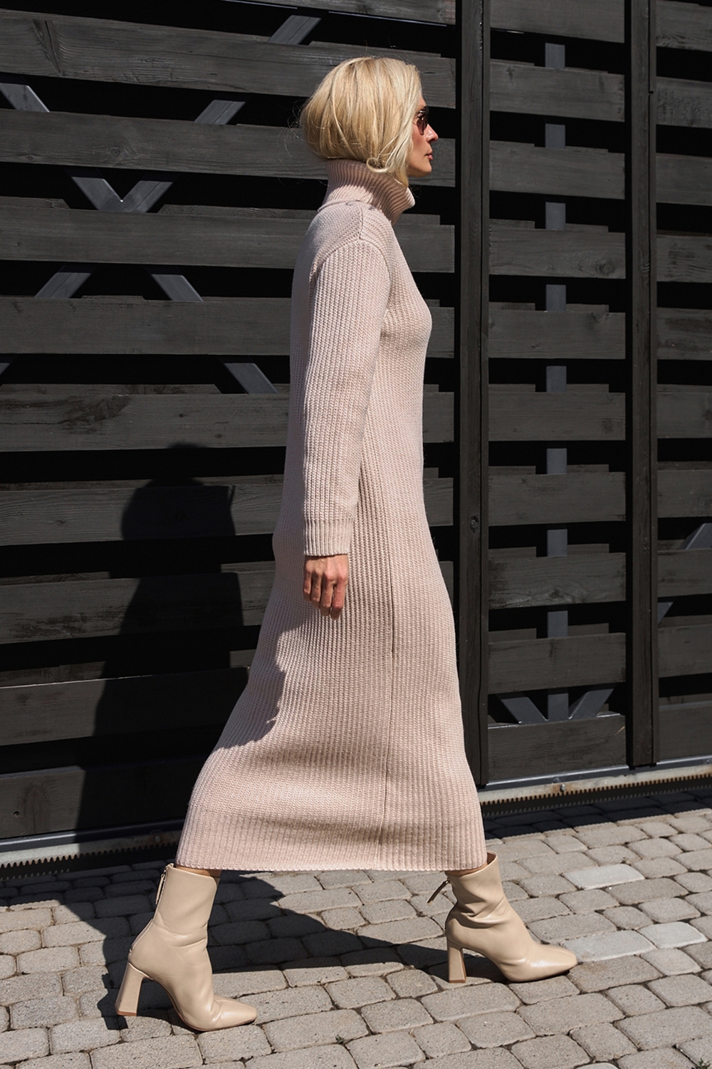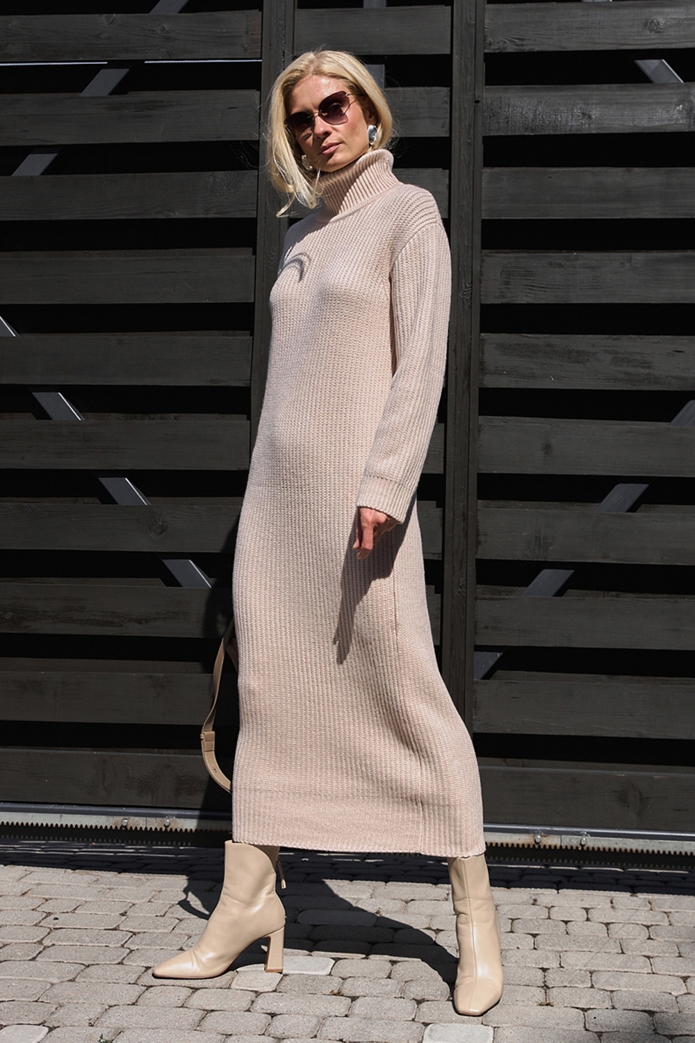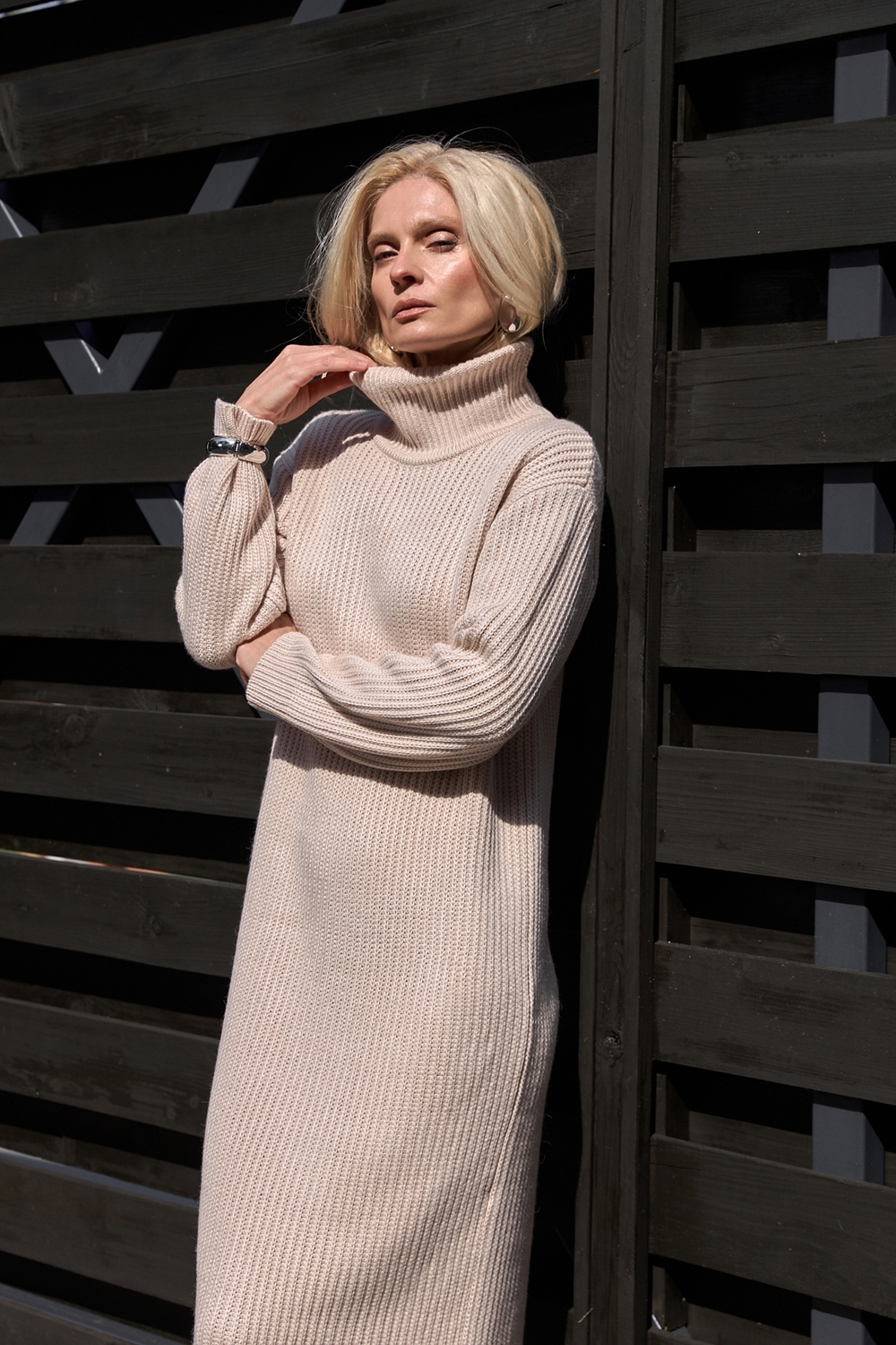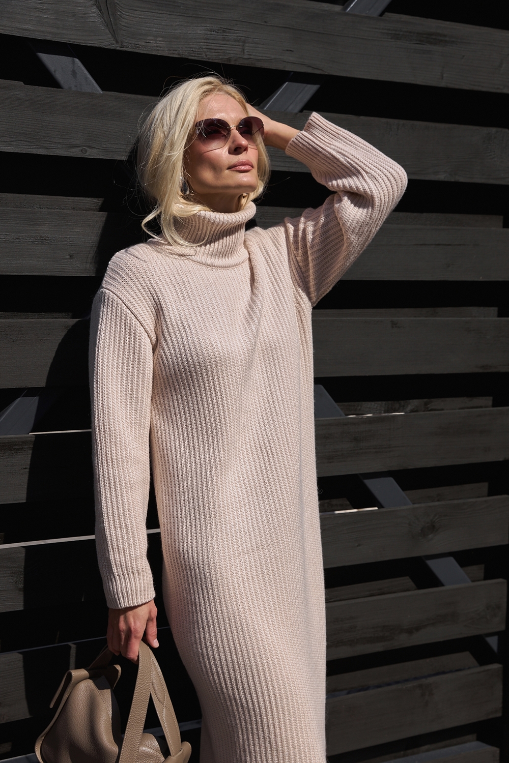 Максі-сукня із напіввовняної пряжі. Лаконічний фасон доповнений елегантним коміром-хомутом. Приємна до тіла щільна в'язка гарно тримає форму. Зручний прямий силует.