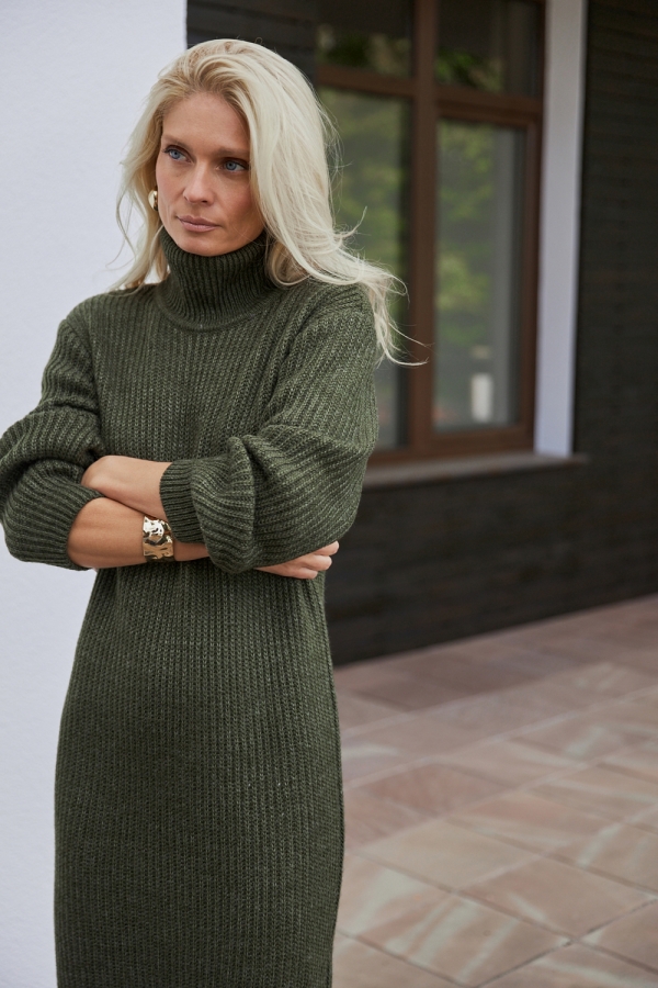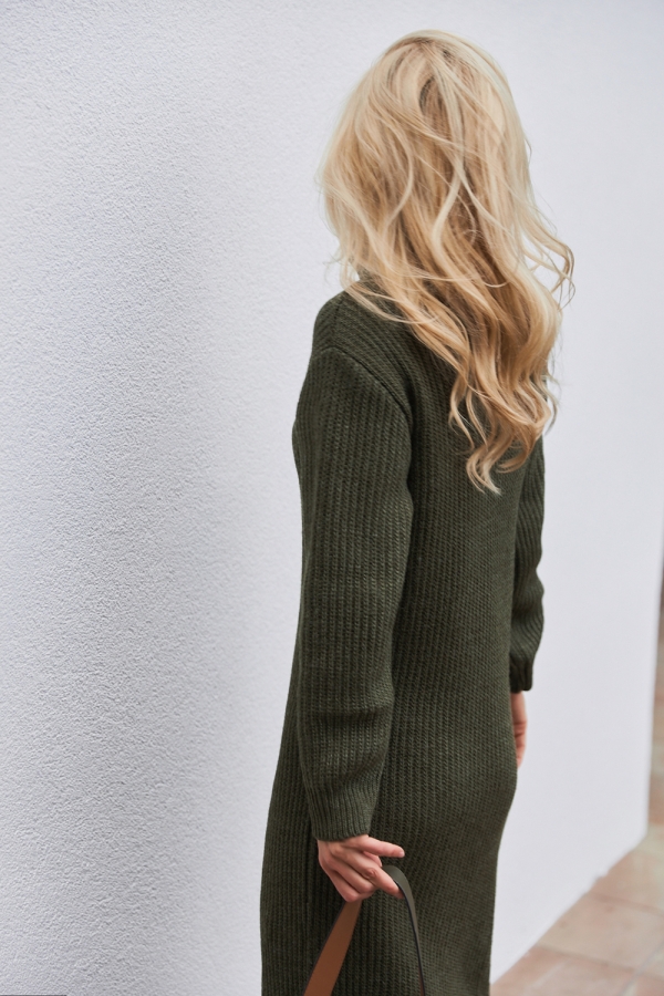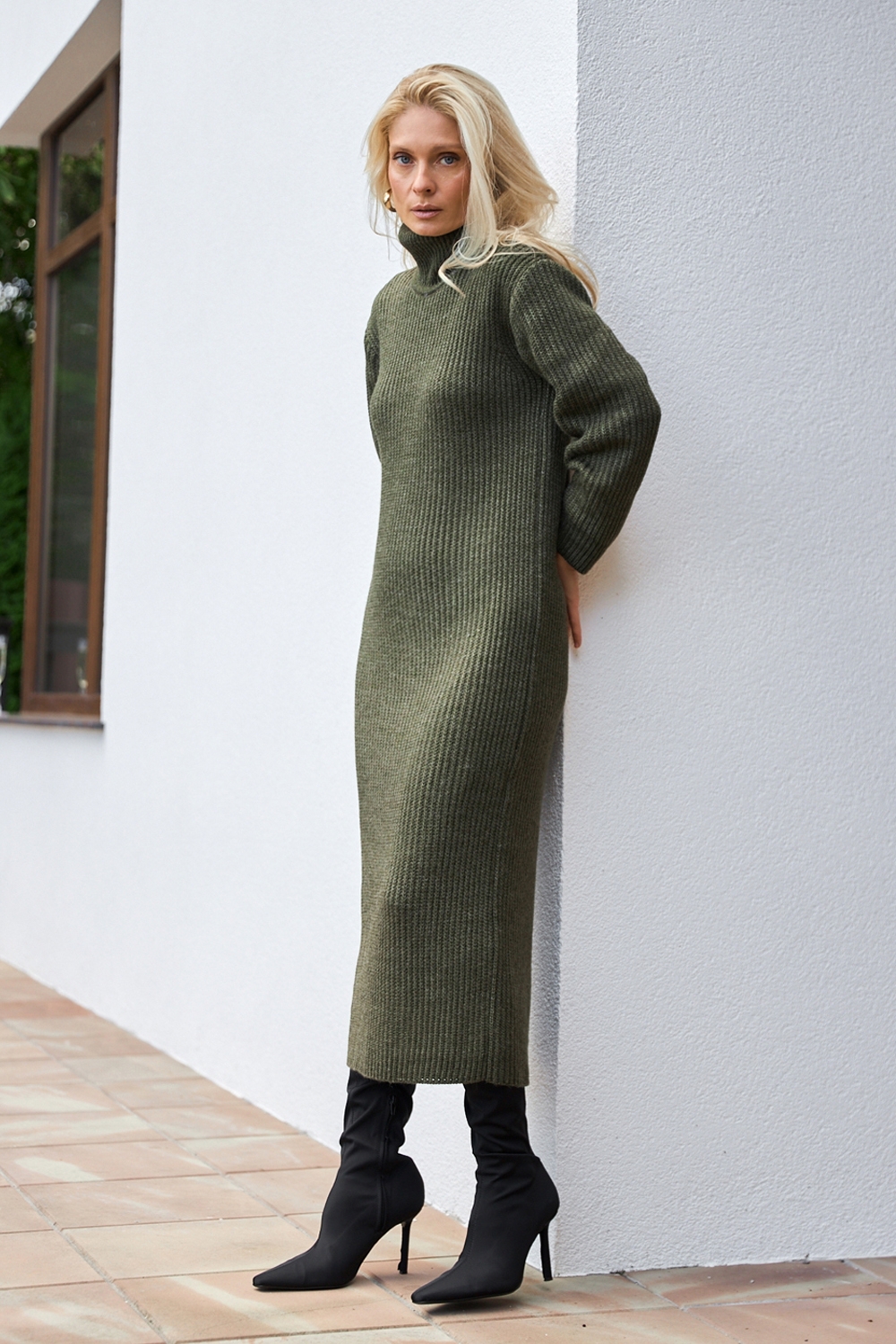 Максі-сукня із напіввовняної пряжі. Лаконічний фасон доповнений елегантним коміром-хомутом. Приємна до тіла щільна в'язка гарно тримає форму. Зручний прямий силует.