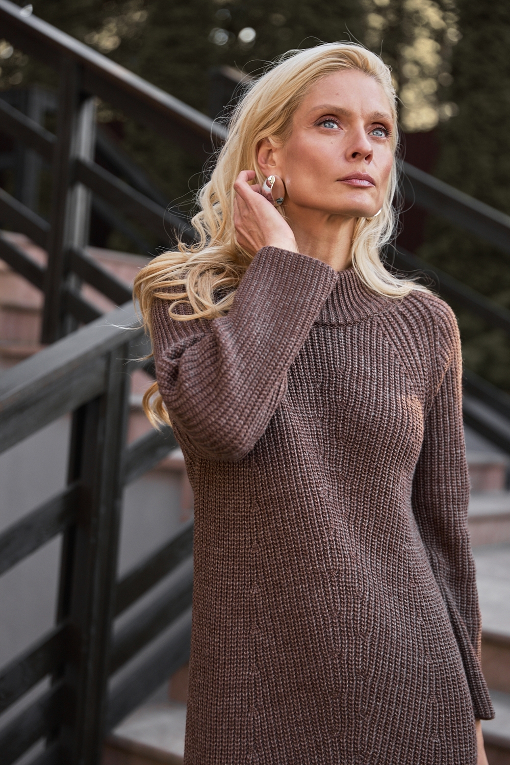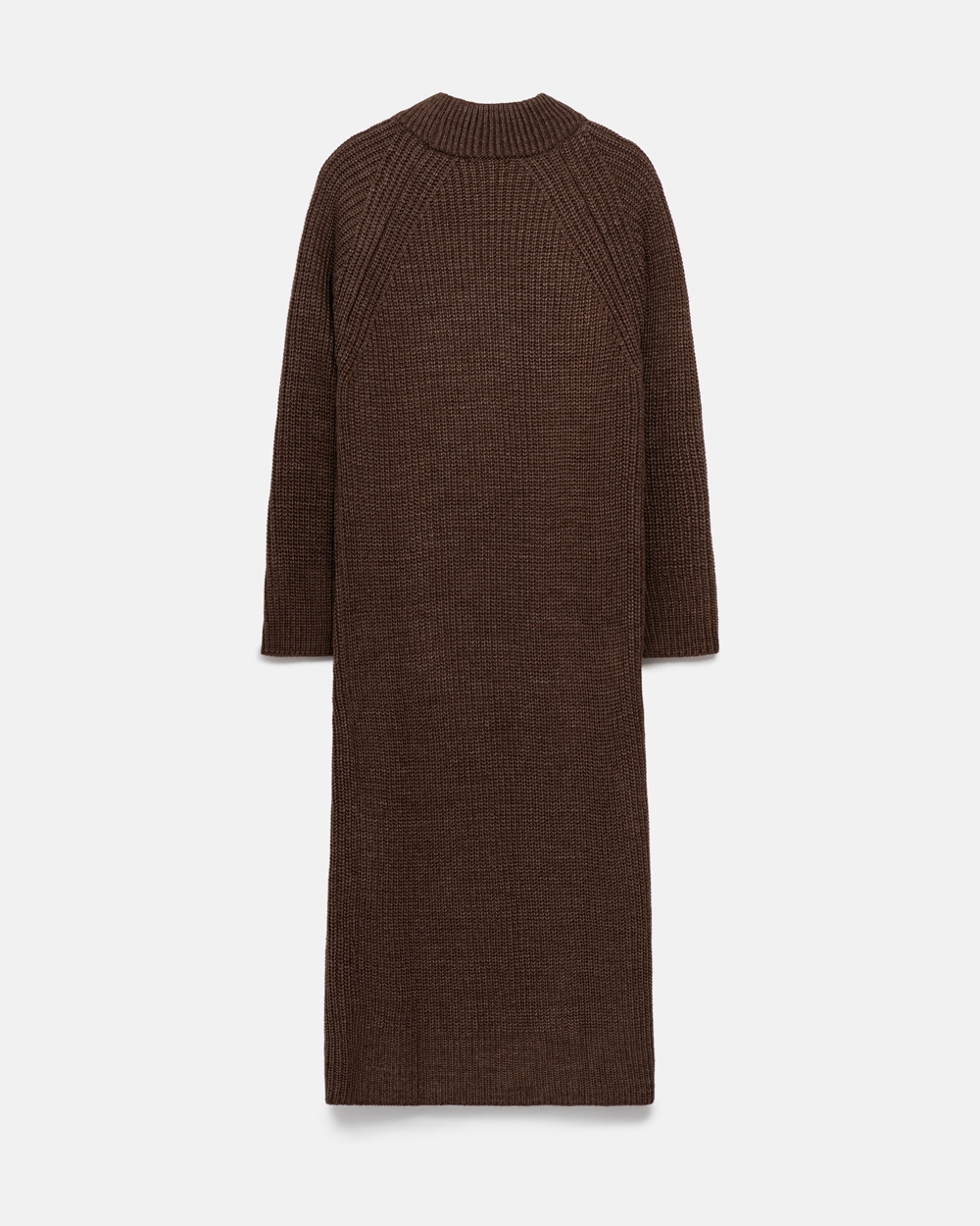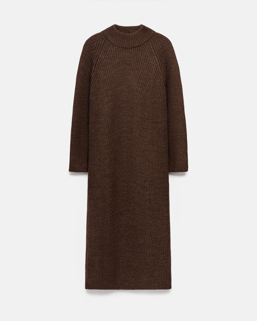 Елегантна сукня міді довжини, виконана з напіввовняної пряжі щільним, стабільним плетінням. Мінімалістичний орнамент попереду додає вишуканості. Комір-стійка ніжно огортає шию.