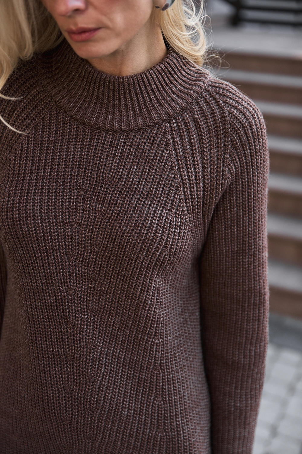 Елегантна сукня міді довжини, виконана з напіввовняної пряжі щільним, стабільним плетінням. Мінімалістичний орнамент попереду додає вишуканості. Комір-стійка ніжно огортає шию.