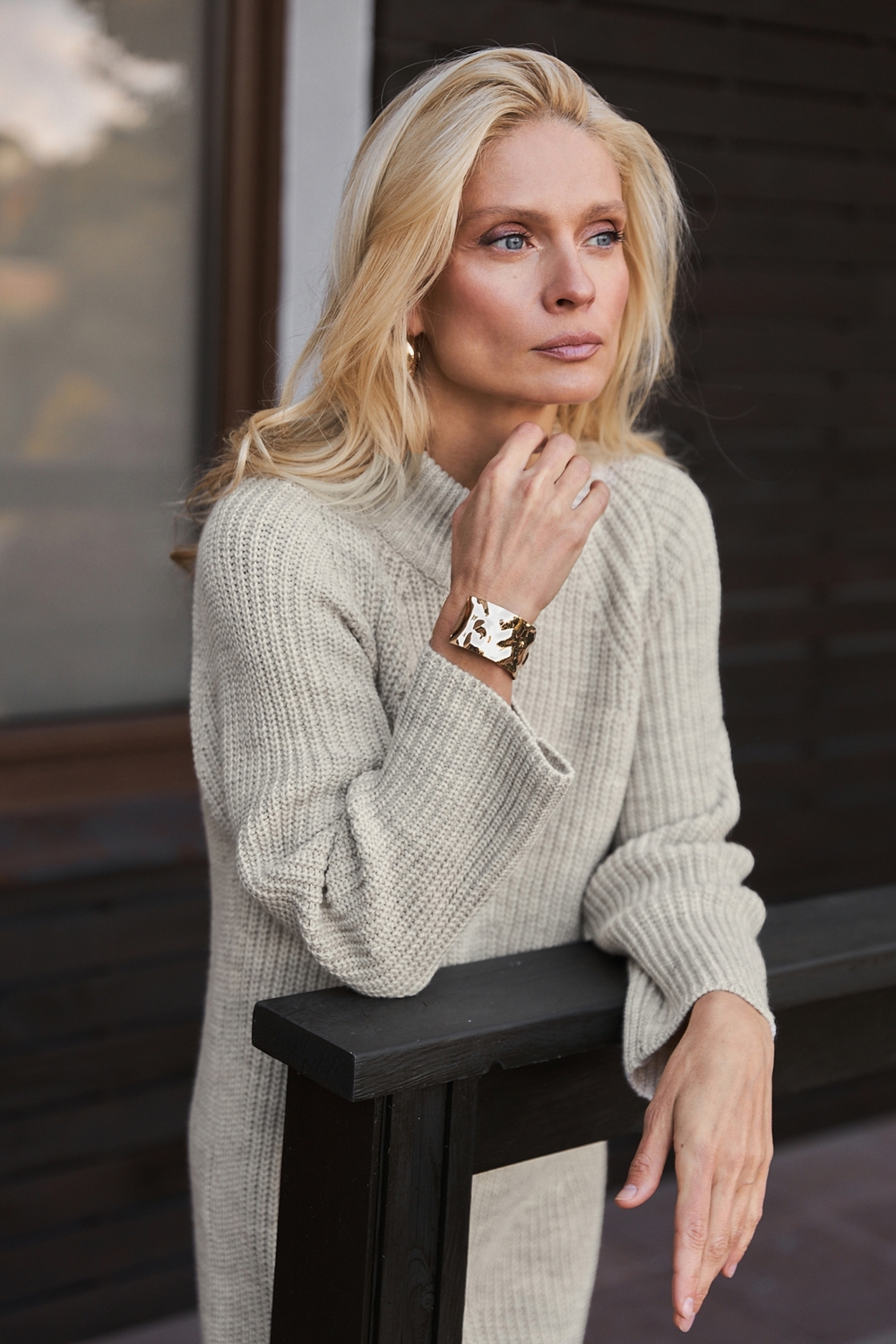 Елегантна сукня міді довжини, виконана з напіввовняної пряжі щільним, стабільним плетінням. Мінімалістичний орнамент попереду додає вишуканості. Комір-стійка ніжно огортає шию.
