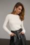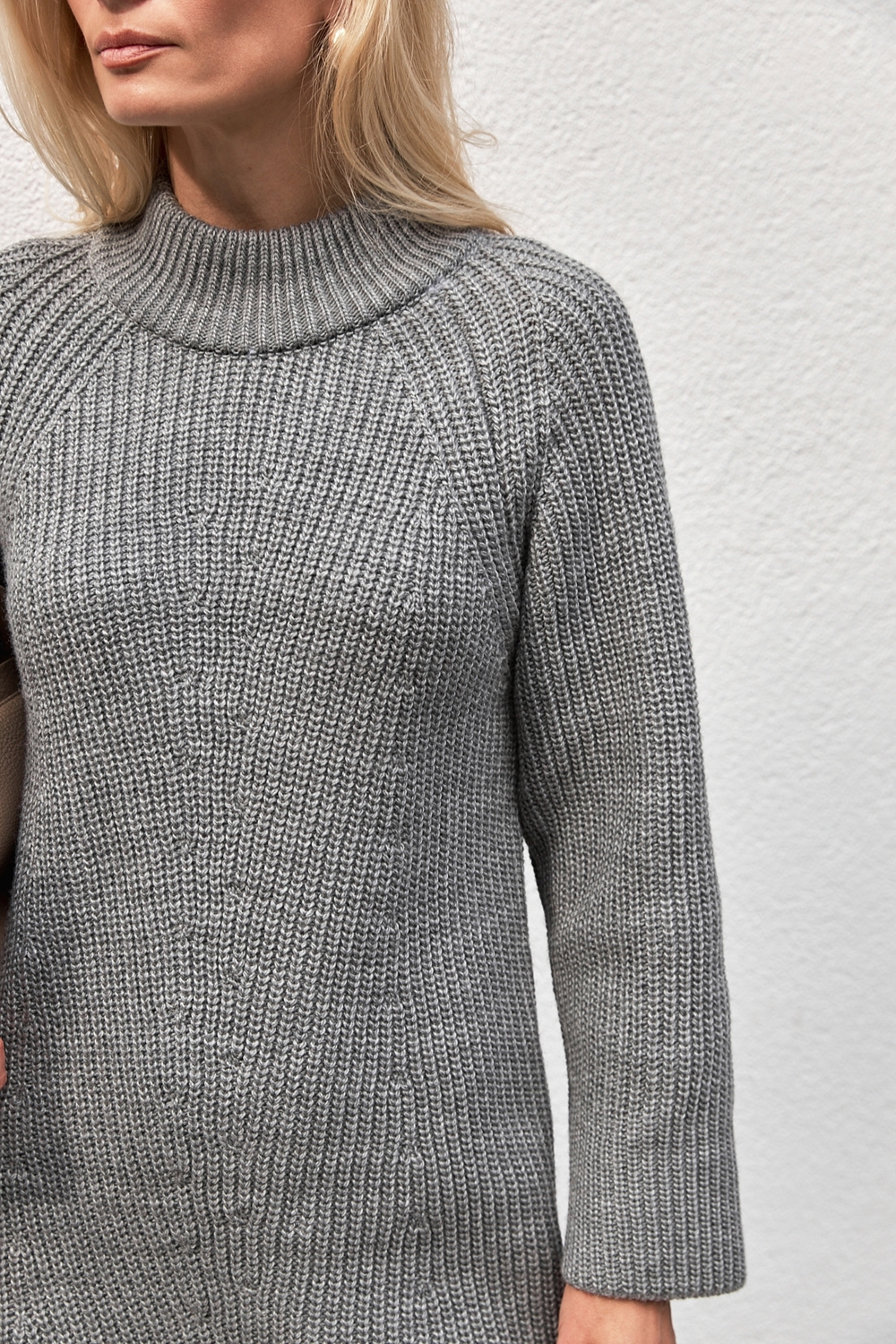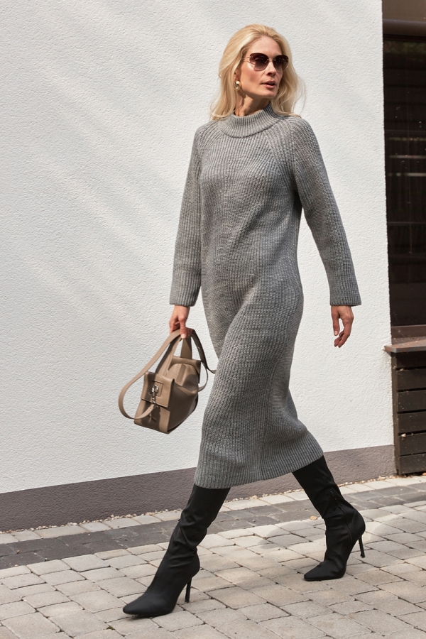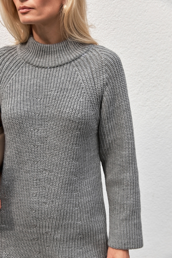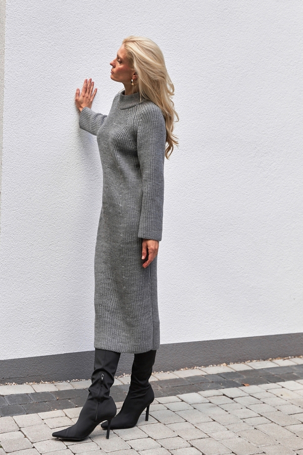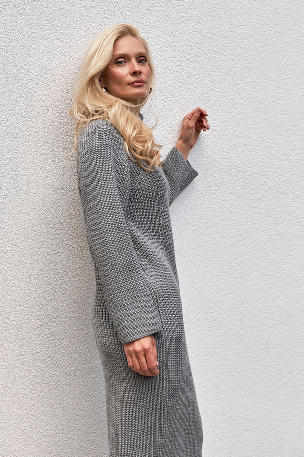 Елегантна сукня міді довжини, виконана з напіввовняної пряжі щільним, стабільним плетінням. Мінімалістичний орнамент попереду додає вишуканості. Комір-стійка ніжно огортає шию.
