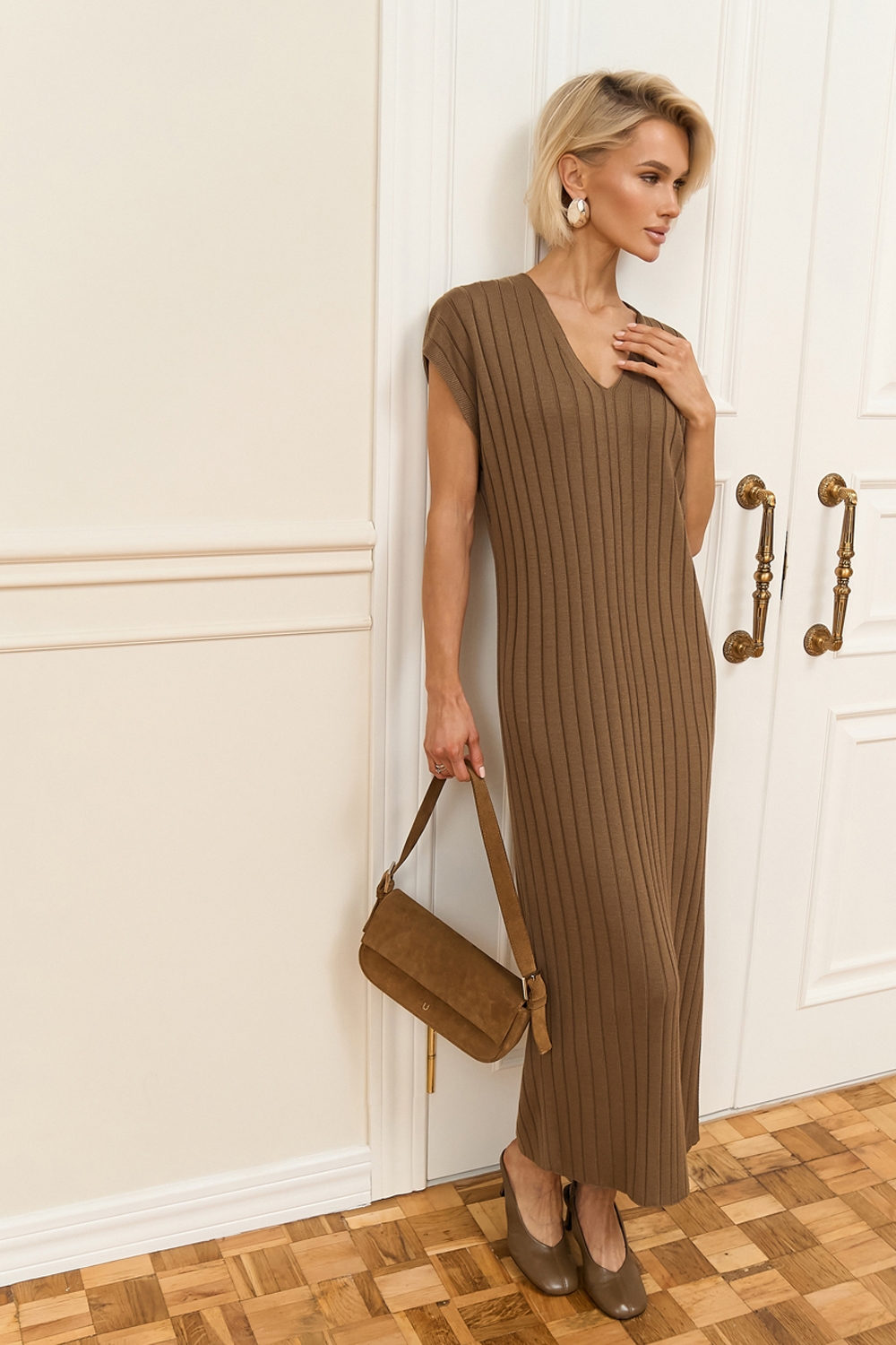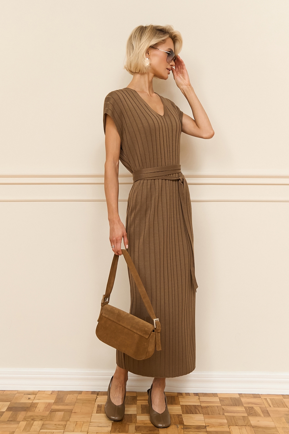 Стильна сукня прямого силуету довжини максі. Модель виготовлена з шовковистої, м'якої віскозної пряжі фактурним візерунком у вертикальну смужку. Пояс у комплекті.