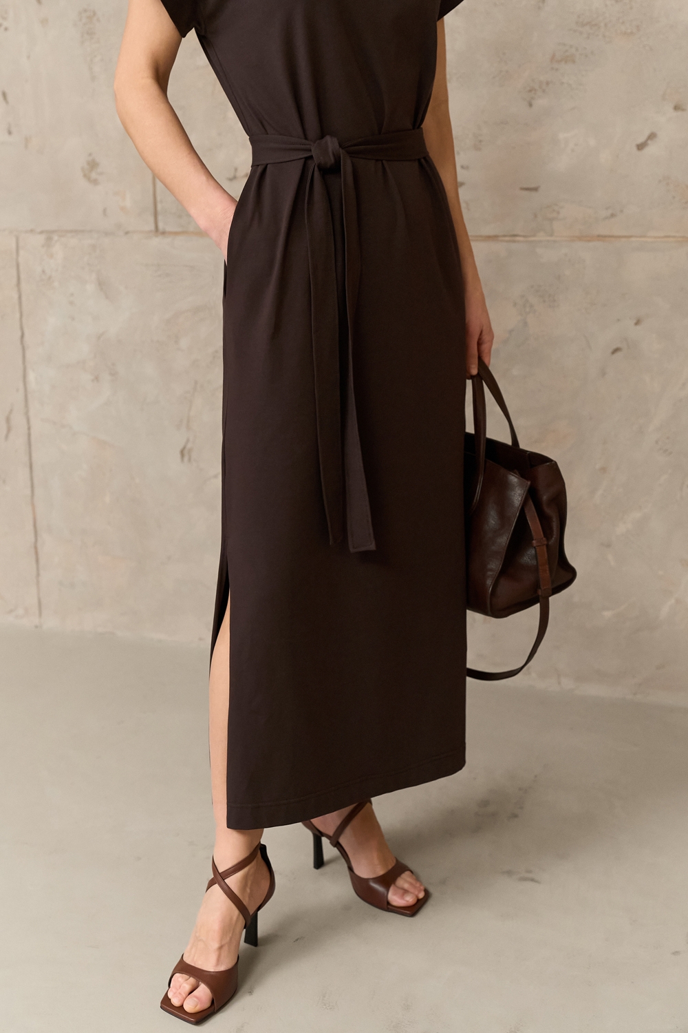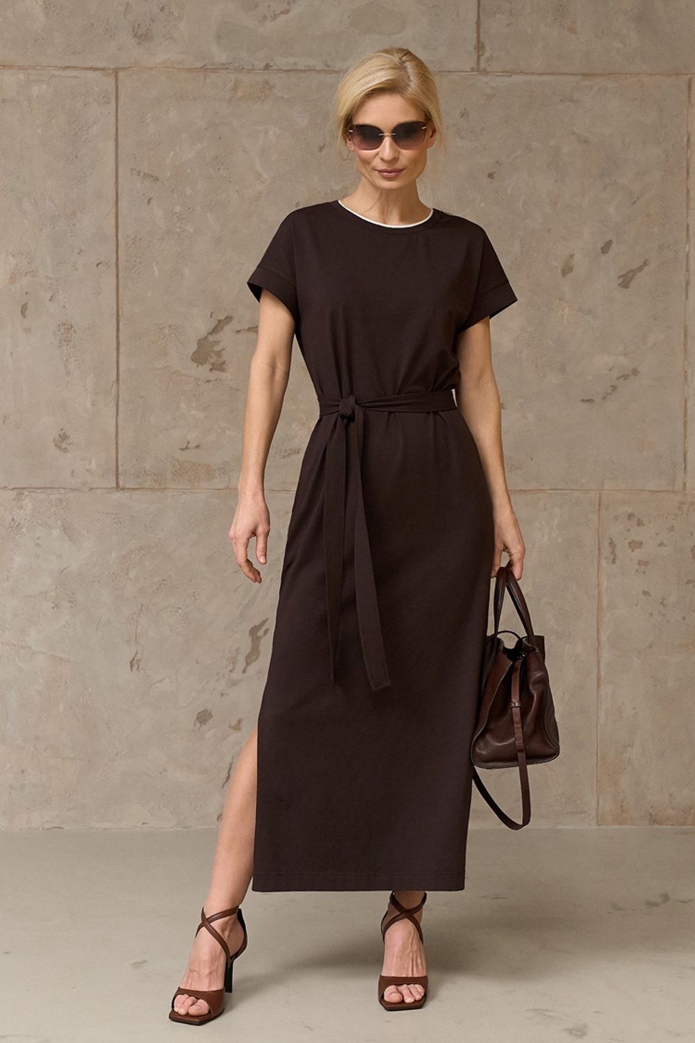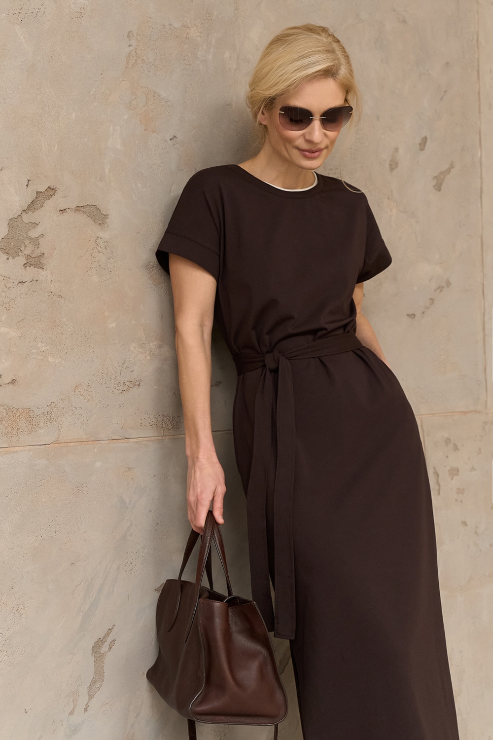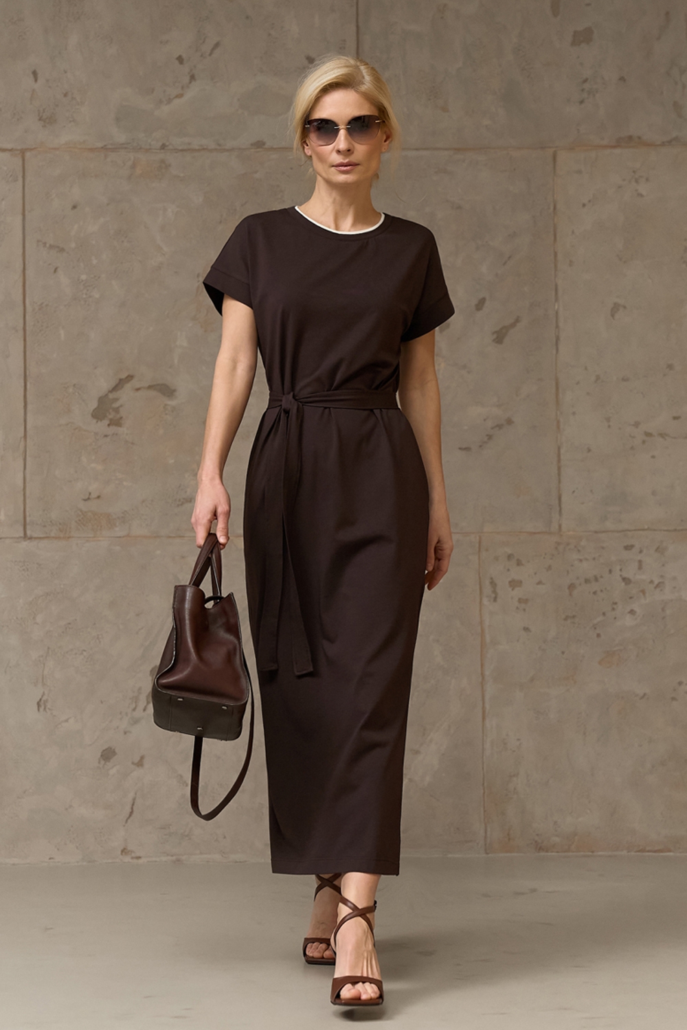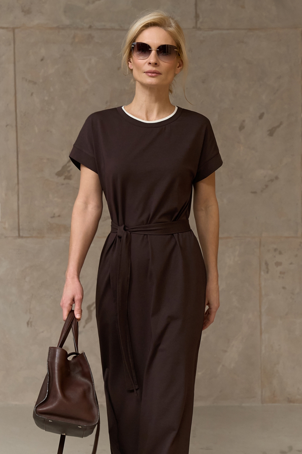Бавовняна сукня прямого крою виготовлена із пряємної до тіла тканини, що тримає форму. В бокових швах місткі кишені. Пояс у комплекті.