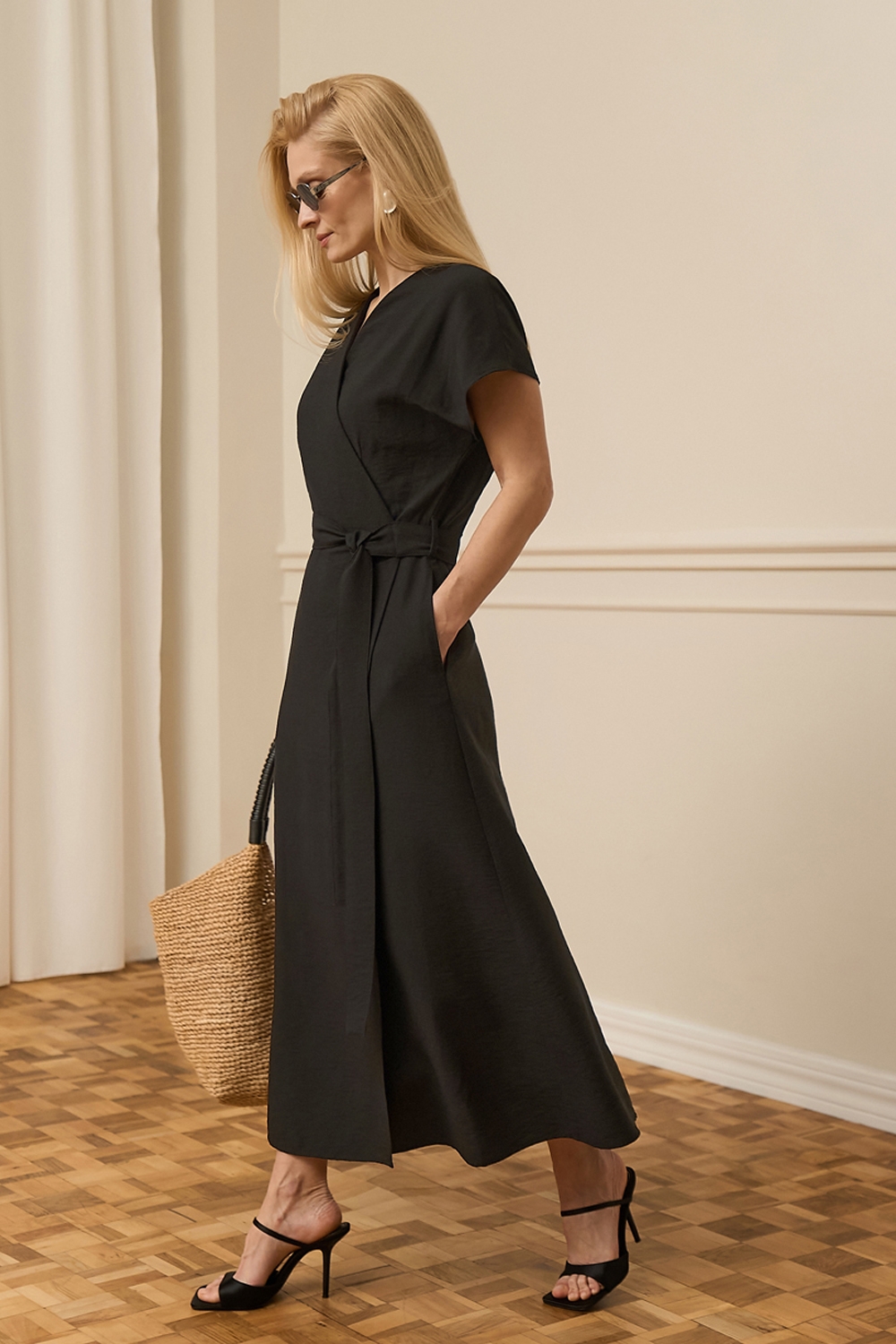 Вишукана сукня виготовлена з натуральної, струмуючої тканини. Модель на запах, зовні фіксується закріпленим поясом, всередині додаткова зав'язка для зручної фіксації.