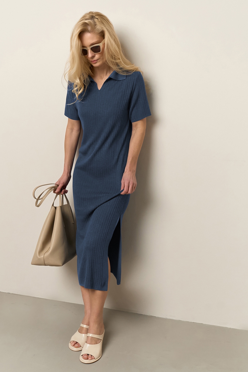 Універсальна сукня виготовлена з віскозної пряжі з додаванням бавовни та виразною фактурою у вертикальну смужку. Модель прямого силуету середньої довжини з лаконічним комірцем поло. Сукня чудово тягнеться та приємна на дотик.