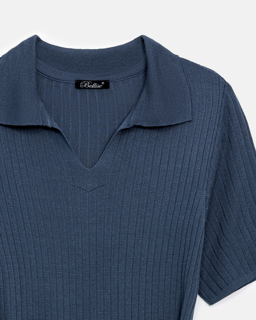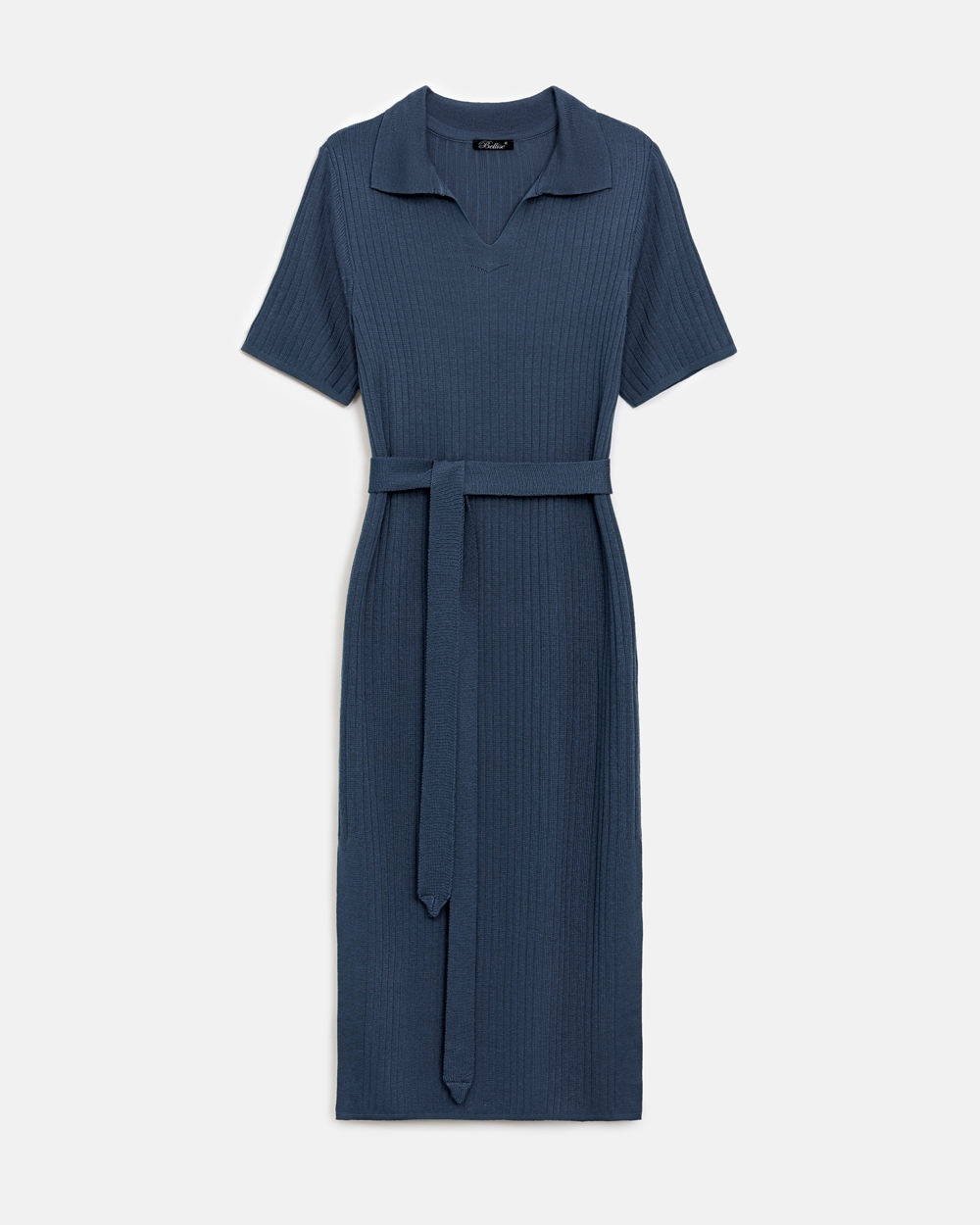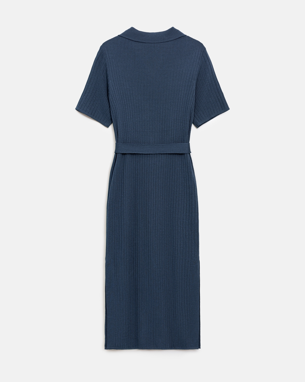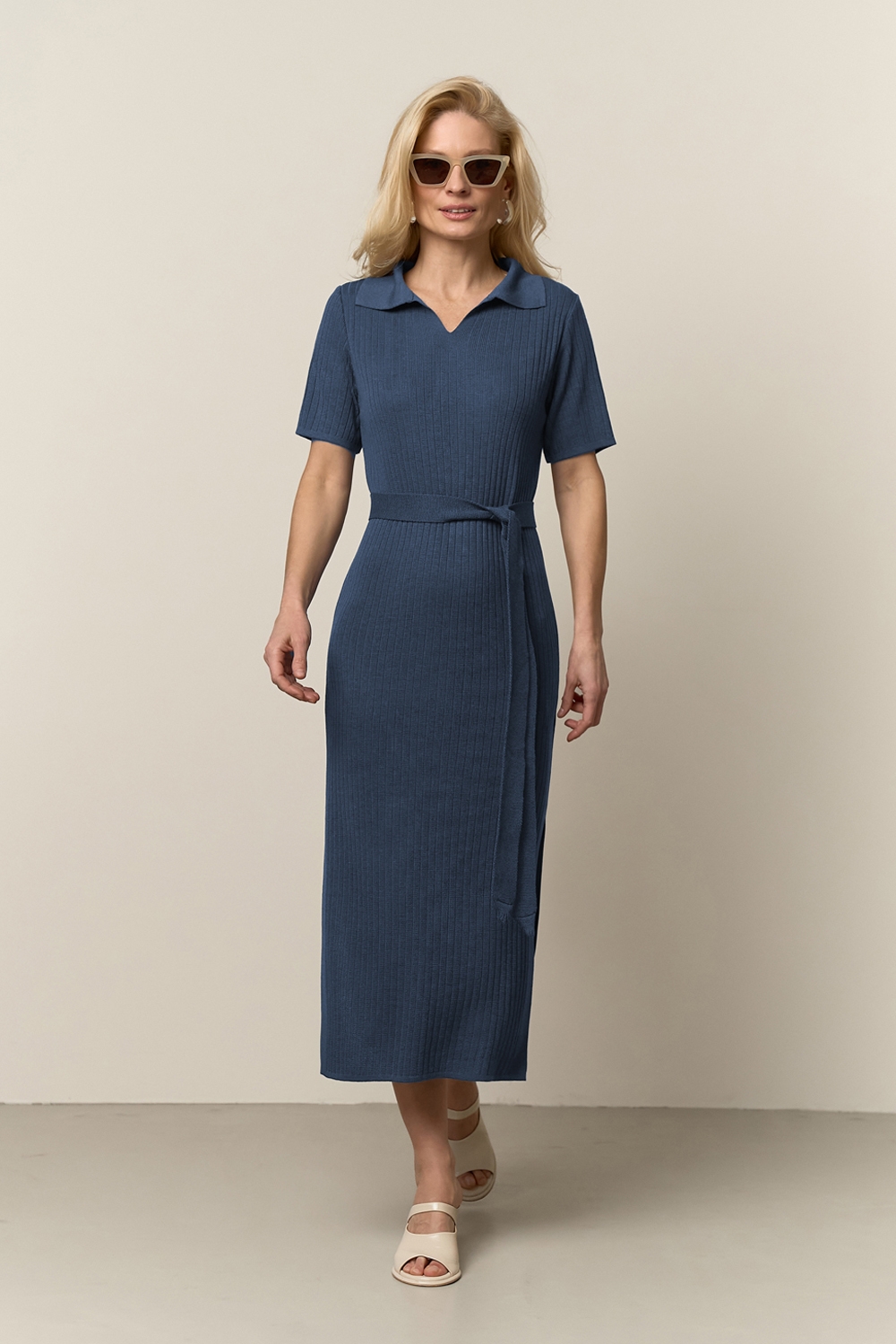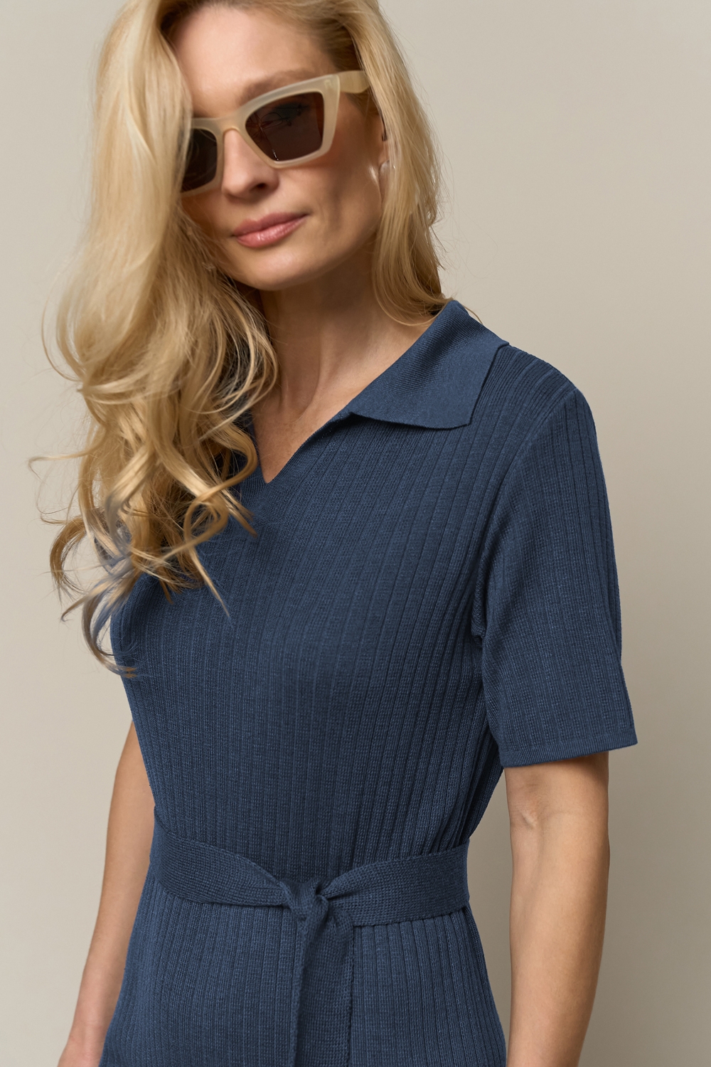 Універсальна сукня виготовлена з віскозної пряжі з додаванням бавовни та виразною фактурою у вертикальну смужку. Модель прямого силуету середньої довжини з лаконічним комірцем поло. Сукня чудово тягнеться та приємна на дотик.