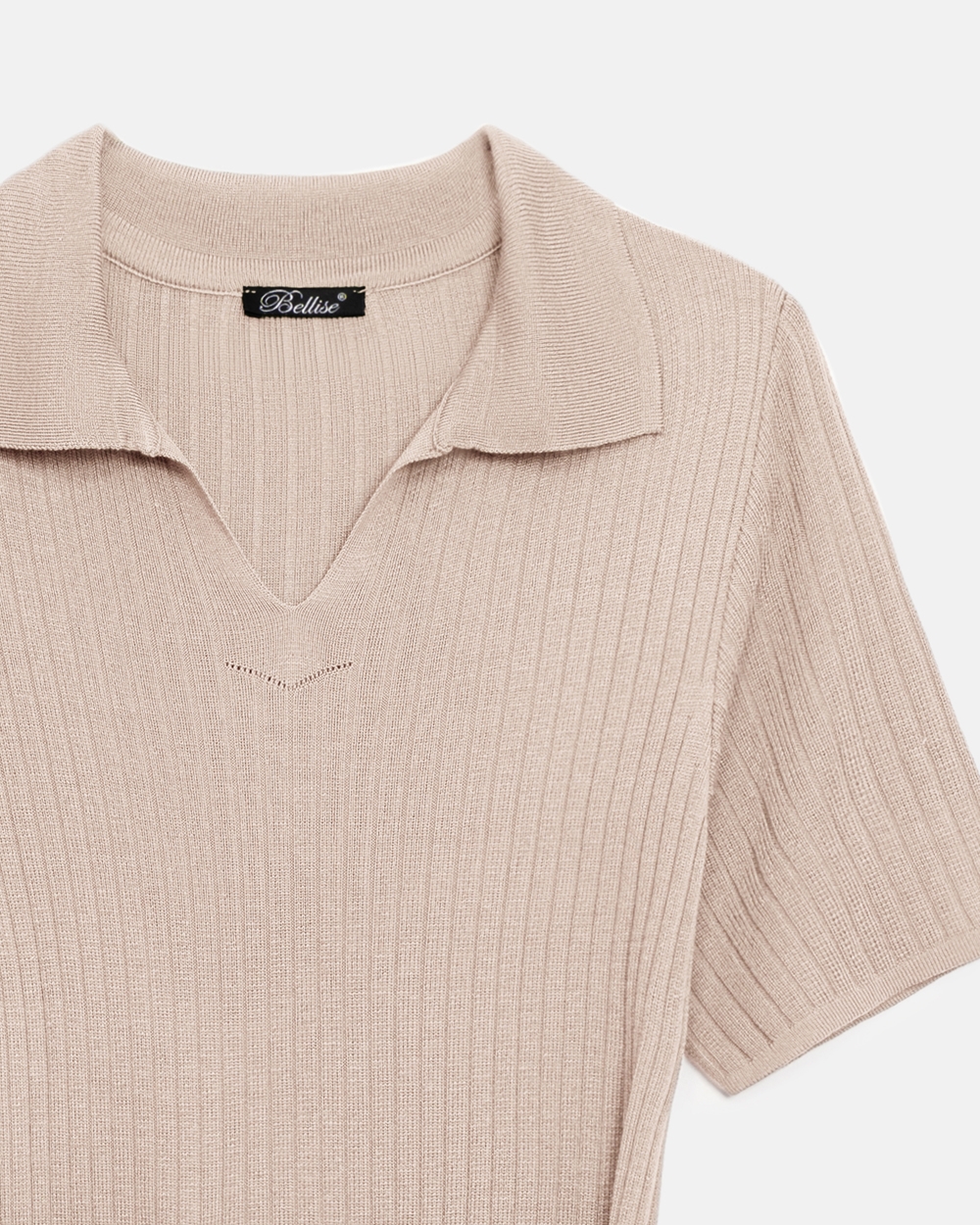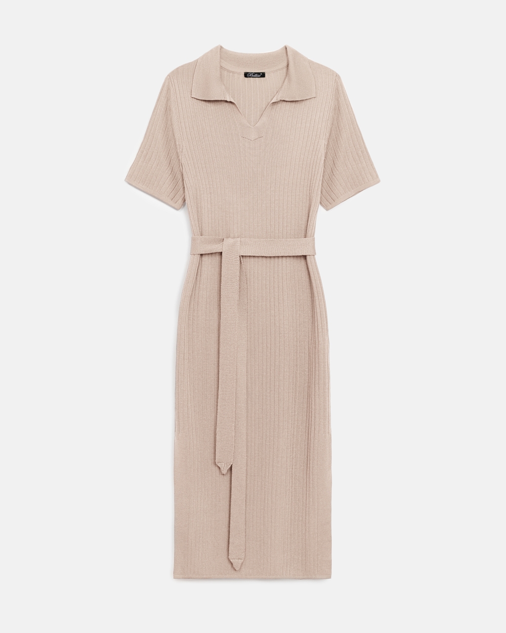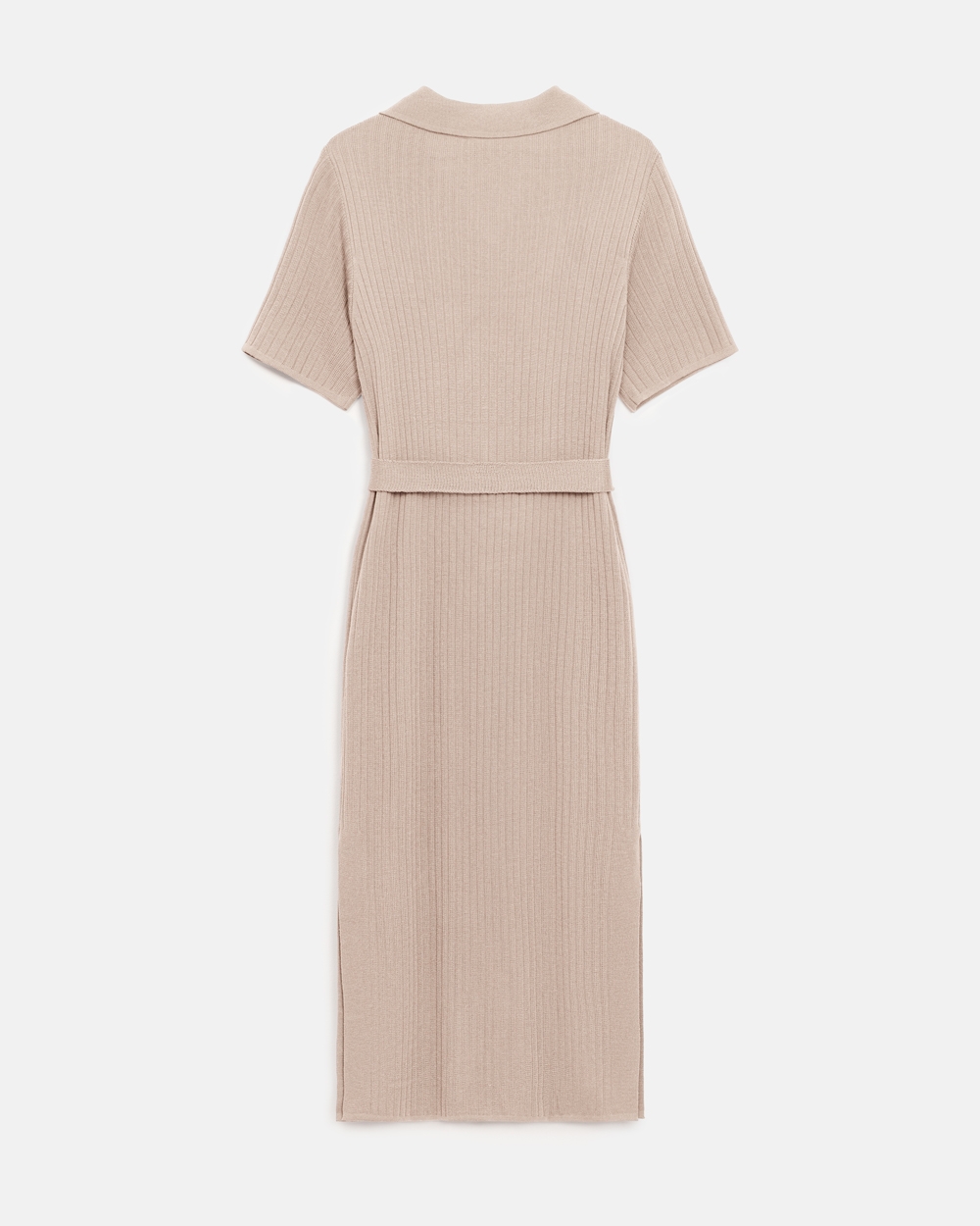 Універсальна сукня виготовлена з віскозної пряжі з додаванням бавовни та виразною фактурою у вертикальну смужку. Модель прямого силуету середньої довжини з лаконічним комірцем поло. Сукня чудово тягнеться та приємна на дотик.