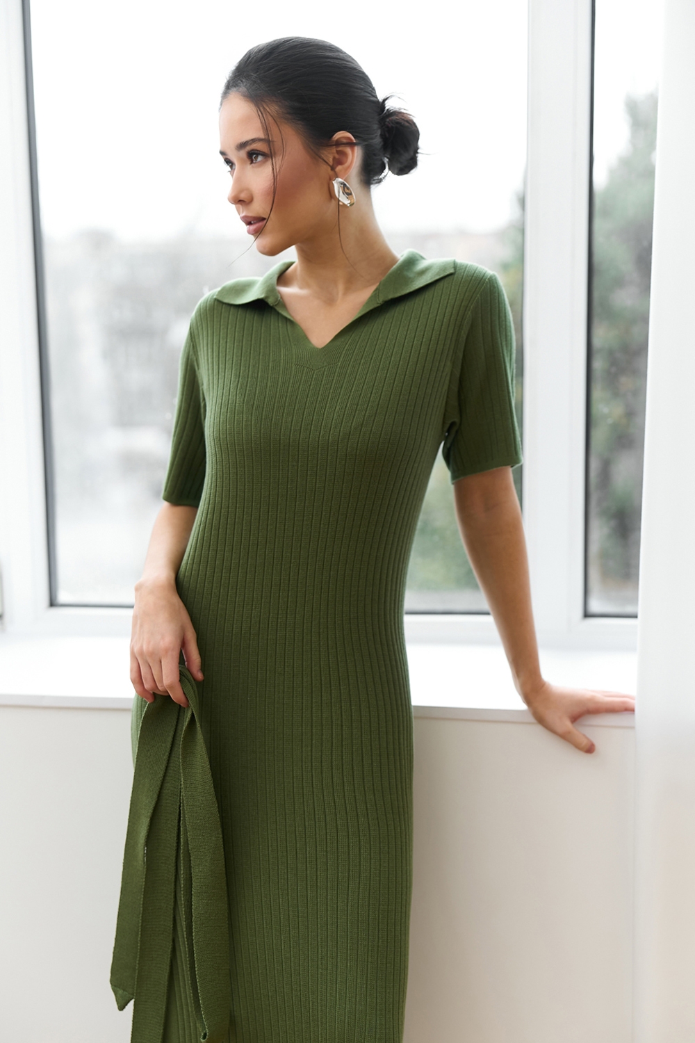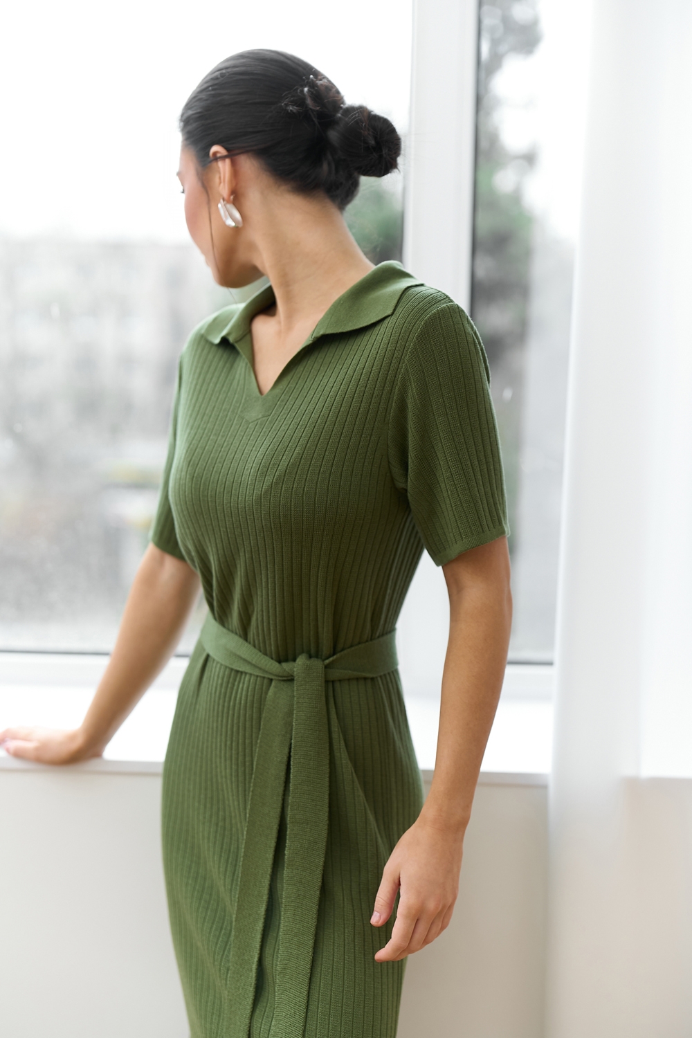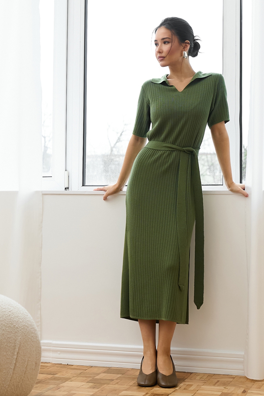 Універсальна сукня виготовлена з віскозної пряжі з додаванням бавовни та виразною фактурою у вертикальну смужку. Модель прямого силуету середньої довжини з лаконічним комірцем поло. Сукня чудово тягнеться та приємна на дотик.