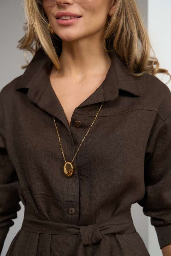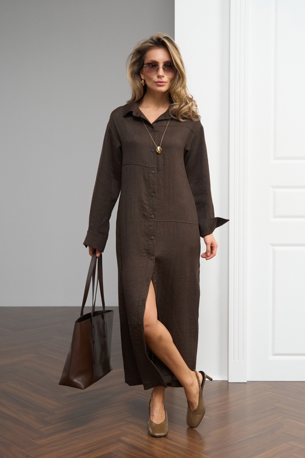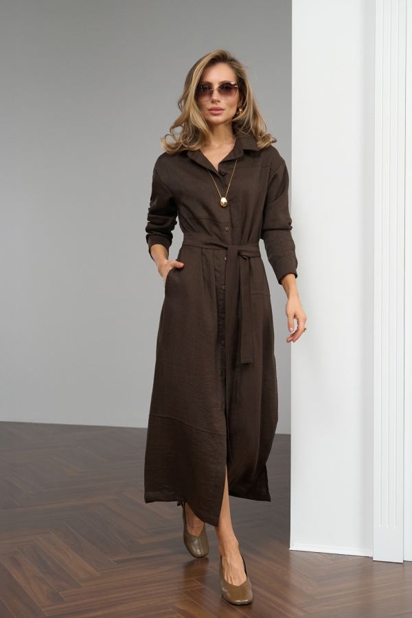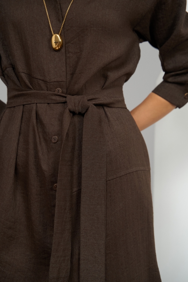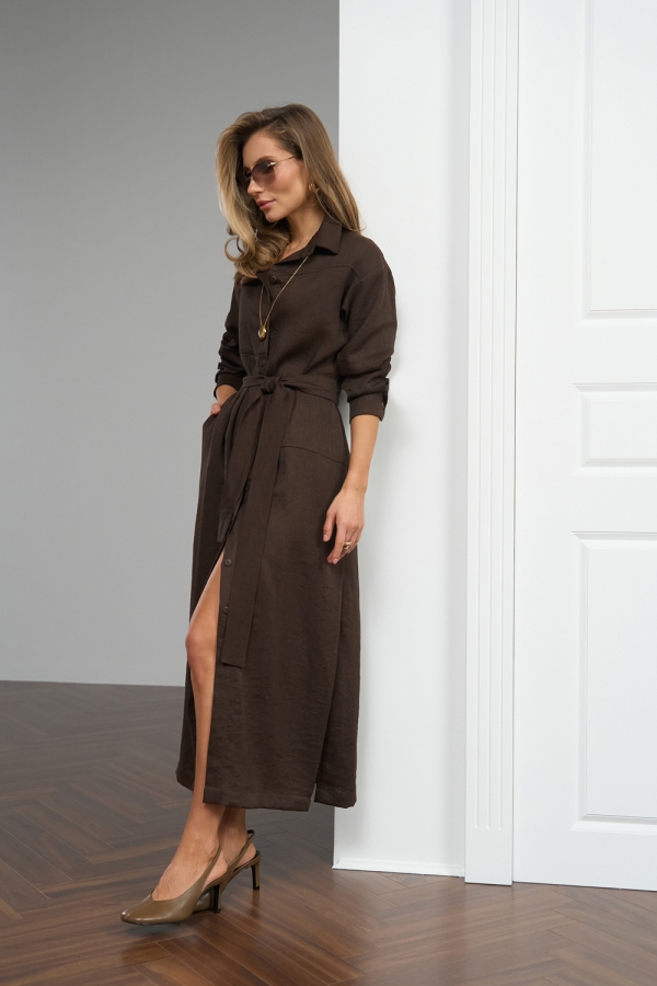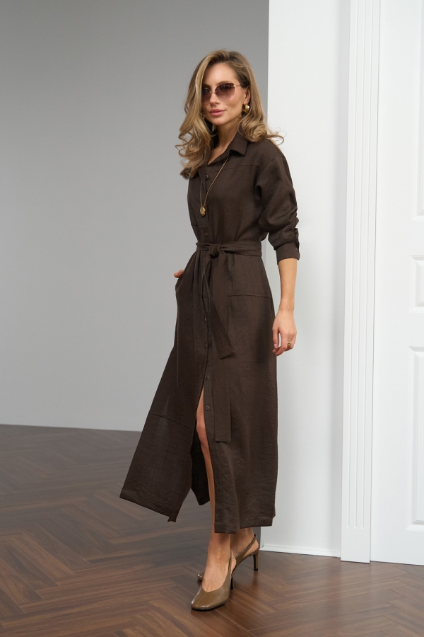 Елегантна сукня-сорочка довжини міді. Модель виконана із льняної тканини середньої щільності, що добре драпірується.