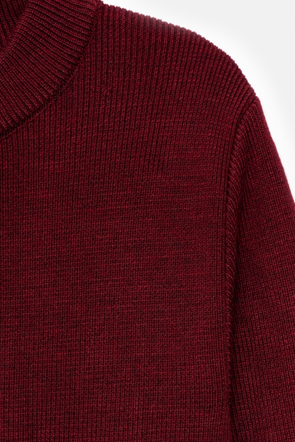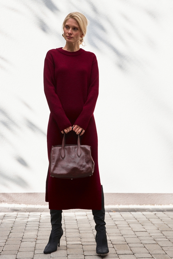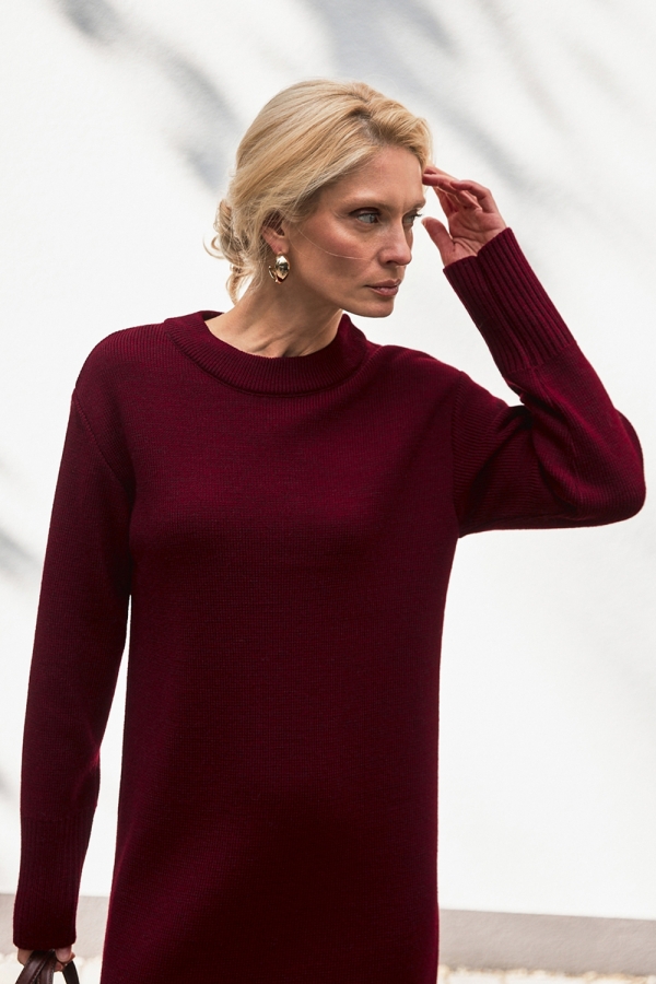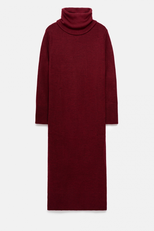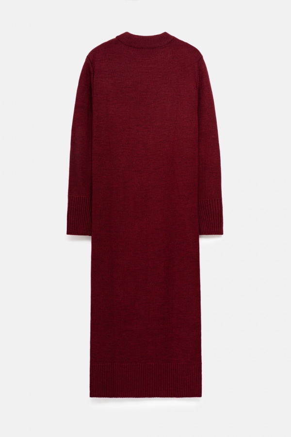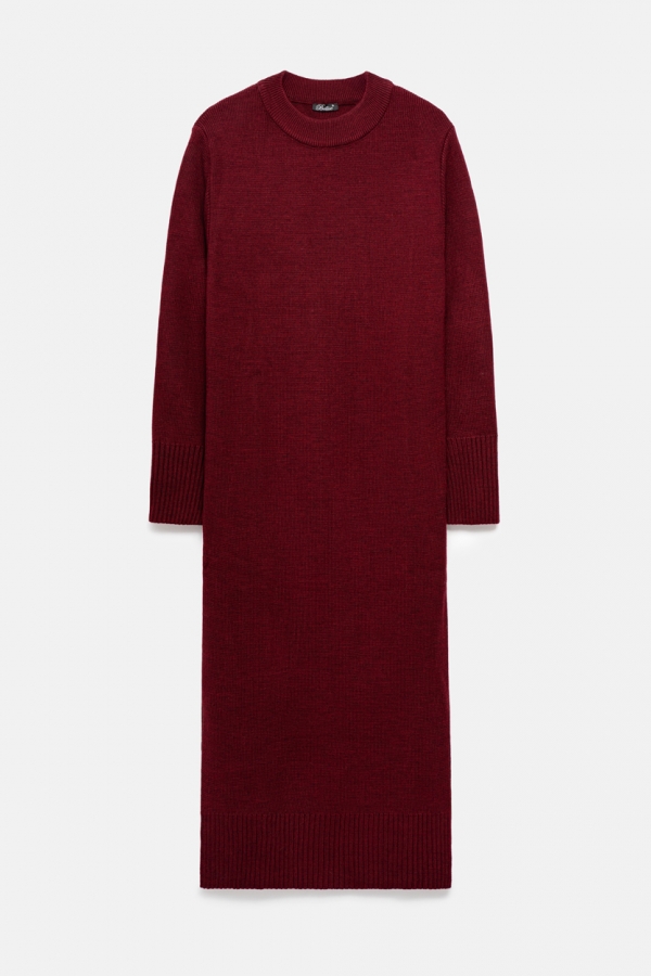 Сукня прямого силуету середньої довжини, виконана з вовняної пряжі щільного, гладкого плетіння.