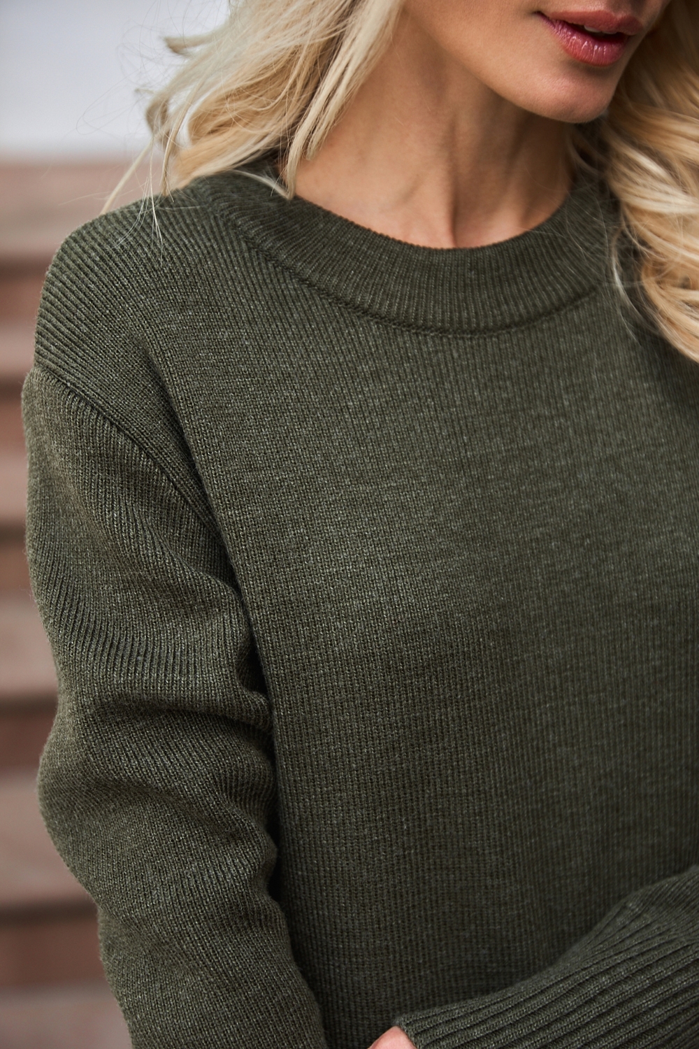 Класичну круглу горловину доповнено знімним коміром-хомутом, що м’яко огортає шию. Розрізи в бокових швах забезпечують зручність, а широкі манжети на рукавах та по низу виробу додають сукні виразності.