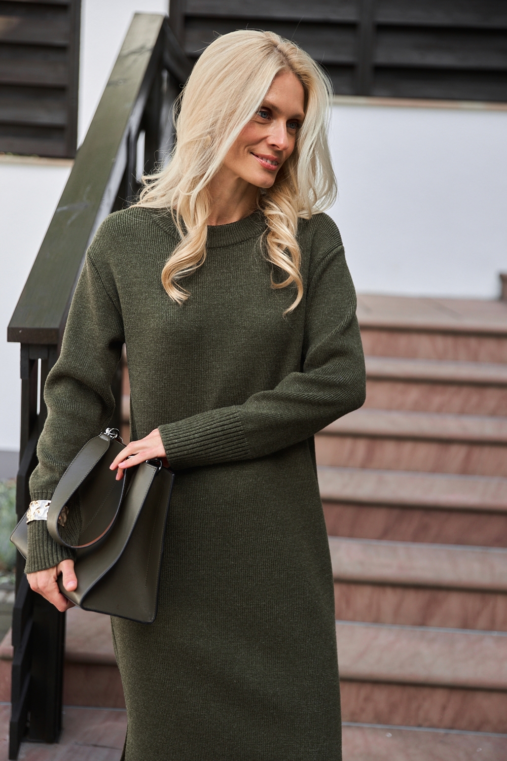 Сукня прямого силуету середньої довжини, виконана з вовняної пряжі щільного, гладкого плетіння.