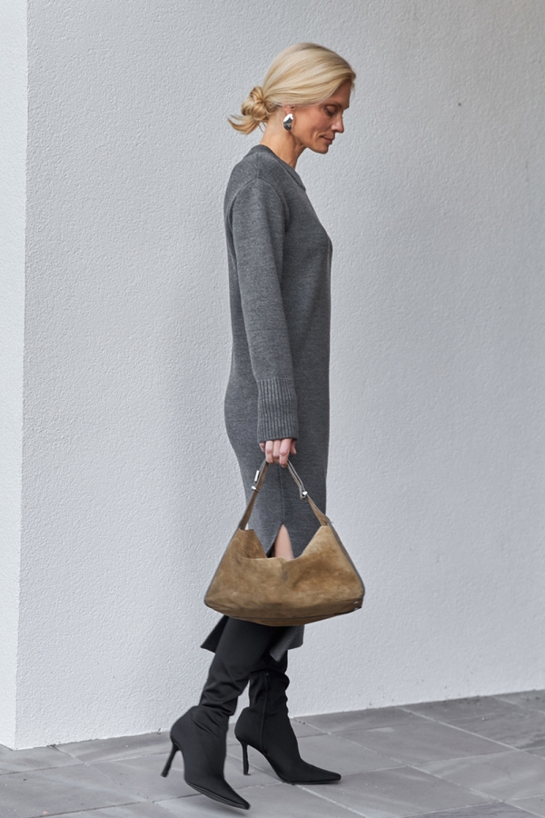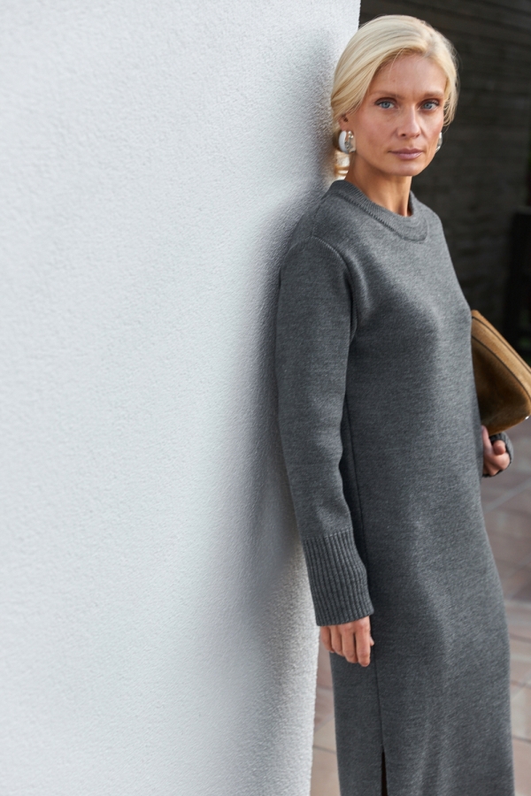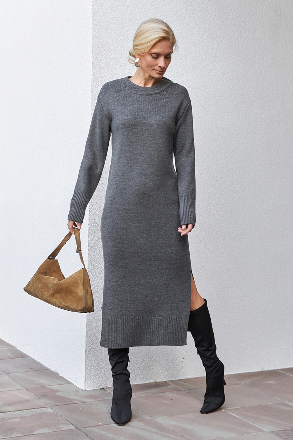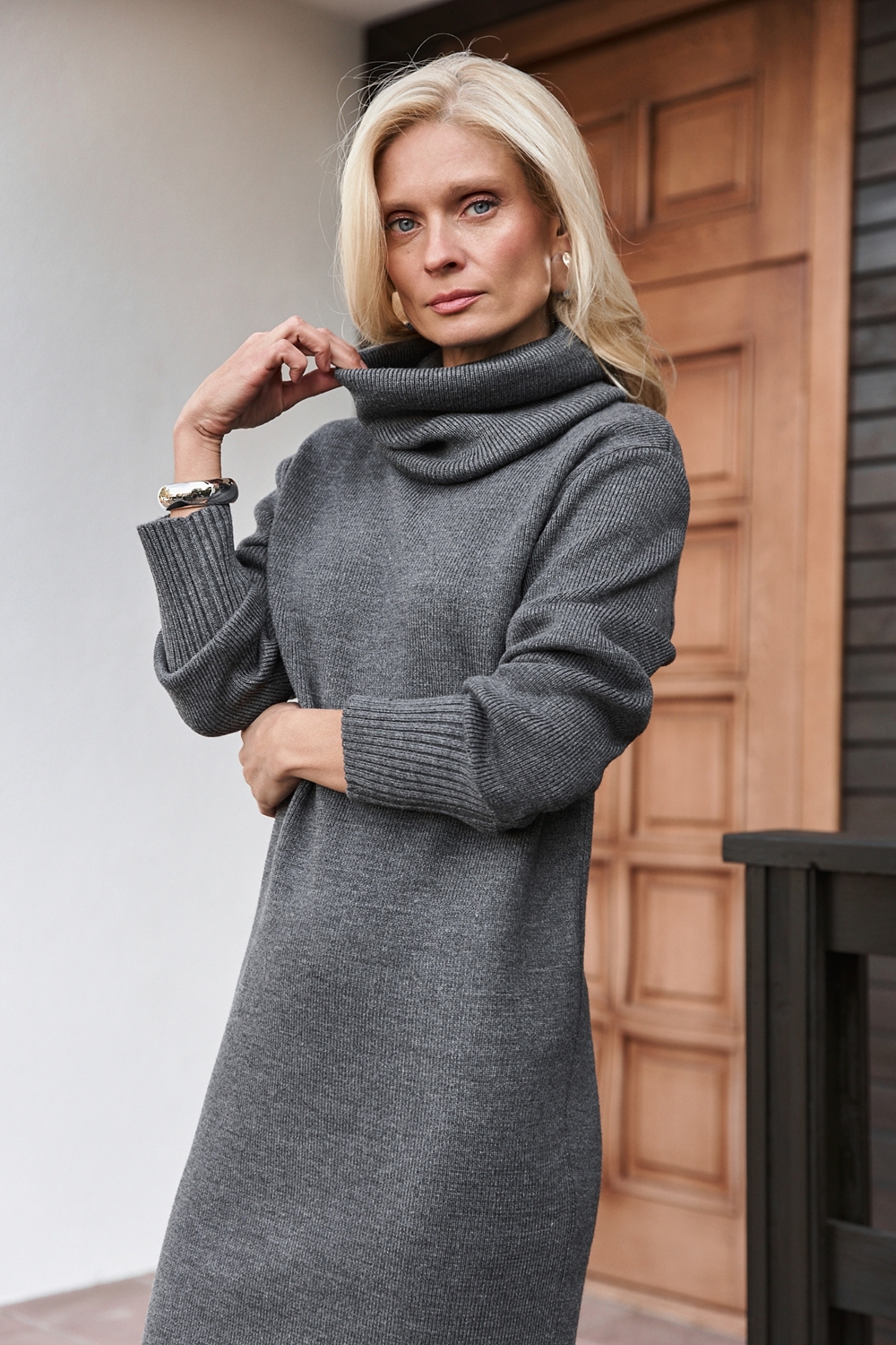 Сукня прямого силуету середньої довжини, виконана з вовняної пряжі щільного, гладкого плетіння.