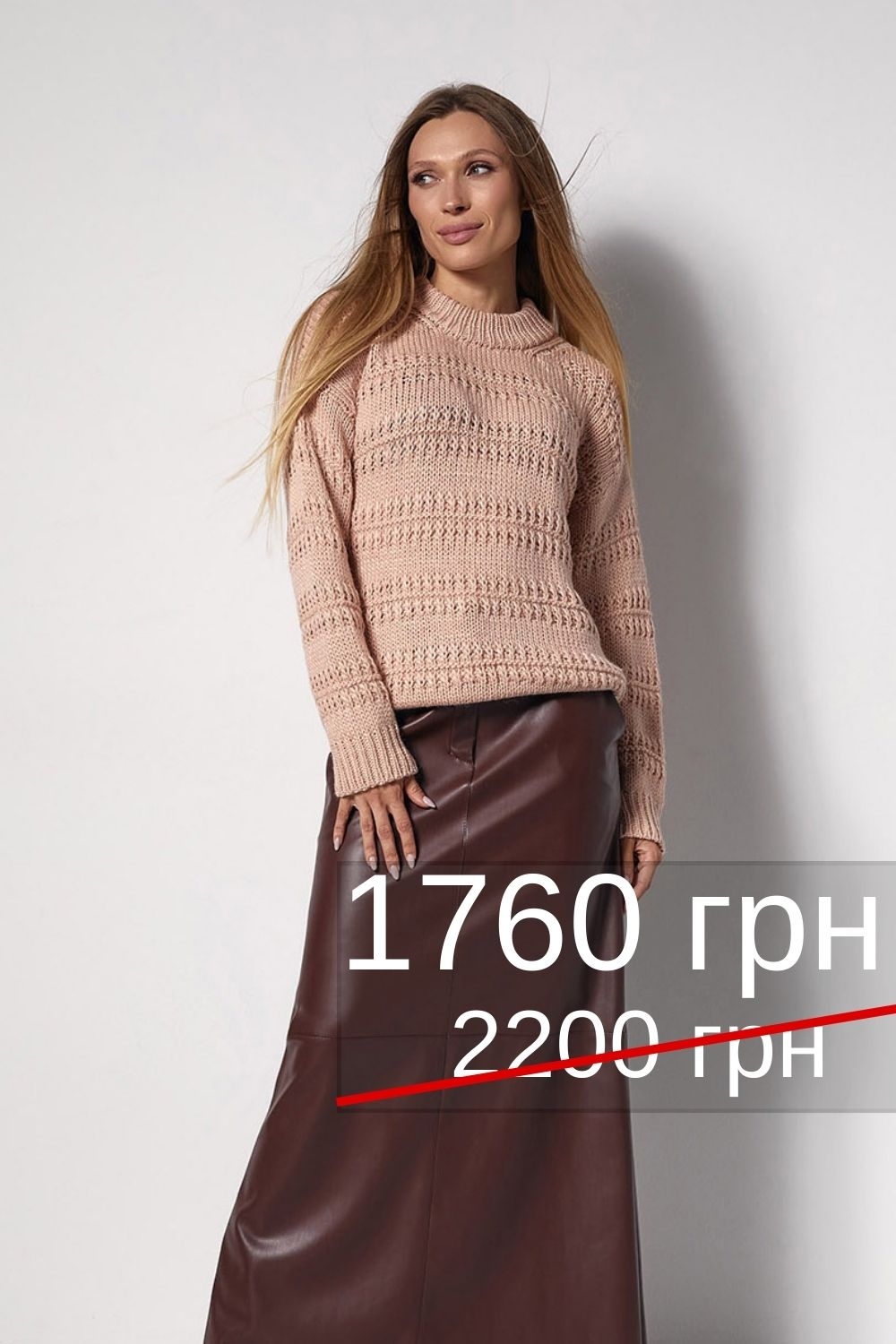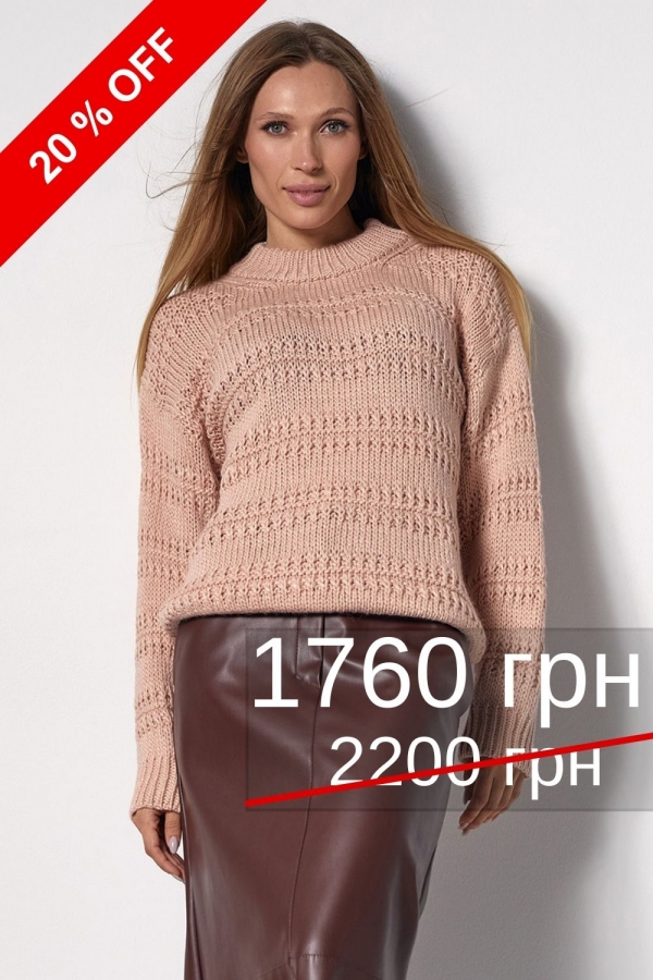 Светр з натуральної вовняної пряжі оздоблений ажурними горизонтальними лініями. Легкий оверсайз, зручні резинки на манжетах та по низу виробу.