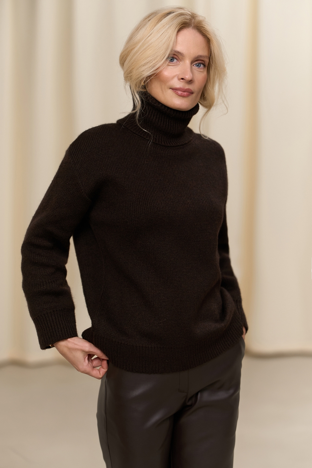 Базовий светр з тонкої пряжі з включенням волокон вовни та мохеру. Об'ємний силует та гладка в'язка створюють відчуття легкості та невагомості виробу.
