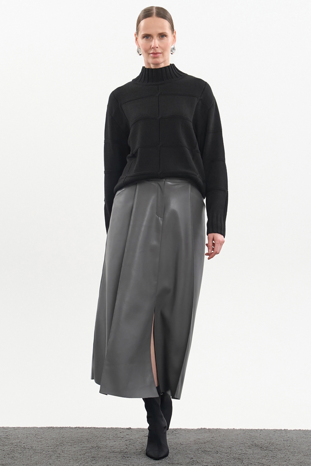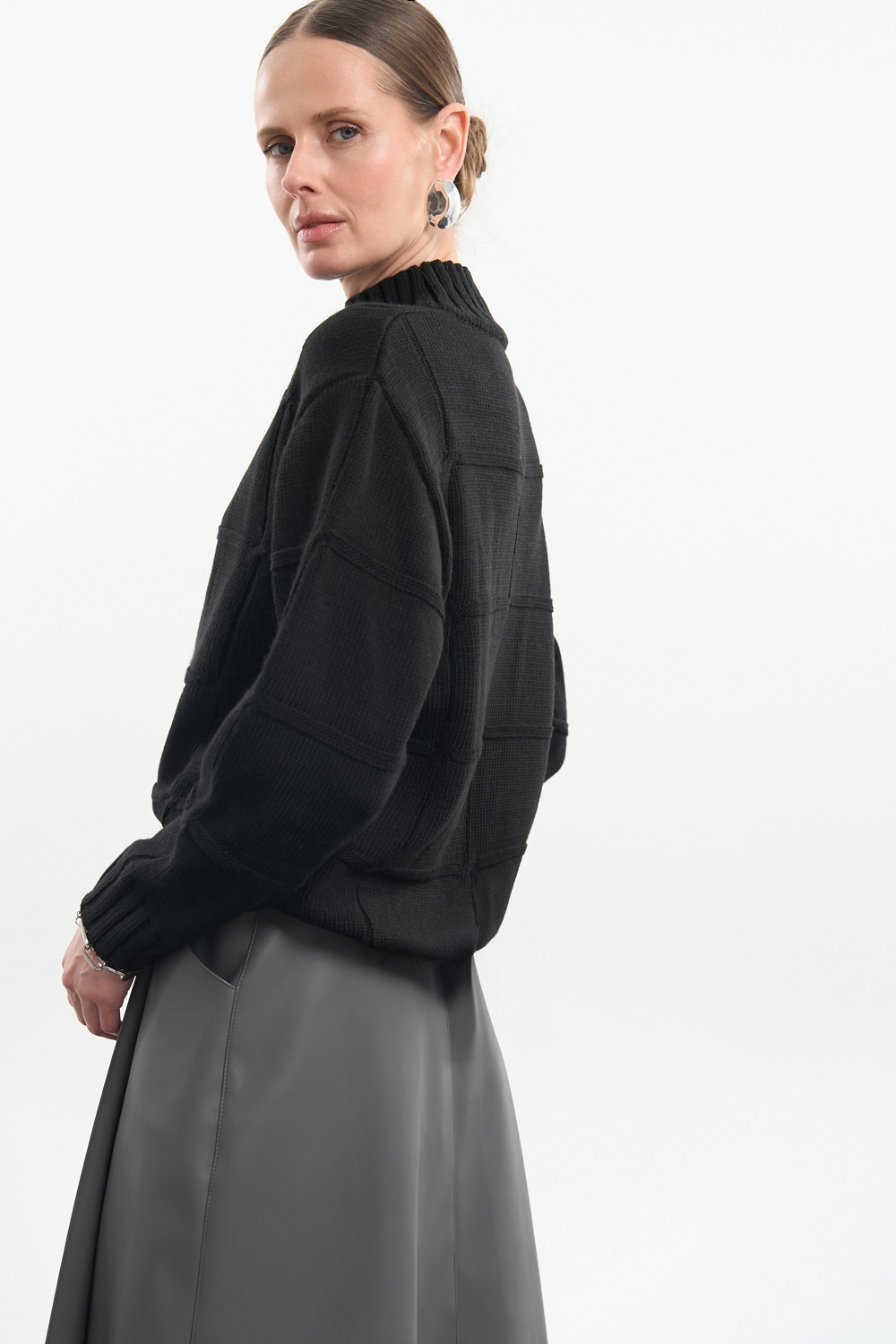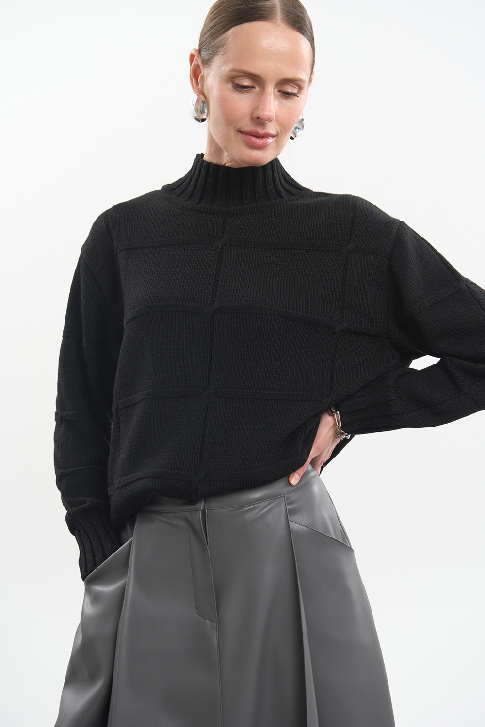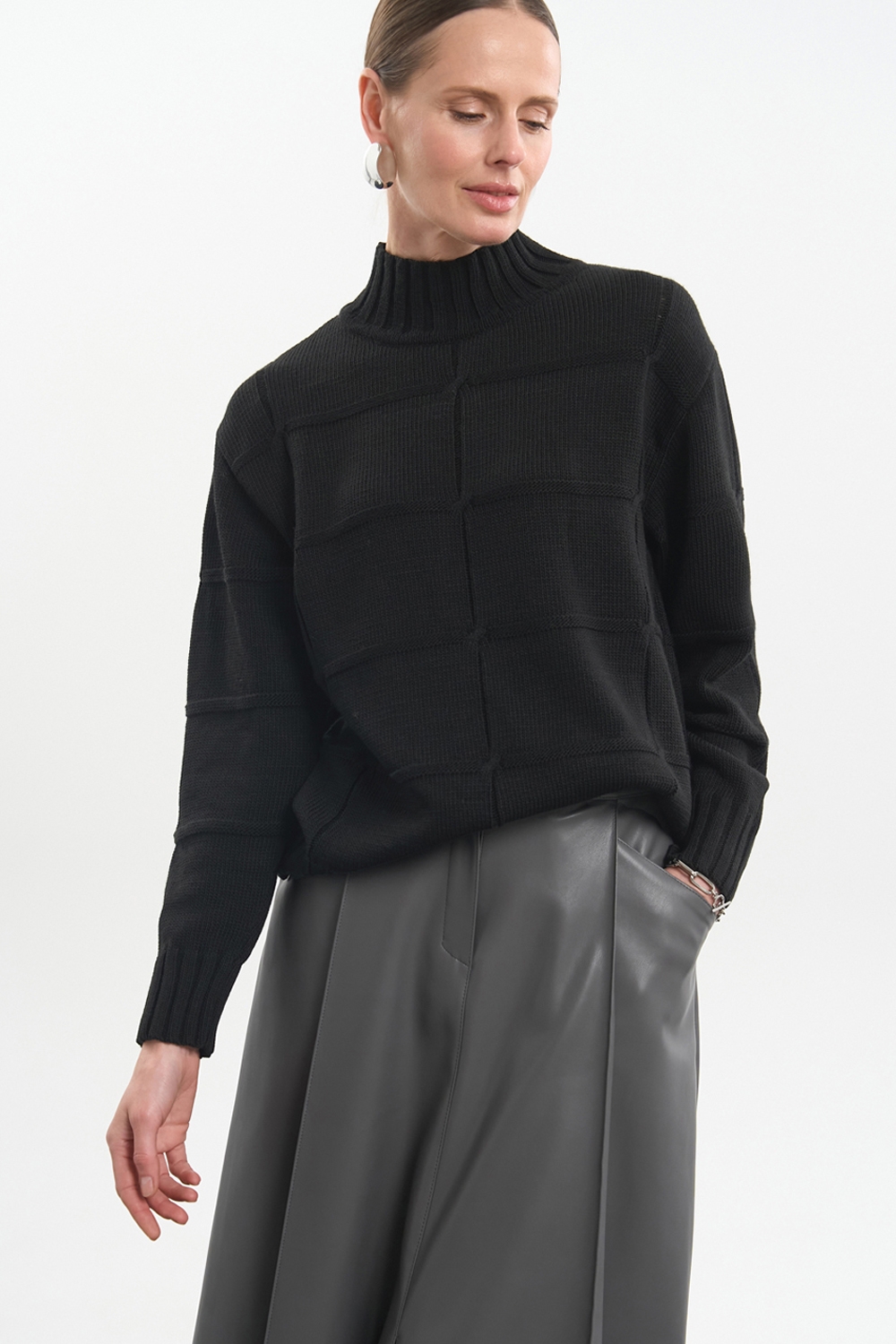 Стильний светр у рельєфний візерунок із преміальної пряжі з включенням вовни. Пластичне та стабільне переплетіння, що гарно тримає форму.