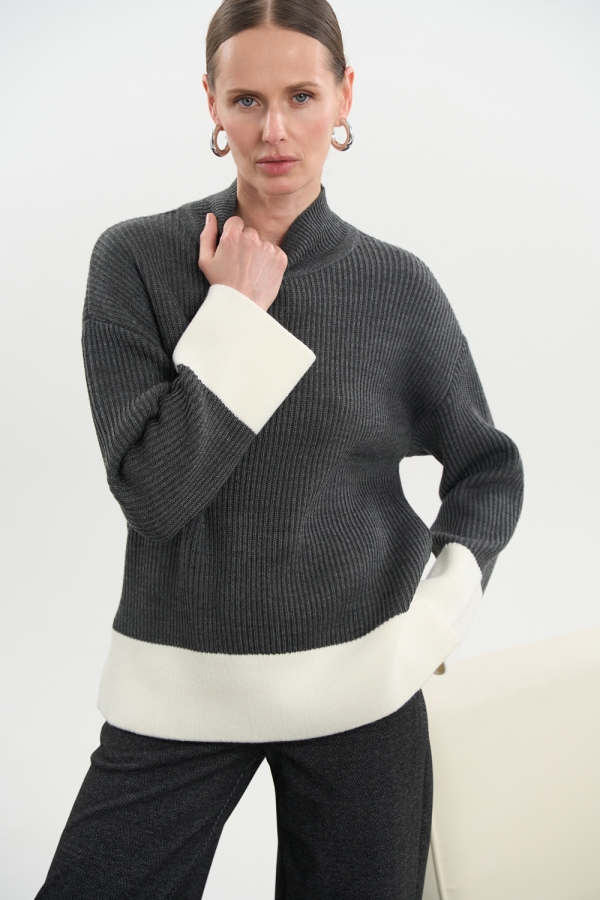 Подовжений светр з контрастними деталями зі змішаної пряжі з включенням вовни. Об'ємний прямий силует, гладке переплетення, бічні розрізи та комфортна горловина-стійка.