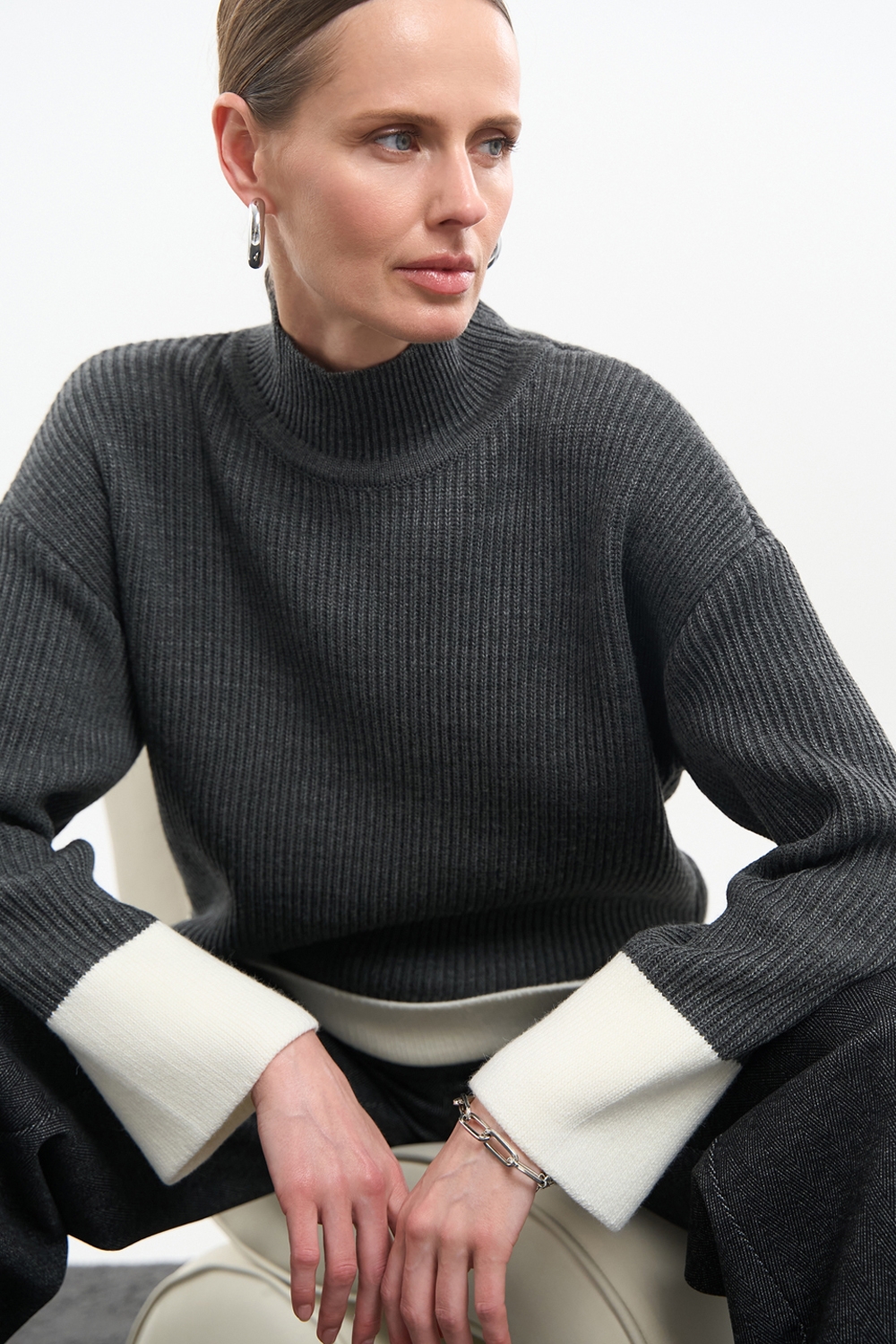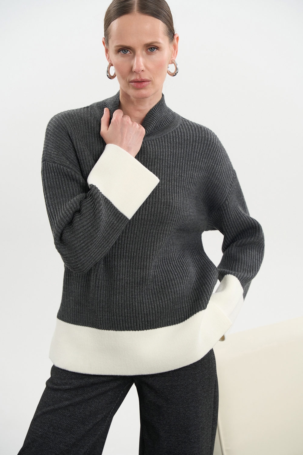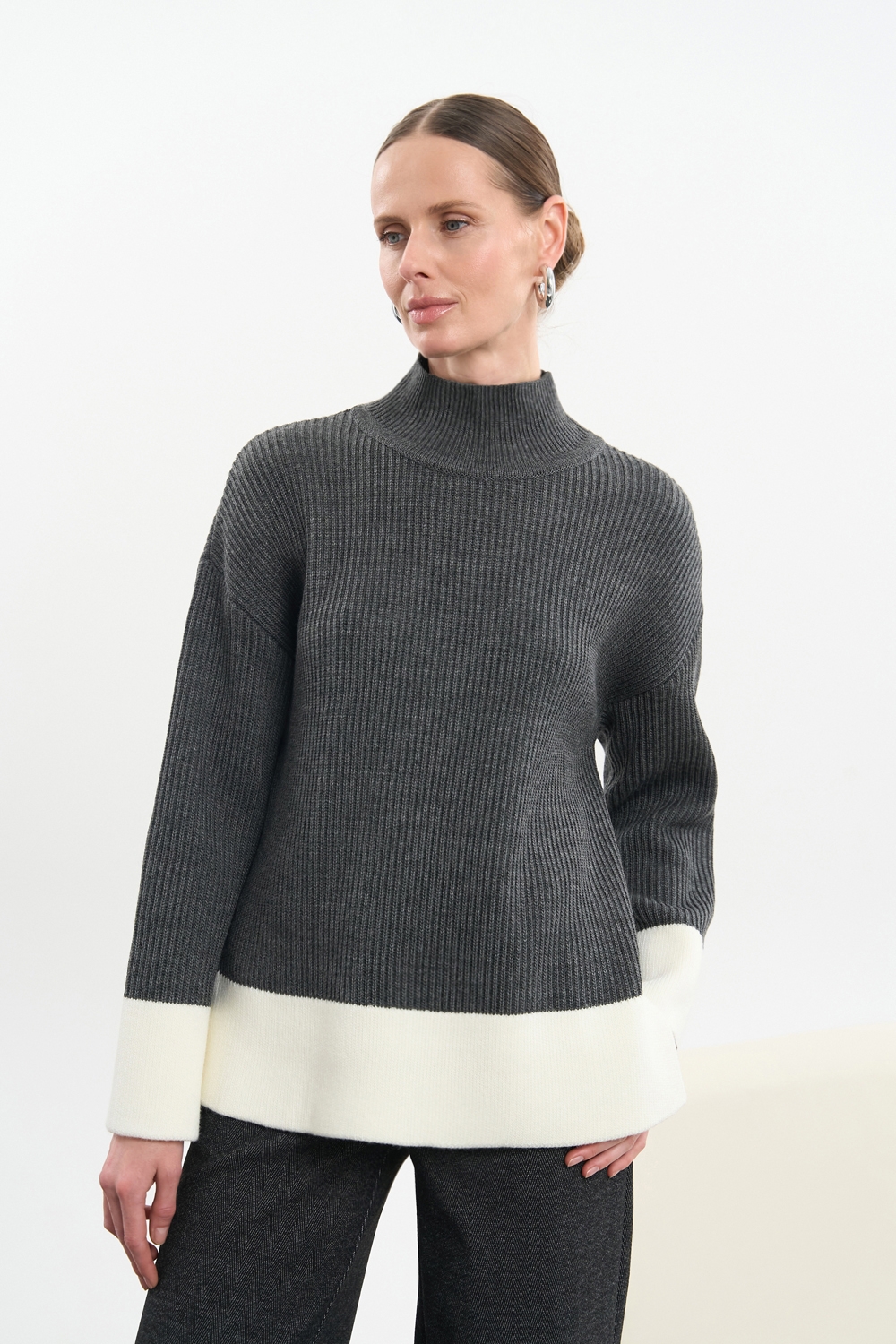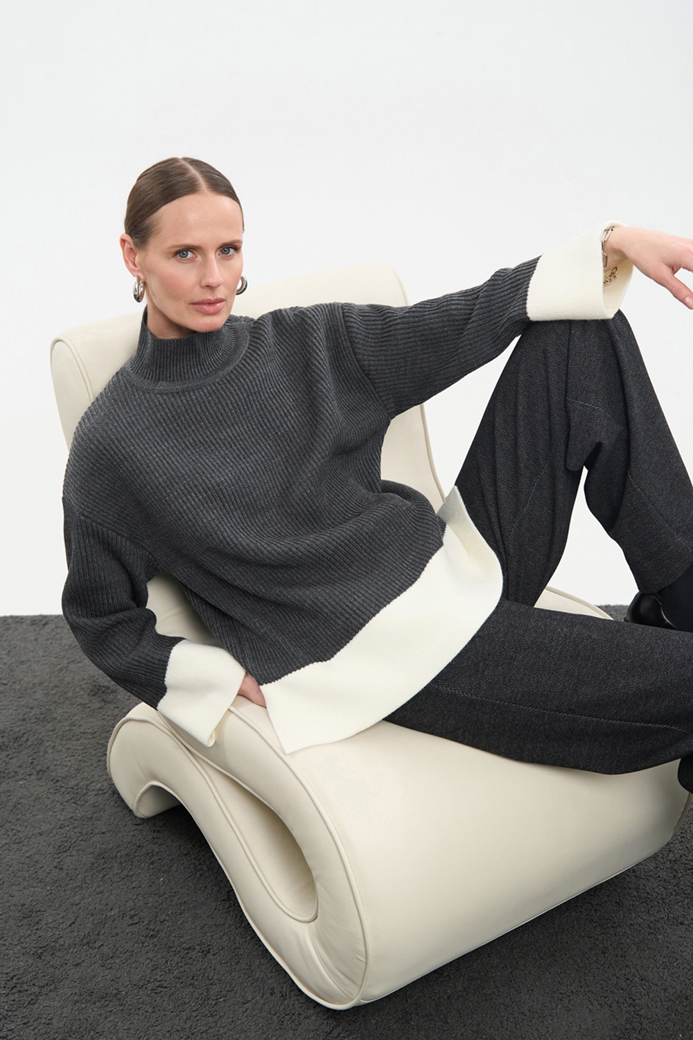 Подовжений светр з контрастними деталями зі змішаної пряжі з включенням вовни. Об'ємний прямий силует, гладке переплетення, бічні розрізи та комфортна горловина-стійка.