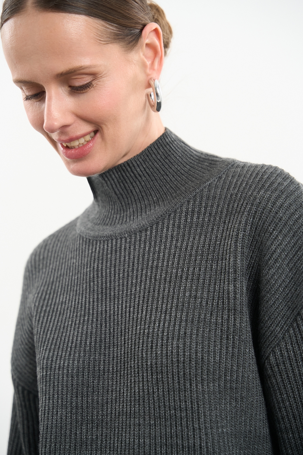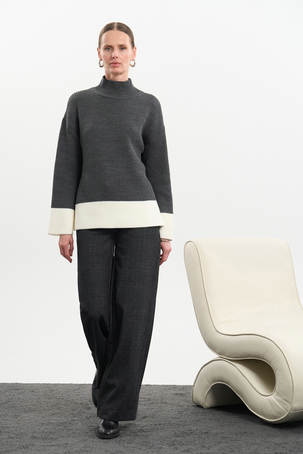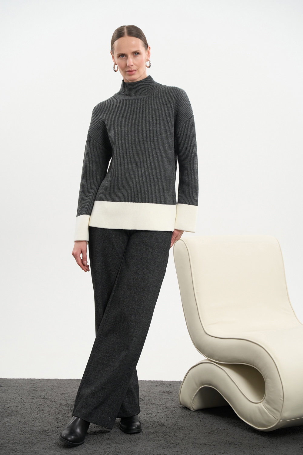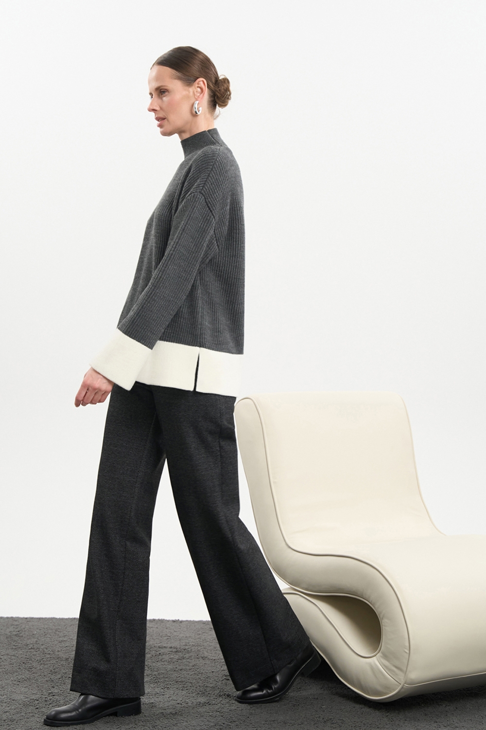 Подовжений светр з контрастними деталями зі змішаної пряжі з включенням вовни. Об'ємний прямий силует, гладке переплетення, бічні розрізи та комфортна горловина-стійка.