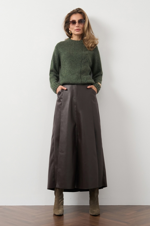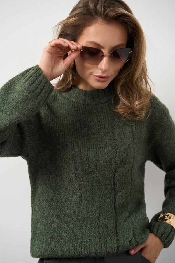 Затишний светр з ніжної вовняної пряжі. Спущена лінія плеча та комфортний рукав. Акцент виробу - вертикальний візерунок "коса".