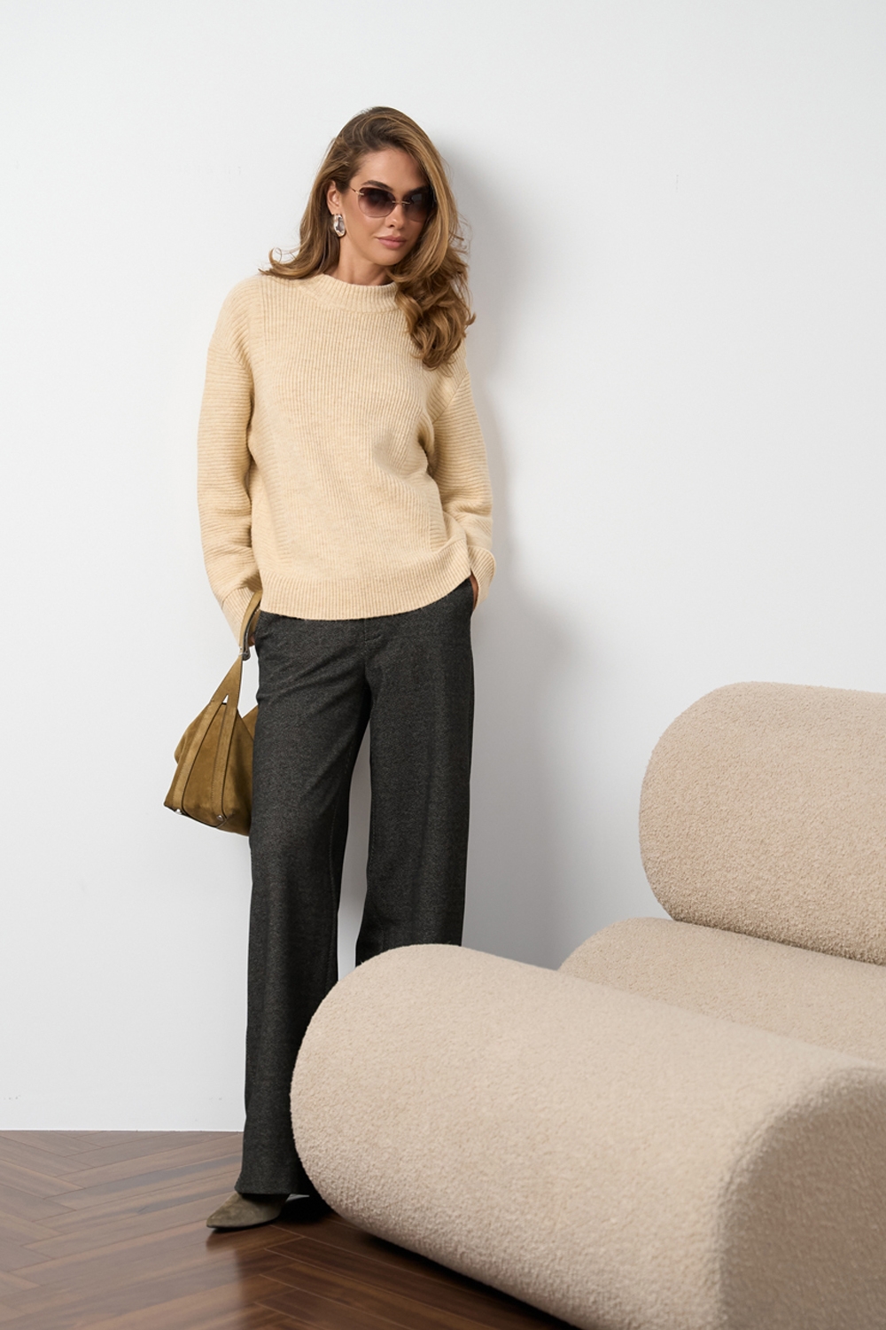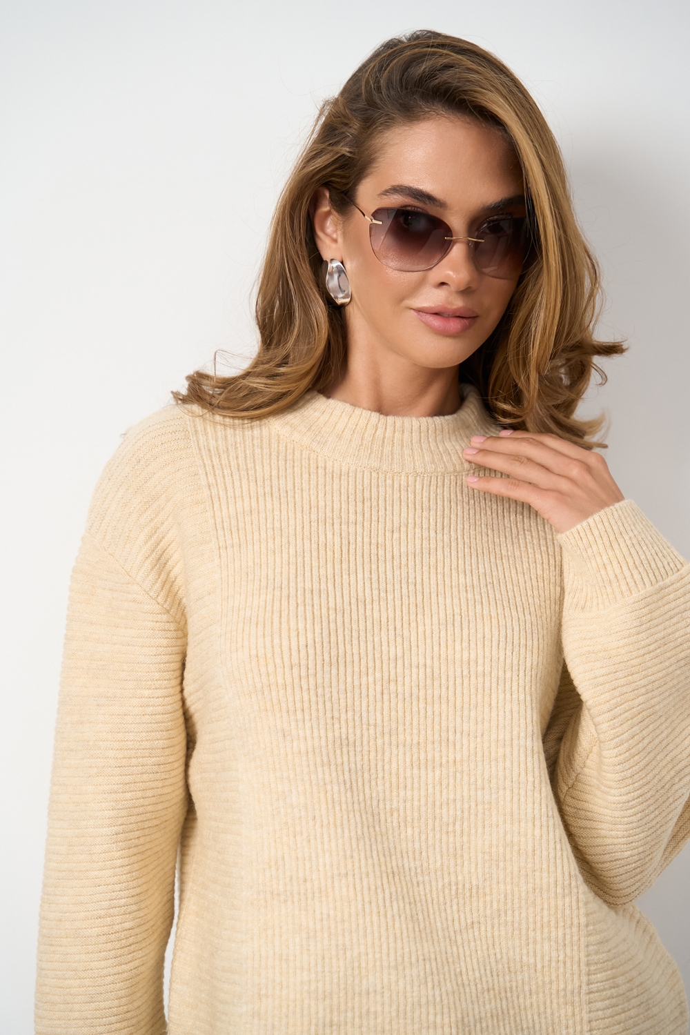 Светр вільного крою у фактурному тонкому стабільному переплетенні. Виконаний з теплої вовняної пряжі з включенням мохеру та лайкри. Стильне поєднання горизонтального та вертикального візерунку.