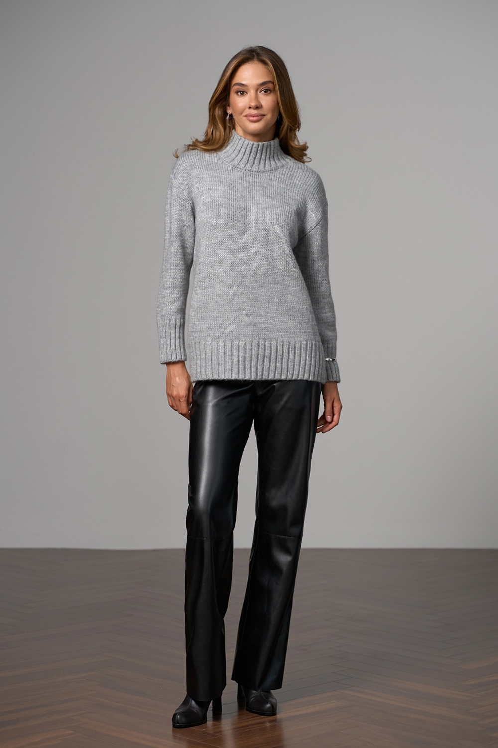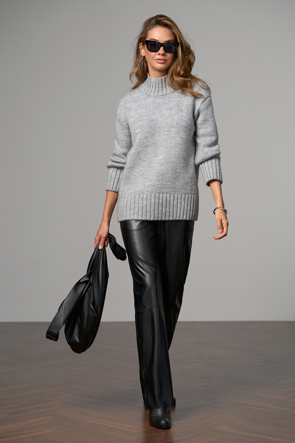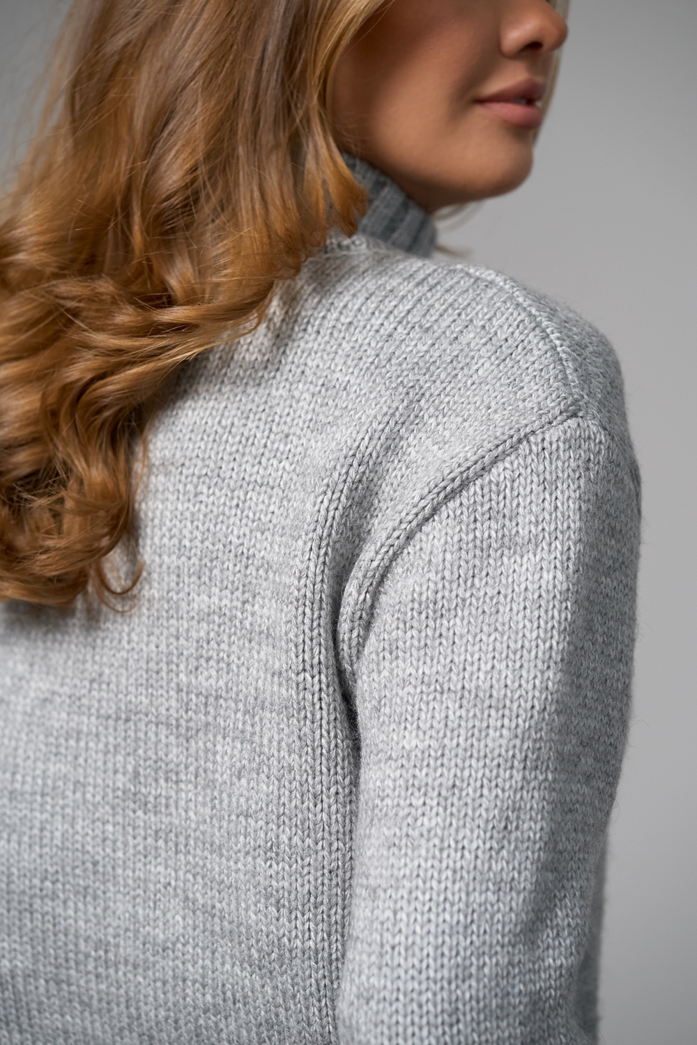 Теплий светр вільного силуету виконаний гладким стабільним плетінням із пряжі з високим вмістом вовни. Спущена лінія плеча додає комфорту. Рукави, комір та низ виробу оформлені широкою в'язкою-резинкою.
