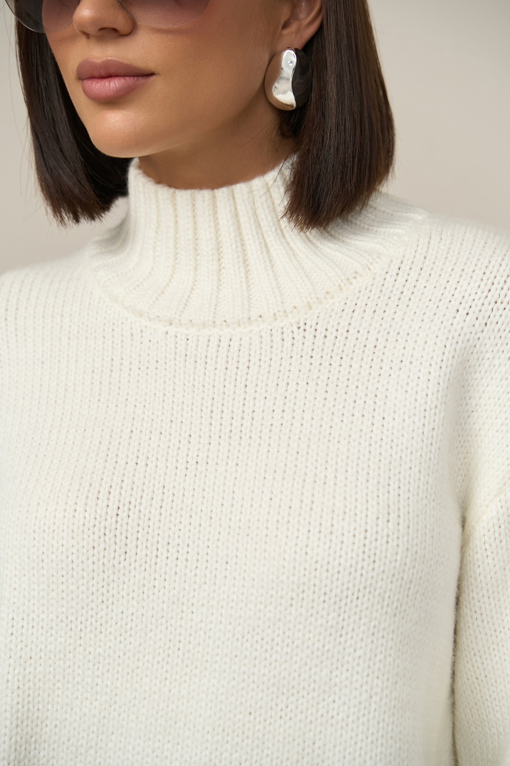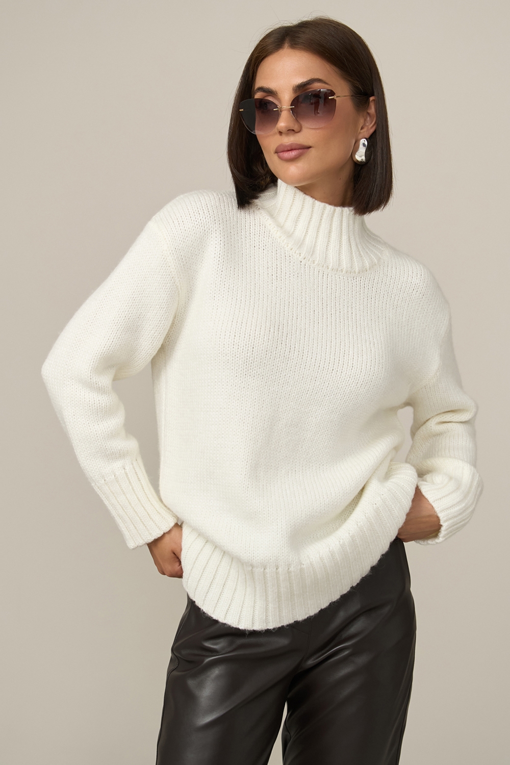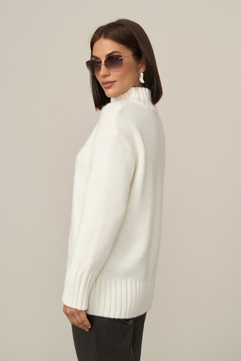 Теплий светр вільного силуету виконаний гладким стабільним плетінням із пряжі з високим вмістом вовни. Спущена лінія плеча додає комфорту. Рукави, комір та низ виробу оформлені широкою в'язкою-резинкою.