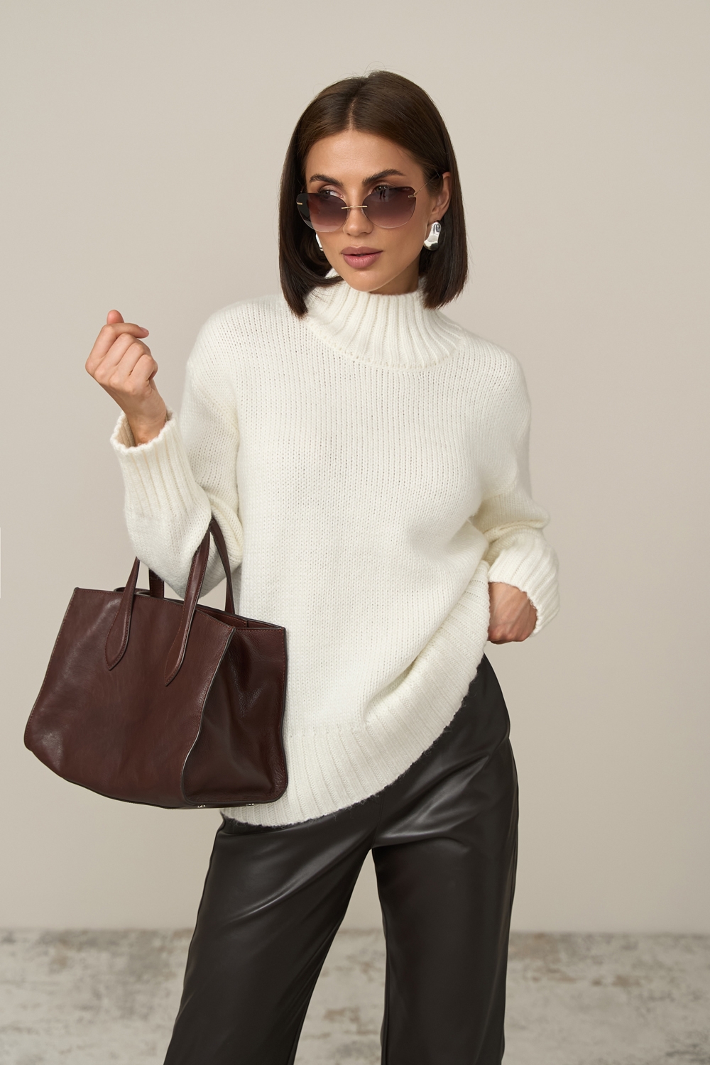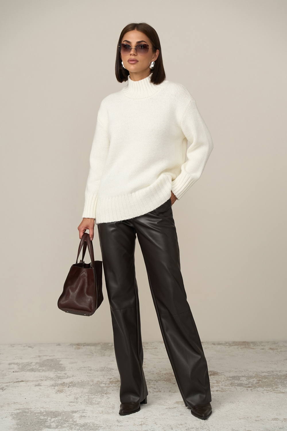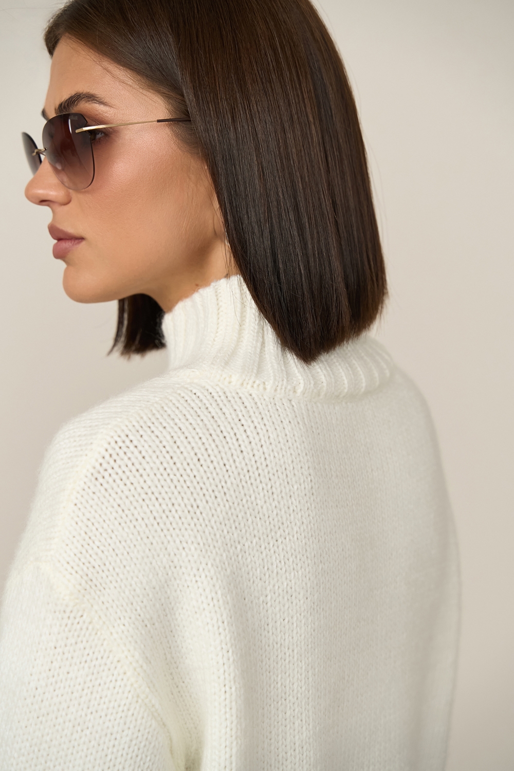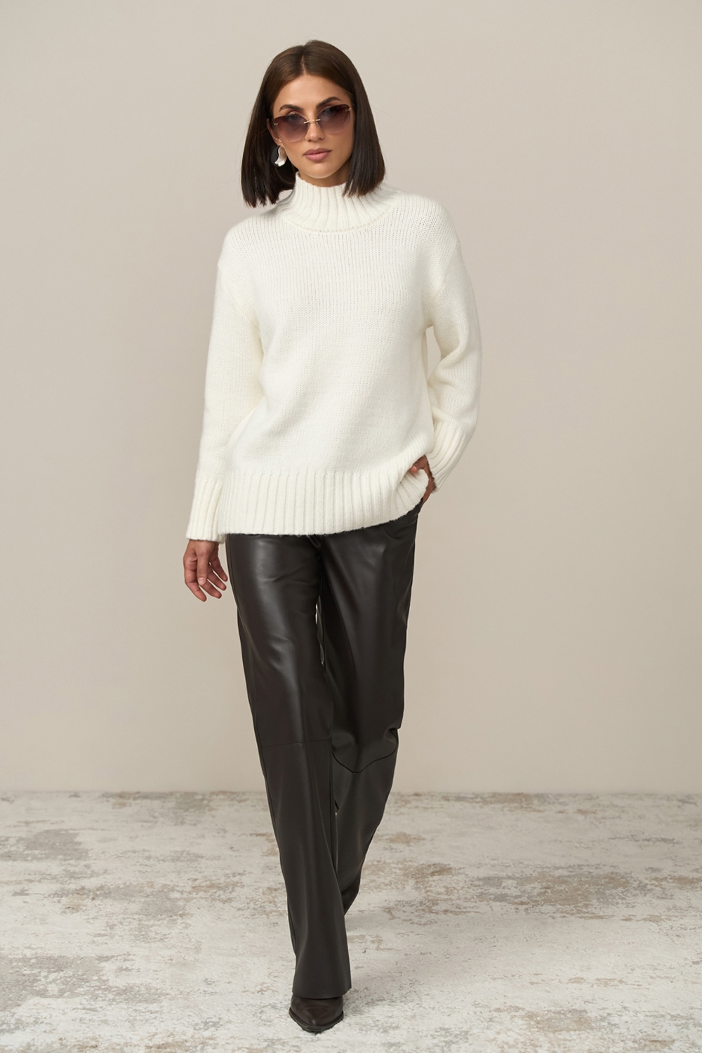 Теплий светр вільного силуету виконаний гладким стабільним плетінням із пряжі з високим вмістом вовни. Спущена лінія плеча додає комфорту. Рукави, комір та низ виробу оформлені широкою в'язкою-резинкою.
