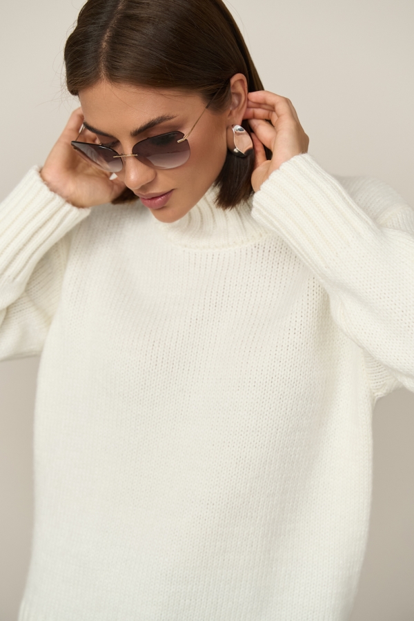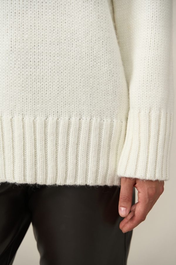 Теплий светр вільного силуету виконаний гладким стабільним плетінням із пряжі з високим вмістом вовни. Спущена лінія плеча додає комфорту. Рукави, комір та низ виробу оформлені широкою в'язкою-резинкою.