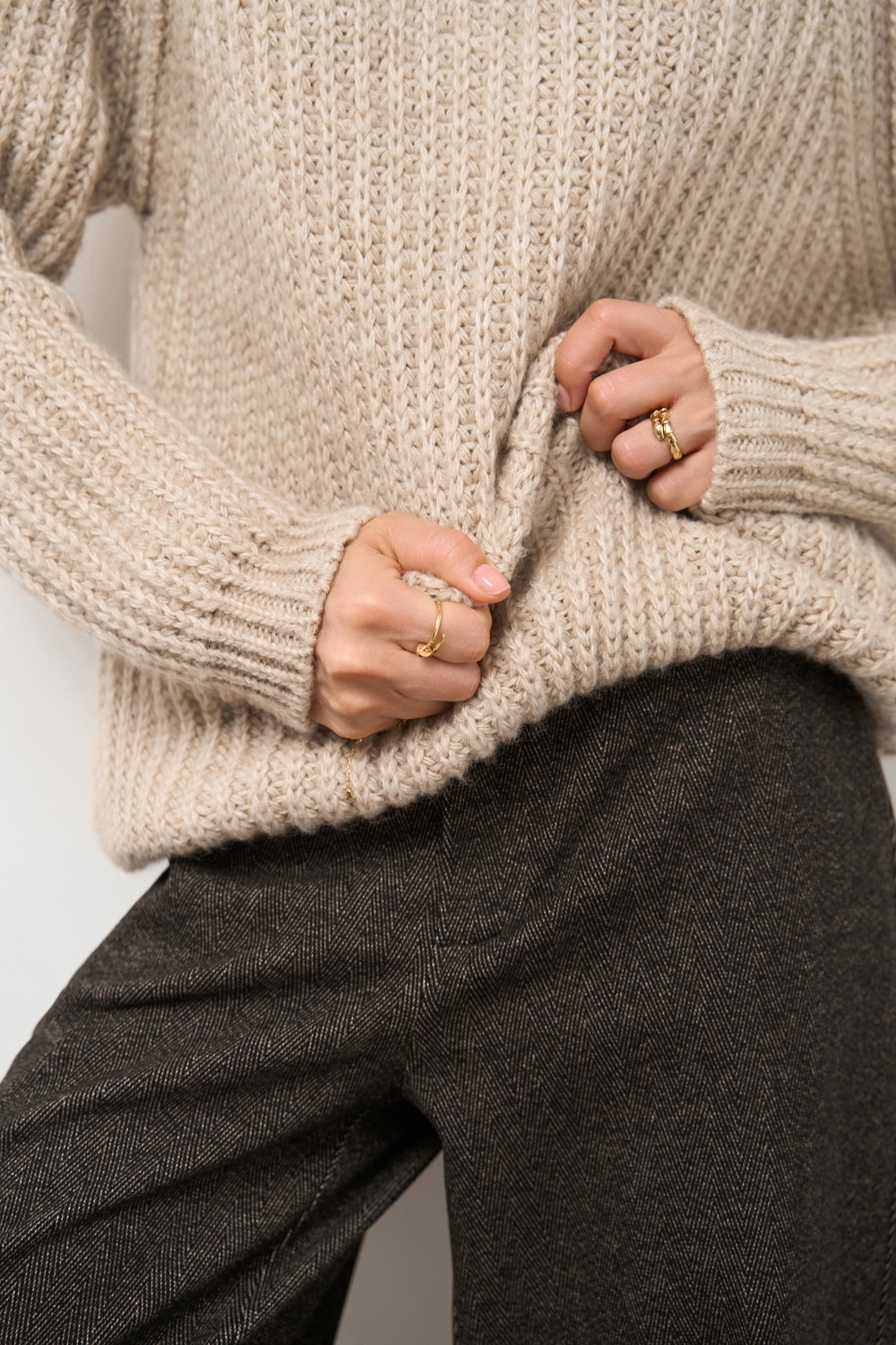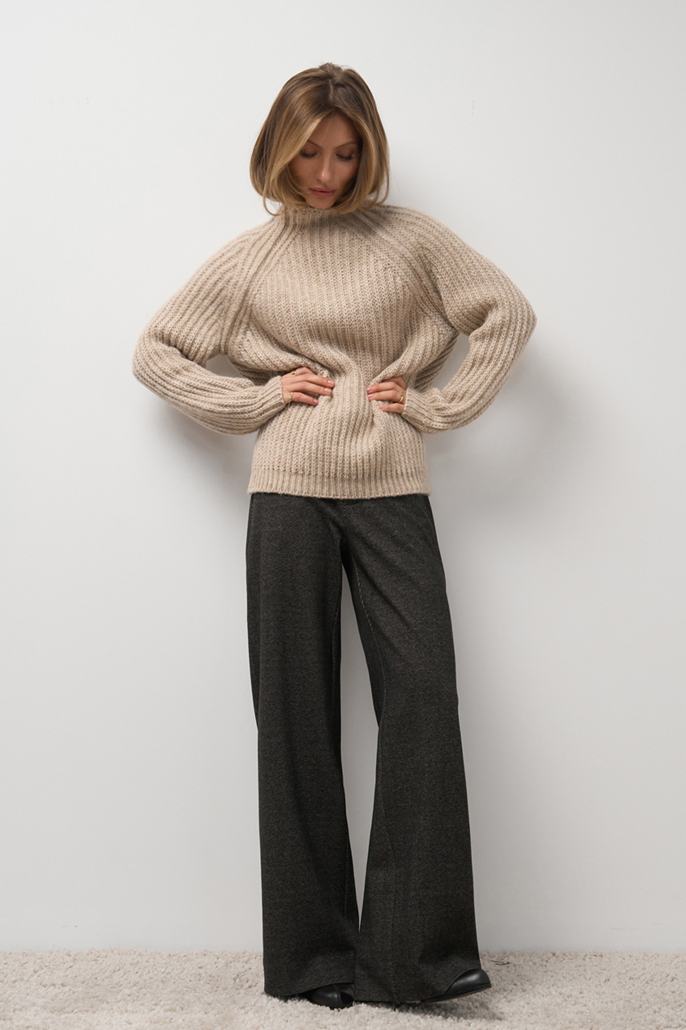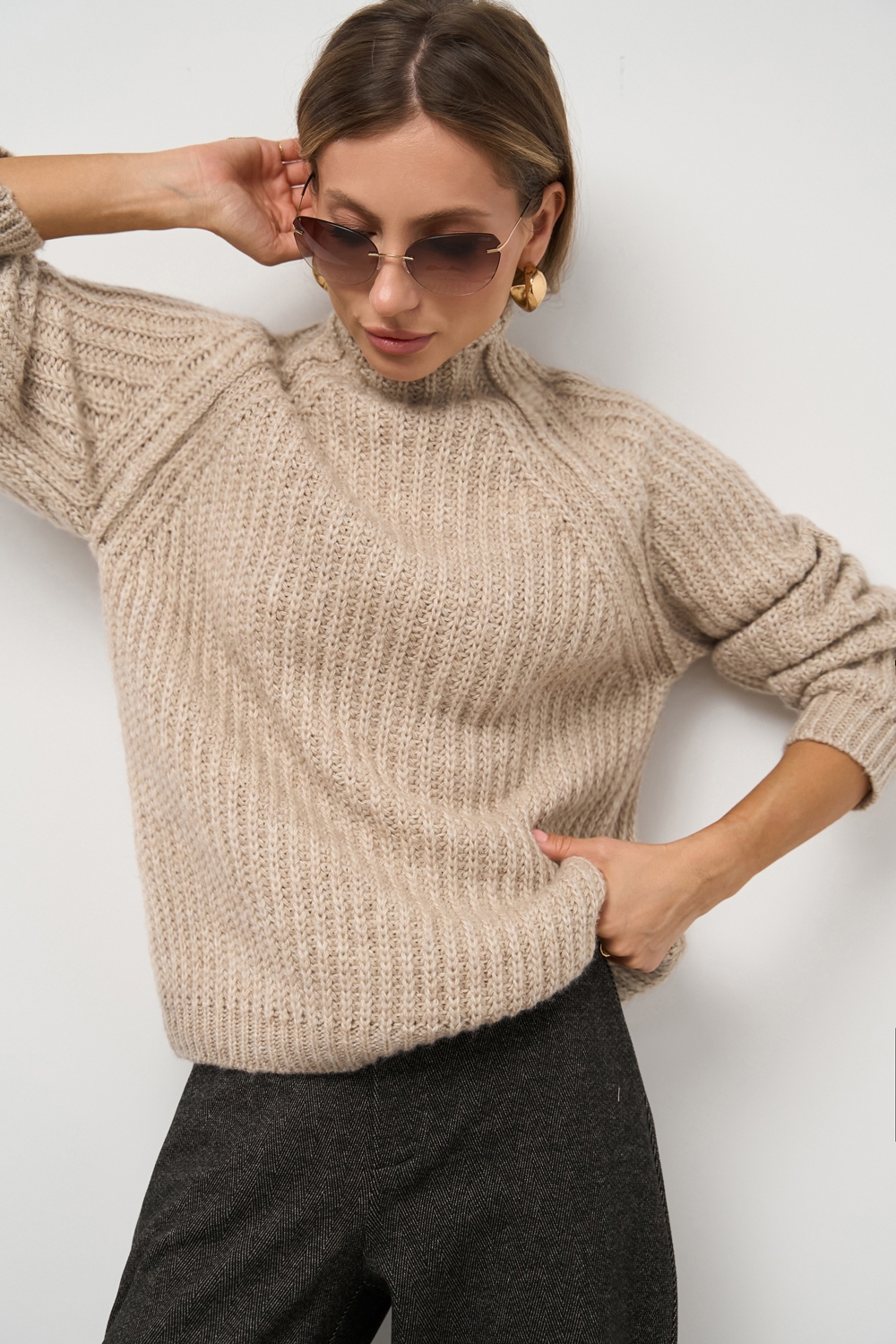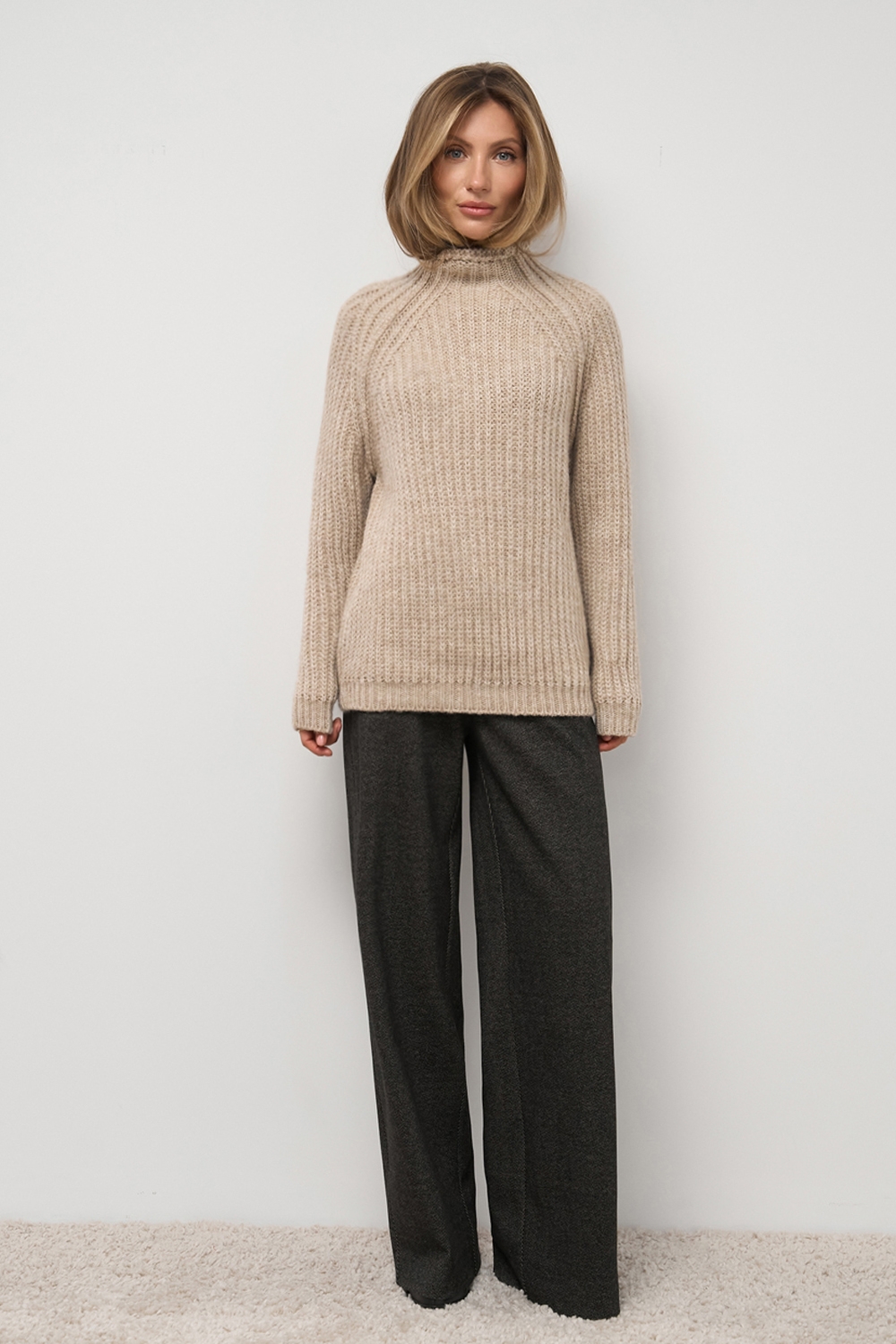 Теплий светр виготовлений із пряжі з високим вмістом вовни мериноса та альпаки, м'який та приємний до тіла. Об'ємна в'язка додає стилю та затишку. Комфортний комір-стійка та рукав-реглан.