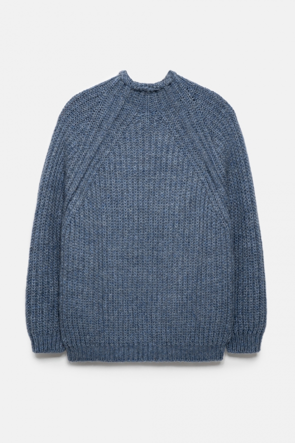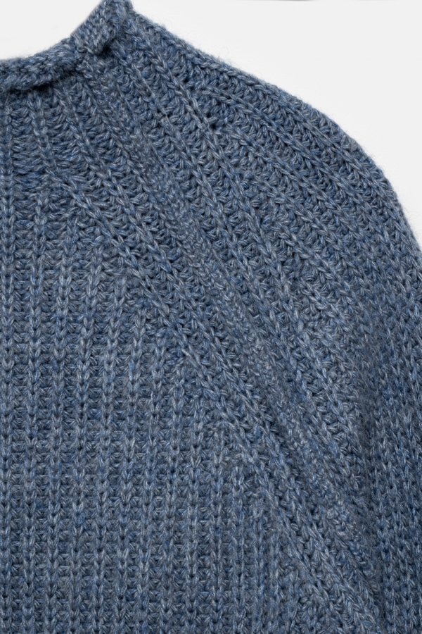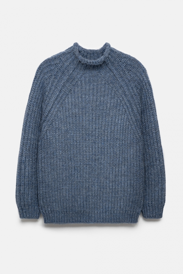 Теплий светр виготовлений із пряжі з високим вмістом вовни мериноса та альпаки, м'який та приємний до тіла. Об'ємна в'язка додає стилю та затишку. Комфортний комір-стійка та рукав-реглан.