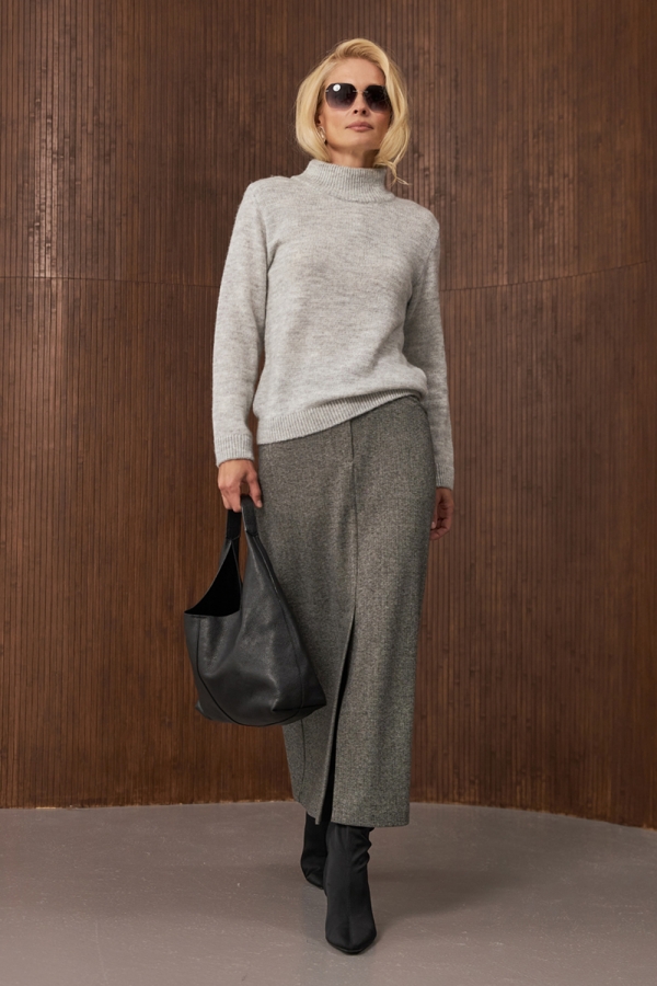 Вовняний светр із коміром-стійкою. Виріб вільного силуету зі спущеною лінією плеча. Виріб виконаний тонкою, гладкою в'язкою із преміальної пряжі, що містить вовну мериноса, альпаки та мохер.
