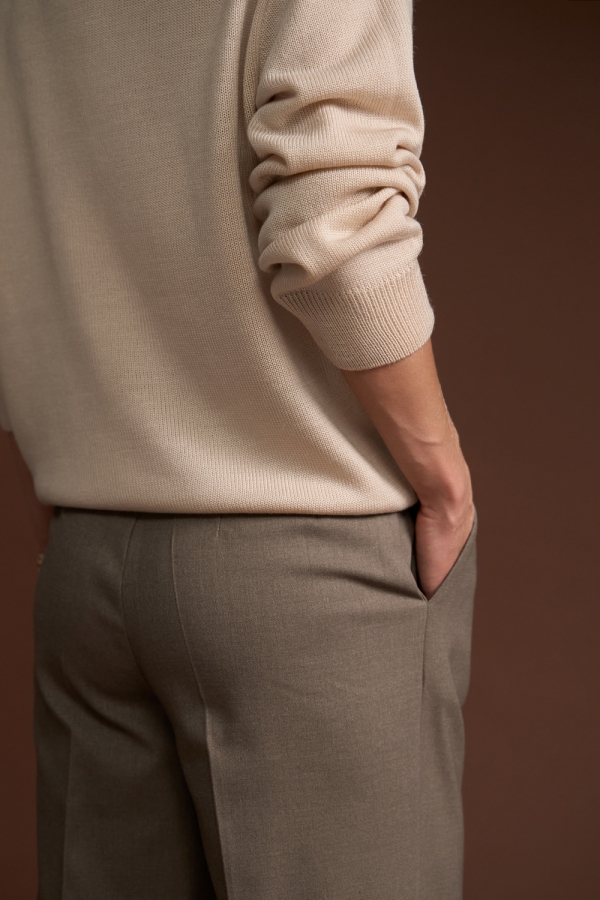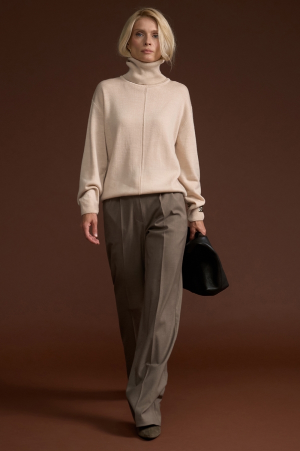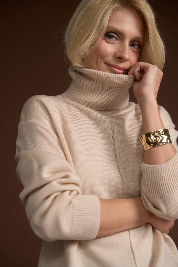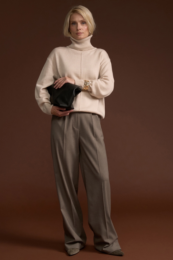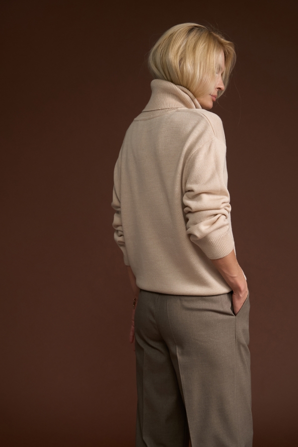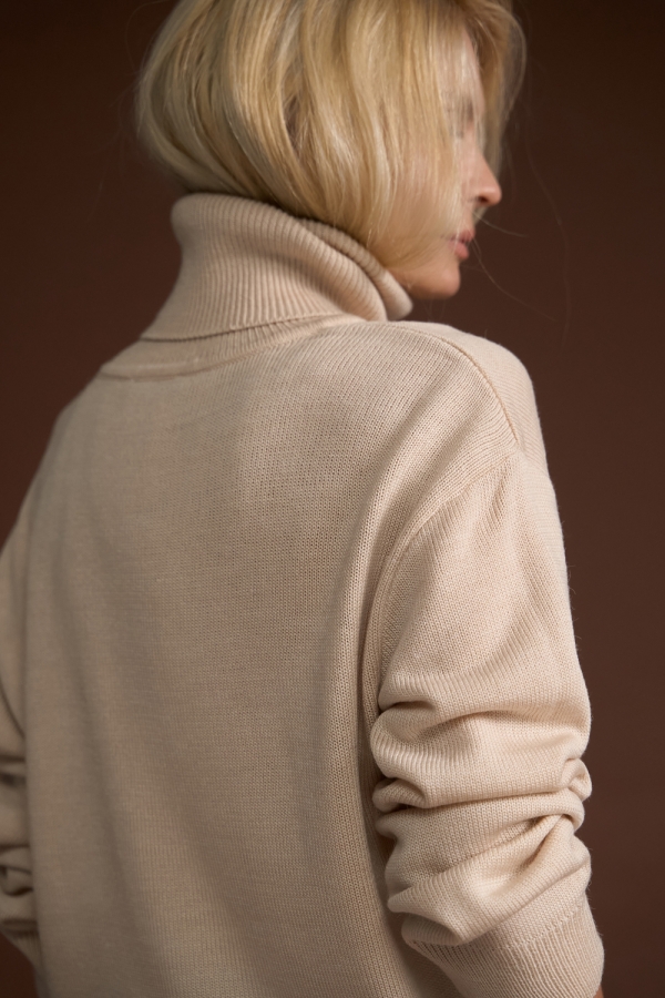 Елегантний светр виготовлений із напіввовняної пряжі, у гладкому плетінні середньої щільності. Високий комір-хомут додає затишку. Лаконічний, вертикальний візерунок візуально видовжує силует.