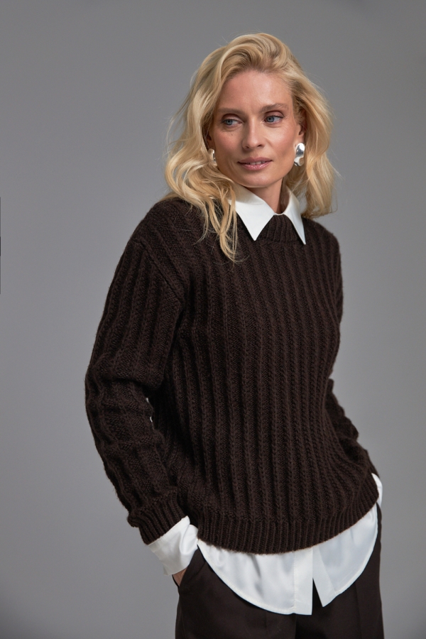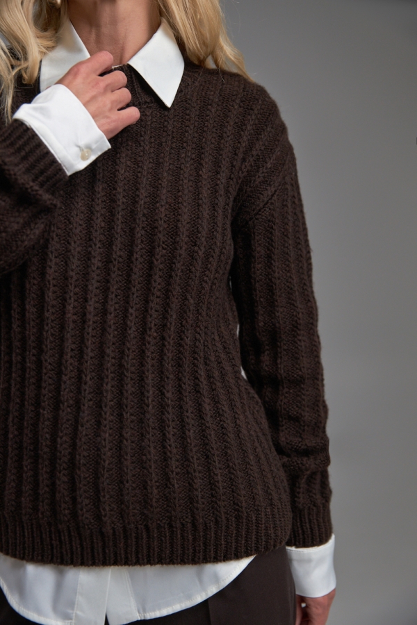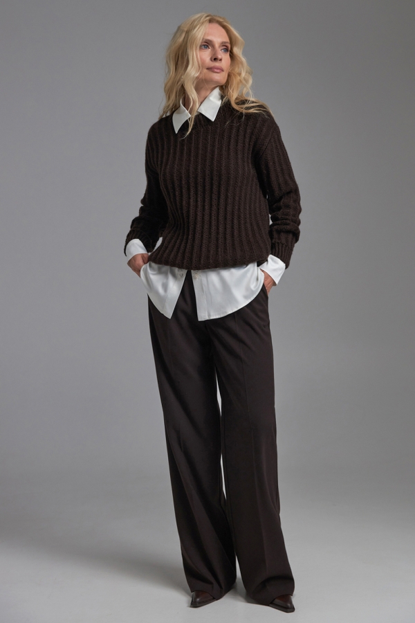 Трендовий вкорочений светр, виконаний щільною в’язкою з вертикальним візерунком. Теплий, м’який і чудово тримає форму завдяки високому вмісту мериносової вовни та альпаки. Рукави та низ виробу оформлені фіксуючими манжетами-резинками.