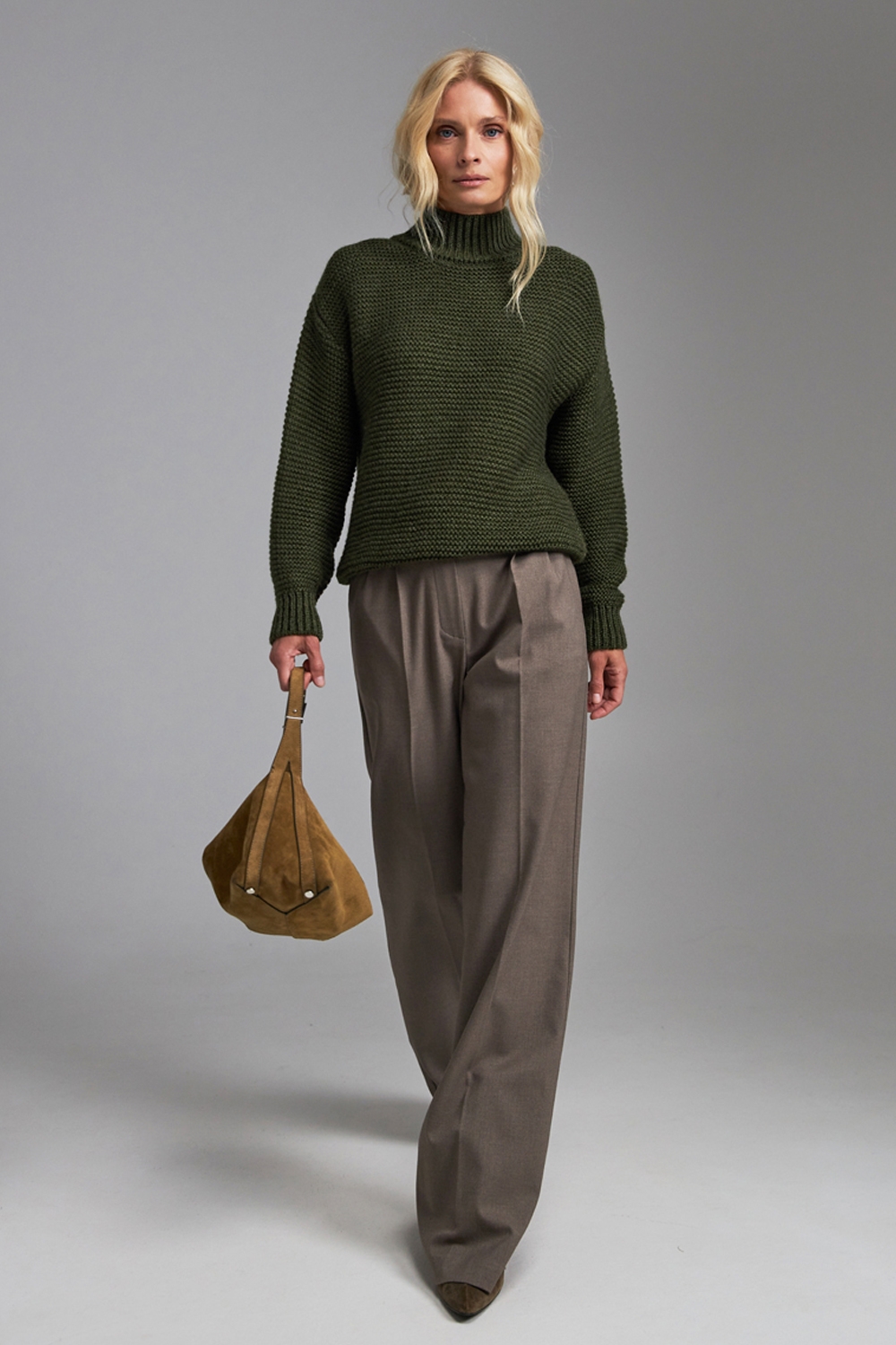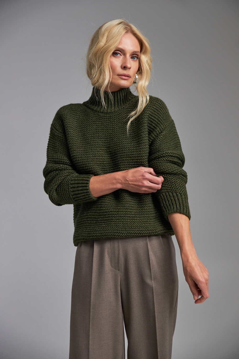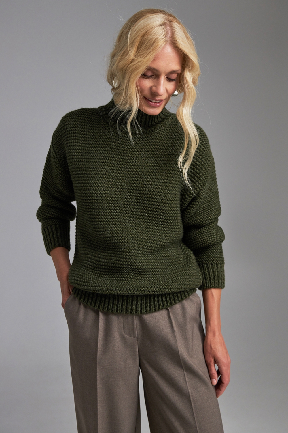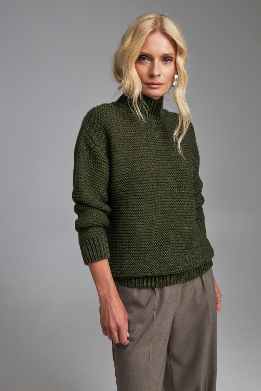 Лаконічний светр з акуратним коміром-стійкою, виконаний щільною фактурною в’язкою з напіввовняної пряжі. Вільний силует, м’яка лінія плеча та манжети-резинки забезпечують зручну посадку.