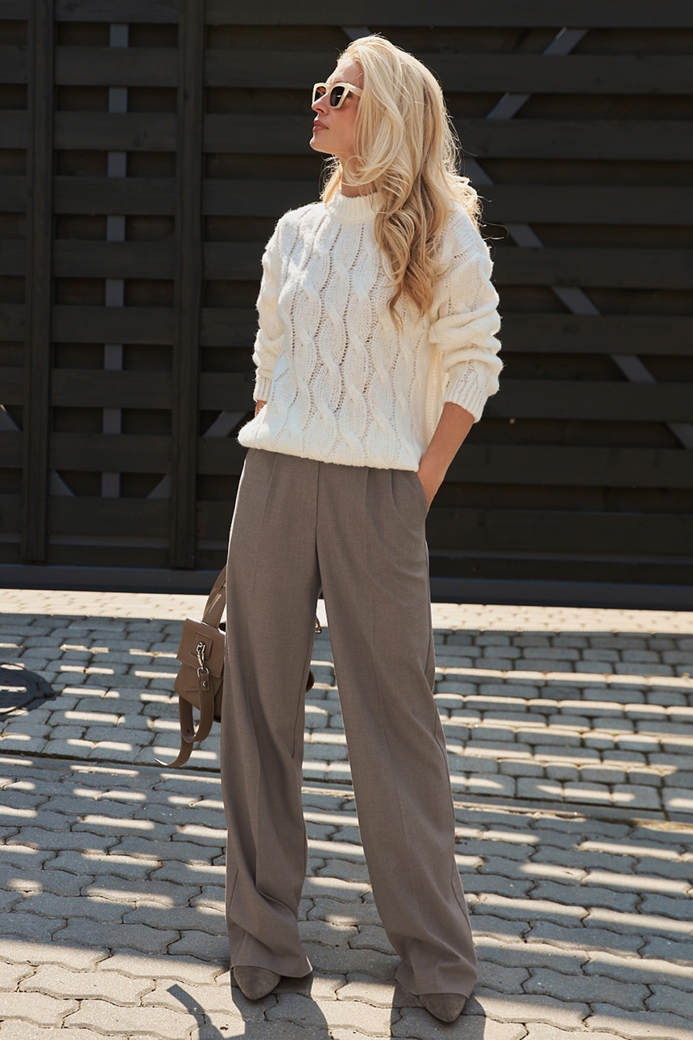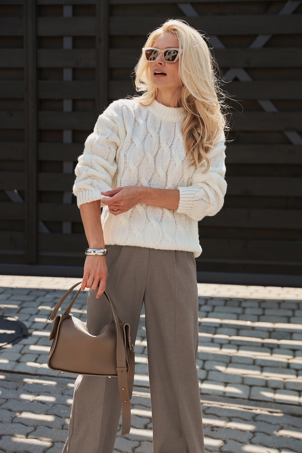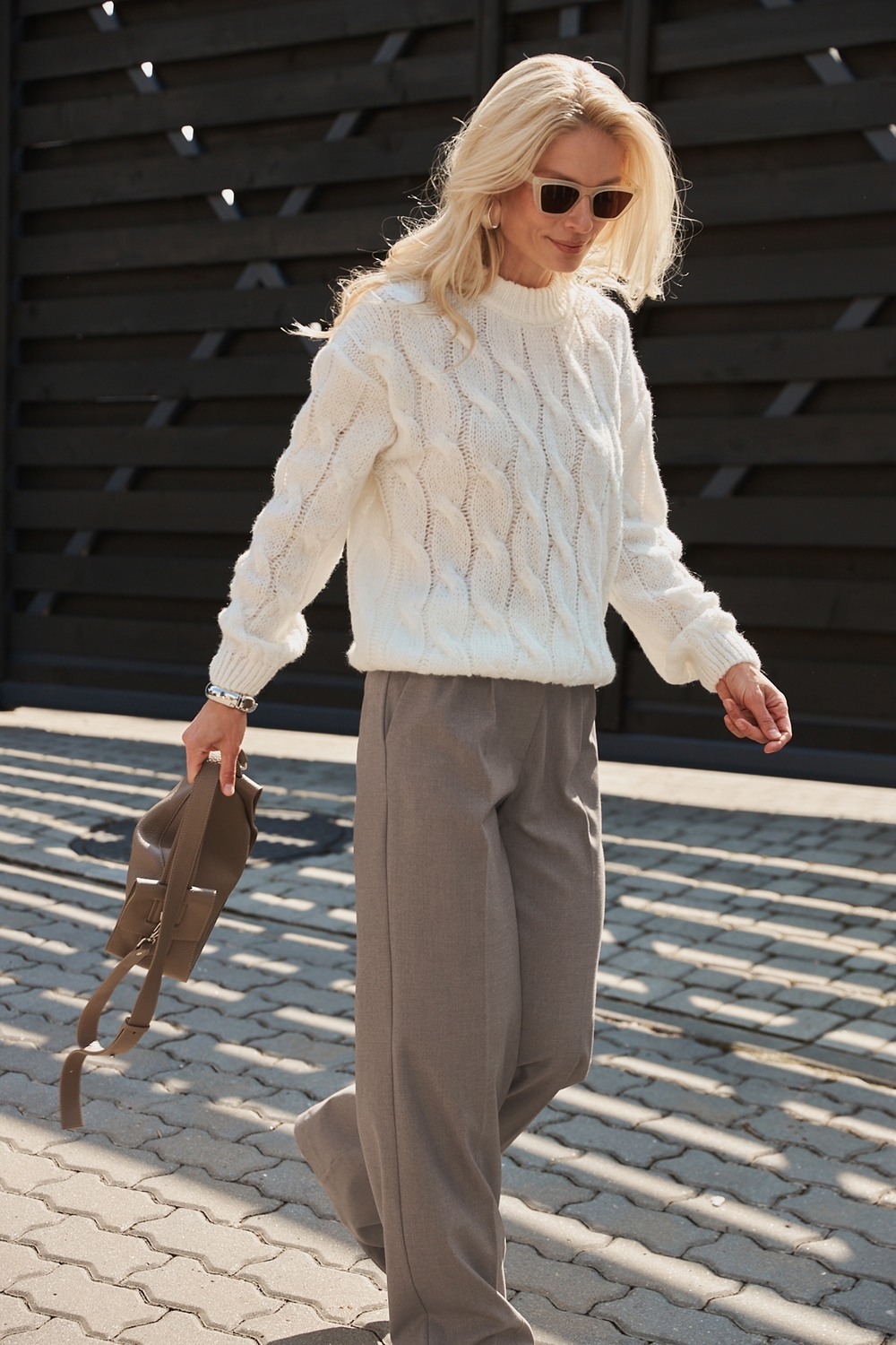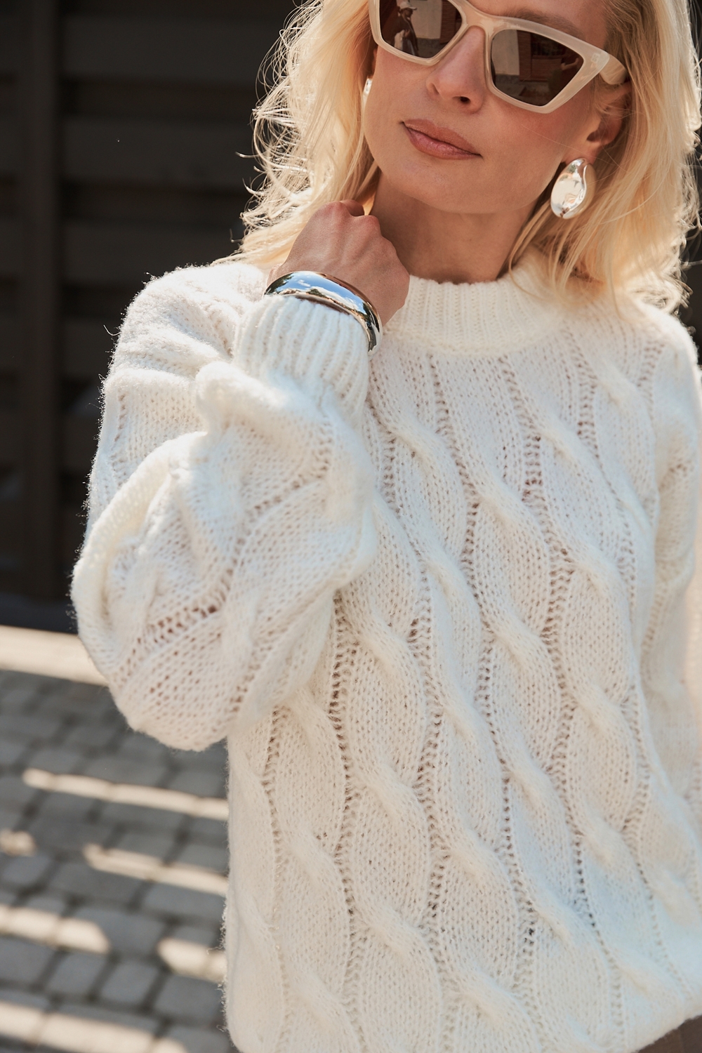 Теплий об'ємний светр із класичним візерунком "косами". Виготовлений напівпрозорим плетінням із ніжної, м'якої пряжі з додаванням шерсті мериноса та кідмохеру. Опущена лінія плеча, вільний силует додають зручності.