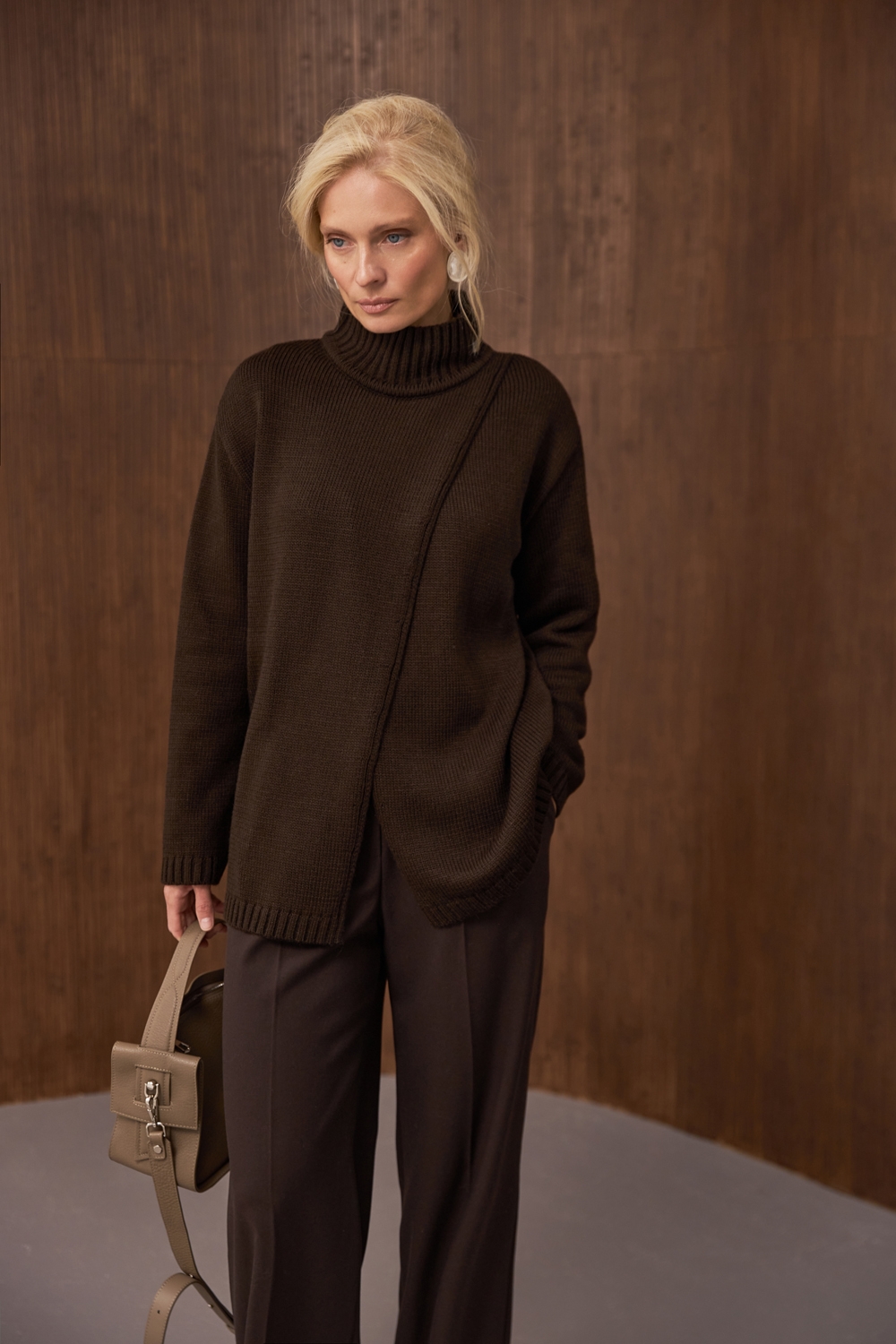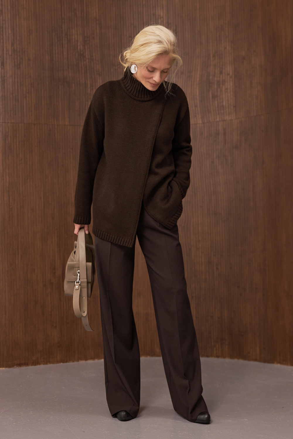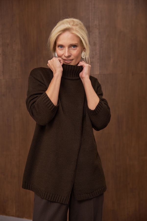Оригінальний светр прямого вільного силуету на запах. Виготовлений із напіввовняної пряжі стабільним плетінням середньої щільності. Комір-стійка ніжно огортає шию. Опущена лінія плеча та розслаблені манжети на рукавах додають комфорту.